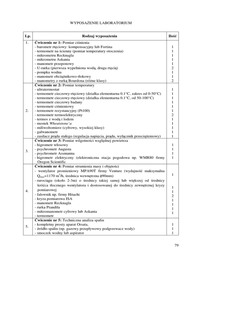 WYPOSAENIE LABORATORIUM Lp. Rodzaj wyposaenia 1. wiczenie nr 1: Pomiar cinienia - barometr rtciowy: kompensacyjny lub Fortina - termometr na cienny (pomiar temperatury otoczenia) - mikrometru Recknagla - mikrometru Askania - manometr przeponowy - U-rurka (pierwsza wypełniona wod, druga rtci) - pompka wodna - manometr obcinikowo-tłokowy - manometry z rurk Bourdona (róne klasy) wiczenie nr 2: Pomiar temperatury - ultratermostat - termometr cieczowy-rtciowy (działka elementarna 0.1°C, zakres od 0-50°C) - termometr cieczowy-rtciowy (działka elementarna 0.1°C, od 50-100°C) - termometr cieczowy badany - termometr cinieniowy - termometr rezystancyjny (Pt100) - termometr termoelektryczny - termos z wod i lodem - mostek Wheatstone’a - miliwoltomierz (cyfrowy, wysokiej klasy) - galwanometr - zasilacz prdu stałego (regulacja napicia, prdu, wyłcznik przecieniowy) wiczenie nr 3: Pomiar wilgotnoci wzgldnej powietrza - higrometr włosowy - psychrometr Augusta - psychrometr Assmanna - higrometr elektryczny (elektroniczna stacja pogodowa np. WMR80 firmy Oregon Scientific wiczenie nr 4: Pomiar strumienia masy i objtoci - wentylator promieniowy MPA90T firmy Venture (wydajno maksymalna Qmax=1170 m3/h, rednica wewntrzna φ90mm) - rurocigu (około 2-3m) o rednicy takiej samej lub wikszej od rednicy króca tłocznego wentylatora i dostosowanej do rednicy zewntrznej kryzy pomiarowej - falownik np. firmy Hitachi - kryza pomiarowa ISA - manometr Recknagla - rurka Prandtla - mikromanometr cyfrowy lub Askania - termometr wiczenie nr 5: Techniczna analiza spalin - kompletny prosty aparat Orsata, - ródło spalin (np. gazowy przepływowy podgrzewacz wody) - smoczek wodny lub aspirator 2. 3. 4. 5. Ilo 1 1 1 1 1 2 1 1 2 1 1 1 1 1 1 2 1 1 1 1 1 1 1 1 1 1 1 1 2 1 1 1 1 1 1 1 79 wiczenie nr 6: Oznaczanie ciepła spalania i wartoci opałowej paliwa stałego za pomoc bomby kalorymetrycznej - zestaw kalorymetryczny zwykły - butla z tlenem (reduktor manometr zawór) - przewody podłczeniowe - waga laboratoryjna o dokładnoci 0.0002g - waga laboratoryjna o dokładnoci 0.2g - modzierz do rozdrabniania paliwa (wgla) – gdyby nie było w zestawie - prasa do wykonywania brykiecików – gdyby nie było w zestawie - filtr z chlorkiem wapnia wiczenie nr 7: Pomiary współczynnika przewodnoci cieplnej - kompletny aparat jednopłytowy np. Bocka lub Poensgena - termostat (ultratermostat) chłodzcy - termostat (ultratermostat) grzewczy - przewody łczce aparat z termostatami - termometry rtciowe mierzce temperatur na wejciu i wyjciu do grzejnika pomocniczego i chłodnicy - przewody do podłczenia termopar z przełcznikiem - przełcznik - woltomierz cyfrowy (klasa 0.2zakres 0÷15V, 0÷30V) - amperomierz cyfrowy (klasa 0.2; zakres 0÷0.5A) - autotransformator - stabilizator - badana próbka 6. 7. 1 1 1 1 1 1 1 1 1 1 4 4 6 1 2 1 1 1 1 WYKAZ MATERIAŁÓW DO DZIAŁALNOCI LABORATORIUM PRZEZ 1 ROK Lp. Ilo 1. rt do U-rurki, barometru (jednorazowo) 5-10 cm3 2. lód (kostki ok. 8-10cm3) 100 cm3 3. nie potrzeba 4. nie potrzeba 5. 6. 7. 80 Rodzaj materiałów ług potasowy roztwór alkaliczny pirogalolu roztwór chlorku miedziawego paliwo (wgiel w postaci miału) butla z tlenem nitka bawełniana drucik chromonikielinowy filtr z chlorkiem wapnia, kwas benzoesowy nie potrzeba 50 cm3 50 cm3 50 cm3 5g 1 szt 15 cm 15 cm 1 szt 5g
