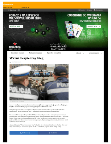 cjg.gazeta.pl 29-07-2014 Strona: 1 Gazeta.pl Poczta Radio Zaloguj się KATOWICE Kalendarz imprez Polecane miejsca Bywalec o mieście Wrzuć bezpieczny bieg aga 29.07.2014 18:45 DAWID CHALIMONIUK Jazda w trudnych warunkach na symulatorze rajdowym czy prezentacja sprzętu policyjnego to tylko niektóre atrakcje, jakie czekają na gości CH Auchan Żory. W najbliższy weekend (2 i 3 sierpnia) odbędzie się tam bowiem jedno z pierwszych spotkań w ramach akcji "Wrzuć bezpieczny bieg", promującej bezpieczne zachowania na drodze. Na uczestników akcji czeka symulator WRC, w którym będzie można zmierzyć się z zawrotnymi prędkościami oraz spotkania z ekspertami do spraw bezpieczeństwa na drodze. Policjanci z Wydziału Ruchu Drogowego wytłumaczą każdemu, jak ważne jest dostosowanie prędkości do warunków jazdy, a także prawidłowe zachowanie wobec pieszych. Zaprezentują także sprzęt, jakim na co dzień wykonują swoje obowiązki. Akcja edukacyjna "Wrzuć bezpieczny bieg" odbędzie się w Centrum Handlowym Auchan Żory przy ulicy Francuskiej 11 w sobotę w godz. 11-18, a w niedzielę w godz.11-17. Wstęp wolny. Skomentuj Podziel się więcej zmień miasto cjg.gazeta.pl 29-07-2014 Strona: 2 Na skróty: Gazeta.pl Wiadomości Sport.pl Polecamy: Miasta Wpadki Policja Copyright (c) Agora SA O nas Biznes Gazeta Wyborcza Praca Program TV Program TV Pogoda Staże u nas Reklama Tematy Wideo Prywatność Wyniki Lotto Wszystkie artykuły Licencje/Kontent Poleć stronę Poczta Zgłoś błąd Newsletter