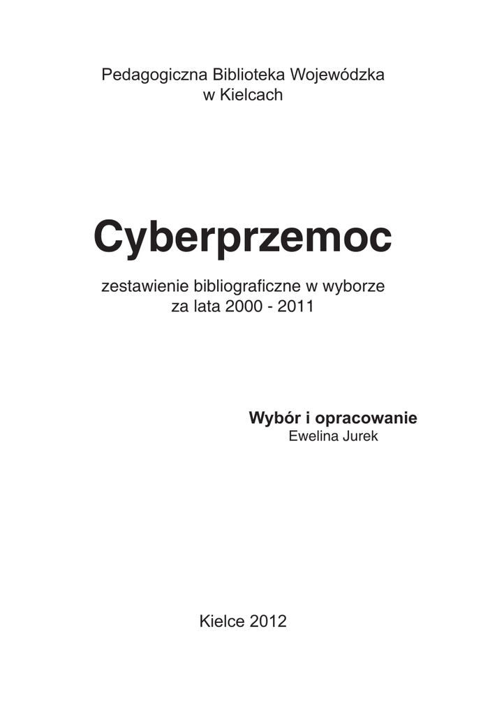 Pedagogiczna Biblioteka Wojewódzka w Kielcach Cyberprzemoc zestawienie bibliograficzne w wyborze za lata 2000 - 2011 Wybór i opracowanie Ewelina Jurek Kielce 2012 Korekta Małgorzata Pronobis Redakcja techniczna opracowanie graficzne i skład komputerowy Robert Kardas Wydawca: Pedagogiczna Biblioteka Wojewódzka w Kielcach, ul. Jana Pawła II 5, 25-025 Kielce e-mail: [email protected] www.pbw.kielce.pl Wstęp Zestawienie bibliograficzne zawiera wybraną literaturę związaną z cyberprzemocą wśród dzieci i młodzieży, a także wśród dorosłych (m.in. cyberbullying – mobbing elektroniczy, stalking, flaming i trolling). Wykaz został sporządzony w oparciu o zbiory znajdujące się w katalogach i kartotekach Pedagogicznej Biblioteki Wojewódzkiej – Filia w Skarżysku-Kamiennej i zawiera 30 pozycji. Całość materiału podzielono na dwie części, wydawnictwa zwarte i wydawnictwa ciągłe, w obrębie których zastosowano układ alfabetyczny. W przypadku wydawnictw zwartych podano sygnaturę Czytelni i Wypożyczalni skarżyskiej Filii Pedagogicznej Biblioteki Wojewódzkiej, natomiast wydawnictwa ciągłe znajdują się tylko w Czytelni Pedagogicznej Biblioteki Wojewódzkiej – Filia Skarżysko-Kamienna i w tym przypadku sygnatura miejsca nie została podana. Wydawnictwa zwarte 1. Andrzejewska, Anna : Dlaczego cyberbullying wśród młodzieży jest niebezpieczny? // W: Systemowe rozwiązywanie problemu przemocy i agresji w szkole : praca zbiorowa / pod red. Andrzeja Rejznera. – Warszawa : Wydawnictwo Wyższej Szkoły Pedagogicznej TWP : Wydawnictwo „Comandor”, 2011. – S. 177-178 Sygn. 36560 Wypożyczalnia 2. Bałandynowicz, Andrzej : Agresja i przemoc w środkach masowego przekazu jako współczesne oblicze patologii społecznej // W: Oblicza patologii społecznych / red. nauk. Sylwester Bębas. – Radom : Wyższa Szkoła Handlowa, 2011. – S. 13-39 Sygn. 36551 Wypożyczalnia 3. Bednarek, Józef : Cyberagresja nowym i groźnym patologicznym procesem // W: Systemowe rozwiązywanie problemu przemocy i agresji w szkole : praca zbiorowa / pod red. Andrzeja Rejznera. – Warszawa : Wydawnictwo Wyższej Szkoły Pedagogicznej TWP ; Wydawnictwo „Comandor”, 2011. – S. 167-176 Sygn. 36560 Wypożyczalnia 4. Hołyst, Brunon : Socjologia kryminalistyczna. T. 1 / Brunon Hołyst. – Warszawa : „Lexis Nexis”, 2007. – S. 1017-1034 : Cybernetyczne prześladowanie i molestowanie ofiar oraz typologia stalkingu Sygn. 35549 Wypożyczalnia 5 5. Hołyst, Brunon : Socjologia kryminalistyczna. T. 2 / Brunon Hołyst. – Warszawa : „Lexis Nexis”, 2007. – S. 487-500 : Zapobieganie cybernetycznemu molestowaniu. Rola ofiar i policji. Sygn. 35550 Wypożyczalnia 6. Kozak, Stanisław : Patologie komunikowania w Internecie : zagrożenia i skutki dla dzieci i młodzieży / Stanisław Kozak. – Warszawa : „Difin”, 2011. – S. 156-212 : Dzieci i młodzież jako ofiary cyberprzestępczego wykorzystywania przez dorosłych w Internecie. Sygn. 36507 Czytelnia 7. Sarzała, Dariusz : Cyberprzestrzeń jako źródło zagrożeń procesu socjalizacji i wychowania // W: Pedagogika społeczna wobec problemów współczesnej młodzieży : polska pedagogika społeczna na początku XXI wieku / red. nauk. Bożena Chrostowska, Ewa Kantowicz, Cezary Kurkowski. – Toruń : „Akapit”, 2010. – S. 212-225 Sygn. 36553 Wypożyczalnia 8. Sareło, Zbigniew : Media w służbie osoby : etyka społecznego komunikowania. – Toruń : Wydawnictwo Adam Marszałek, 2000. – S. 172174 : Granice wolności słowa w Internecie. Sygn. 34958 Wypożyczalnia 9. Siemieniecki, Bronisław : Pedagogika medialna : podręcznik akademicki. [T.] 1 / red. nauk. Bronisław Siemieniecki. – Warszawa : Wydawnictwo Naukowe PWN, 2007. – S. 204-233 : Media w służbie osoby : etyka społecznego komunikowania. Sygn. 35569 Czytelnia Sygn. 35570, 35713, 35714 Wypożyczalnia 10. Zieja, Andrzej : „Cyberprzemoc” jako zagrożenie dla współczesnej młodzieży – w kontekście adolescencji norm społecznych // W: Młodzież a patologie i zagrożenia społeczne / pod red. Ireny Pufal-Struzik. – Kielce : Wszechnica Świętokrzyska, 2011. – S. 73-81 Sygn. 36567, 36568 Wypożyczalnia Wydawnictwa ciągłe 11. Barlińska, Julia : Cyberprzestrzeń – nowa arena przemocy rówieśniczej? / Julia Barlińska // „Kwartalnik Pedagogiczny”. – 2009, nr 4, s. 53-66 12. Cyberbullying (mobbing elektroniczny) wśród uczniów szkół podstawowych / Claire Monks, Susanne Robinson, Penny Worlidge, Rosario Ortega // „Kwartalnik Pedagogiczny”. – 2009, nr 4, s. 167-181 13. Duda, Beata : Żadnych ograniczeń w cyberprzestrzeni? : zajęcia dla uczniów gimnazjum / Beata Duda // „Biblioteka w Szkole”. – 2008, nr 7/8, dod. „Biblioteka : centrum informacji”, nr 1, s. 24 14. Hanuliakova, Jana : Szykanowanie elektroniczne i jego wpływ na atmosferę klasy / Jana Hanuliakova, Katarina Holla // „Wszystko dla Szkoły”. – 2010, nr 5, s. 7-8 15. Knol, Kamila : Agresja elektroniczna – nowe wyzwania / Kamila Knol // „Remedium”. – 2010, nr 2, s. 30-31 16. Konieczniak, Marek : Poszukiwanie tożsamości w cyberprzestrzeni : implikacje pedagogiczne / Marek Konieczniak // „Edukacja i Dialog”. – 2011, nr 5/6, s. 9-19 17. Krajewska, Małgorzata : Cyberprzemoc w kontaktach rówieśniczych / Małgorzata Krajewska // „Opieka, Wychowanie, Terapia”. – 2010, [nr] 1/2, s. [12]-19 7 18. Kułak, Maciej : Złapani w sieć / Maciej Kułak // „Głos Nauczycielski”. – 2009, nr 5, s. 11 19. Łuszczyna, Marek : Uwaga na cyberprzemoc / Marek Łuszczyna // „Cogito”. – 2007, nr 22, s. [10]-[12] 20. Marczewska, Elżbieta : Media elektroniczne a przemoc wśród młodzieży / Elżbieta Marczewska // „Problemy Opiekuńczo-Wychowawcze”. – 2010, nr 5, s. 51-55 21. Pyżalski, Jacek : Agresja elektroniczna : wirtualne ciosy, realne rany. Cz. 1 / Jacek Pyżalski // „Remedium”. – 2008, nr 9, s. 26-27 22. Pyżalski, Jacek : 