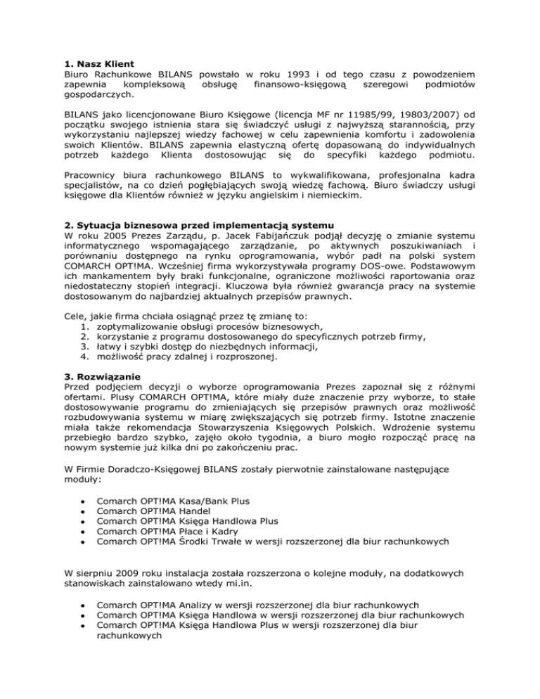 1. Nasz Klient Biuro Rachunkowe BILANS powstało w roku 1993 i od tego czasu z powodzeniem zapewnia kompleksową obsługę finansowo-księgową szeregowi podmiotów gospodarczych. BILANS jako licencjonowane Biuro Księgowe (licencja MF nr 11985/99, 19803/2007) od początku swojego istnienia stara się świadczyć usługi z najwyższą starannością, przy wykorzystaniu najlepszej wiedzy fachowej w celu zapewnienia komfortu i zadowolenia swoich Klientów. BILANS zapewnia elastyczną ofertę dopasowaną do indywidualnych potrzeb każdego Klienta dostosowując się do specyfiki każdego podmiotu. Pracownicy biura rachunkowego BILANS to wykwalifikowana, profesjonalna kadra specjalistów, na co dzień pogłębiających swoją wiedzę fachową. Biuro świadczy usługi księgowe dla Klientów również w języku angielskim i niemieckim. 2. Sytuacja biznesowa przed implementacją systemu W roku 2005 Prezes Zarządu, p. Jacek Fabijańczuk podjął decyzję o zmianie systemu informatycznego wspomagającego zarządzanie, po aktywnych poszukiwaniach i porównaniu dostępnego na rynku oprogramowania, wybór padł na polski system COMARCH OPT!MA. Wcześniej firma wykorzystywała programy DOS-owe. Podstawowym ich mankamentem były braki funkcjonalne, ograniczone możliwości raportowania oraz niedostateczny stopień integracji. Kluczowa była również gwarancja pracy na systemie dostosowanym do najbardziej aktualnych przepisów prawnych. Cele, jakie firma chciała osiągnąć przez tę zmianę to: 1. zoptymalizowanie obsługi procesów biznesowych, 2. korzystanie z programu dostosowanego do specyficznych potrzeb firmy, 3. łatwy i szybki dostęp do niezbędnych informacji, 4. możliwość pracy zdalnej i rozproszonej. 3. Rozwiązanie Przed podjęciem decyzji o wyborze oprogramowania Prezes zapoznał się z różnymi ofertami. Plusy COMARCH OPT!MA, które miały duże znaczenie przy wyborze, to stałe dostosowywanie programu do zmieniających się przepisów prawnych oraz możliwość rozbudowywania systemu w miarę zwiększających się potrzeb firmy. Istotne znaczenie miała także rekomendacja Stowarzyszenia Księgowych Polskich. Wdrożenie systemu przebiegło bardzo szybko, zajęło około tygodnia, a biuro mogło rozpocząć pracę na nowym systemie już kilka dni po zakończeniu prac. W Firmie Doradczo-Księgowej BILANS zostały pierwotnie zainstalowane następujące moduły: Comarch Comarch Comarch Comarch Comarch OPT!MA OPT!MA OPT!MA OPT!MA OPT!MA Kasa/Bank Plus Handel Księga Handlowa Plus Płace i Kadry Środki Trwałe w wersji rozszerzonej dla biur rachunkowych W sierpniu 2009 roku instalacja została rozszerzona o kolejne moduły, na dodatkowych stanowiskach zainstalowano wtedy mi.in. Comarch OPT!MA Analizy w wersji rozszerzonej dla biur rachunkowych Comarch OPT!MA Księga Handlowa w wersji rozszerzonej dla biur rachunkowych Comarch OPT!MA Księga Handlowa Plus w wersji rozszerzonej dla biur rachunkowych Comarch Comarch Comarch Comarch Comarch Comarch OPT!MA OPT!MA OPT!MA OPT!MA OPT!MA OPT!MA Księga Podatkowa w wersji rozszerzonej dla biur rachunkowych Płace i Kadry w wersji rozszerzonej dla biur rachunkowych Faktury CRM Handel Biuro Rachunkowe 4. Uzyskane Korzyści Wdrożenie zintegrowanego systemu COMARCH OPTIMA pozwoliło osiągnąć kluczowe dla firmy cele, które Prezes wyznaczył przed podjęciem decyzji o zmianie ówczesnego i zakupie nowego programu. Główne korzyści płynące z tej zmiany to objęcie wszystkich procesów w firmie jednolitym systemem, łatwy i szybki dostęp do potrzebnych informacji oraz pełna automatyzacja obsługi Klientów biura. Wdrożenie przyniosło wiele usprawnień pracy biura: poprzez wykorzystanie definiowanych schematów księgowych proces księgowania dokumentów uległ znacznemu uproszczeniu, a jego czas zmalał o 50%. Dzięki zastosowaniu preliminarza płatności firma uzyskała pełną kontrolę zobowiązań i należności poprzez dostęp do przejrzystych informacji o stanie rozliczeń z kontrahentami. Ponadto system automatycznie wylicza różnice kursowe (poprzednio trzeba było robić to ręcznie) natomiast przy fakturach gotówkowych automatycznie generuje zapis kasowy; wszystkie te udogodnienia zmniejszyły czas potrzebny do wykonania tych czynności o co najmniej 30%. Dużym udogodnieniem jest też przekazywanie faktur przez Klientów biura w formie wygodnych plików dzięki użyciu opcji eksportu. Stosowanie oprogramowania COMARCH OPT!MA przyczynia się to do stałego wzrostu jakości obsługi Klientów, co dla firmy Bilans jest bardzo istotne. 5. Dlaczego Comarch „Wdrożenie systemu pozwoliło nam na zwiększenie przejrzystości informacji finansowoksięgowych, zwiększyły się możliwości raportowania i analiz, co skutkuje podniesieniem efektywności działań firmy. Rekomendujemy program COMARCH OPT!MA jako nowoczesne narzędzie usprawniające pracę biura rachunkowego”. Jacek Fabijańczuk Prezes Zarządu Dane Klienta: Dane Partnera: BILANS Firma Doradczo-Księgowa sp. z o.o. ul. Rolna 195, 02-729 Warszawa Software Solutions Ul. Koński Jar 10/16 02-785 Warszawa Tel. (22) 212 86 27-29 www.bilans.eu Tel. 22 880 95 95 www.softsol.com.pl