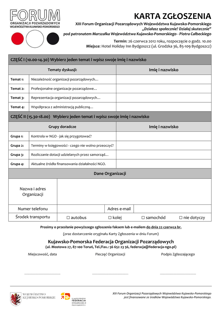 KARTA ZGŁOSZENIA XIII Forum Organizacji Pozarządowych Województwa Kujawsko-Pomorskiego „Działasz społecznie? Działaj skutecznie” pod patronatem Marszałka Województwa Kujawsko-Pomorskiego - Piotra Całbeckiego Termin: 26 czerwca 2012 roku, rozpoczęcie o godz. 10.00 Miejsce: Hotel Holiday Inn Bydgoszcz (ul. Grodzka 36, 85-109 Bydgoszcz) CZĘŚĆ I (10.00-14.30) Wybierz jeden temat i wpisz swoje imię i nazwisko Imię i nazwisko Tematy dyskusji: Temat 1: Niezależność organizacji pozarządowych… Temat 2: Profesjonalne organizacje pozarządowe… Temat 3: Reprezentacja organizacji pozarządowych… Temat 4: Współpraca z administracją publiczną… CZĘŚĆ II (15.30-18.00) Wybierz jeden temat i wpisz swoje imię i nazwisko Imię i nazwisko Grupy doradcze Grupa 1: Kontrola w NGO - jak się przygotować? Grupa 2: Terminy w księgowości - czego nie wolno przeoczyć? Grupa 3: Rozliczanie dotacji udzielanych przez samorząd… Grupa 4: Aktualne źródła finansowania działalności NGO. Dane Organizacji Nazwa i adres Organizacji Numer telefonu Adres e-mail Środek transportu □ autobus □ kolej □ samochód □ nie dotyczy Prosimy o przesłanie powyższego zgłoszenia faksem lub e-mailem do dnia 22 czerwca br. (oraz dostarczenie oryginału Karty Zgłoszenia w dniu Forum) Kujawsko-Pomorska Federacja Organizacji Pozarządowych (ul. Mostowa 27, 87-100 Toruń, Tel./Fax.: 56 652 23 56, [email protected]) Miejscowość, data Pieczęć Organizacji Podpis Zgłaszającego ................................................................ ................................................................ ................................................................ XIII Forum Organizacji Pozarządowych Województwa Kujawsko-Pomorskiego jest finansowane ze środków Województwa Kujawsko-Pomorskiego.
