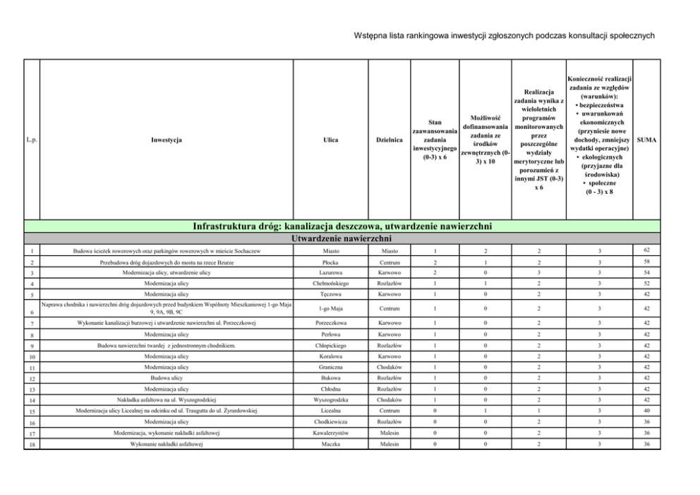 Wstępna lista rankingowa inwestycji zgłoszonych podczas konsultacji społecznych L.p. Inwestycja Ulica Dzielnica Realizacja zadania wynika z wieloletnich Możliwość programów Stan dofinansowania monitorowanych zaawansowania zadania ze przez zadania środków poszczególne inwestycyjnego zewnętrznych (0wydziały (0-3) x 6 3) x 10 merytoryczne lub porozumień z innymi JST (0-3) x6 Konieczność realizacji zadania ze względów (warunków): • bezpieczeństwa • uwarunkowań ekonomicznych (przyniesie nowe dochody, zmniejszy SUMA wydatki operacyjne) • ekologicznych (przyjazne dla środowiska) • społeczne (0 - 3) x 8 Infrastruktura dróg: kanalizacja deszczowa, utwardzenie nawierzchni Utwardzenie nawierzchni 3 62 2 3 58 3 3 54 2 3 52 0 2 3 42 1 0 2 3 42 Karwowo 1 0 2 3 42 1 Budowa ścieżek rowerowych oraz parkingów rowerowych w mieście Sochaczew 2 Przebudowa dróg dojazdowych do mostu na rzece Bzurze Płocka Centrum 2 1 3 Modernizacja ulicy, utwardzenie ulicy Lazurowa Karwowo 2 0 4 Modernizacja ulicy Chełmońskiego Rozlazłów 1 1 5 Modernizacja ulicy Tęczowa Karwowo 1 6 Naprawa chodnika i nawierzchni dróg dojazdowych przed budynkiem Wspólnoty Mieszkaniowej 1-go Maja 9, 9A, 9B, 9C 1-go Maja Centrum 7 Wykonanie kanalizacji burzowej i utwardzenie nawierzchni ul. Porzeczkowej Porzeczkowa Miasto Miasto 1 2 2 8 Modernizacja ulicy Perłowa Karwowo 1 0 2 3 42 9 Budowa nawierzchni twardej z jednostronnym chodnikiem. Chłopickiego Rozlazłów 1 0 2 3 42 10 Modernizacja ulicy Koralowa Karwowo 1 0 2 3 42 11 Modernizacja ulicy Graniczna Chodaków 1 0 2 3 42 12 Budowa ulicy Bukowa Rozlazłów 1 0 2 3 42 13 Modernizacja ulicy Chłodna Rozlazłów 1 0 2 3 42 14 Nakładka asfaltowa na ul. Wyszogrodzkiej Wyszogrodzka Chodaków 1 0 2 3 42 15 Modernizacja ulicy Licealnej na odcinku od ul. Traugutta do ul. Żyrardowskiej Licealna Centrum 0 1 1 3 40 16 Modernizacja ulicy Chodkiewicza Rozlazłów 0 0 2 3 36 17 Modernizacja, wykonanie nakładki asfaltowej Kawalerzystów Malesin 0 0 2 3 36 18 Wykonanie nakładki asfaltowej Maczka Malesin 0 0 2 3 36 Wstępna lista rankingowa inwestycji zgłoszonych podczas konsultacji społecznych 19 Modernizacja ulicy Bohaterów Chodakowa Chodaków 1 0 1 3 36 20 Stworzenie nowych miejsc parkingowych w mieście Sochaczew miasto Miasto 0 0 2 3 36 21 Budowa ulicy Jesionowa Rozlazłów 1 0 2 2 34 22 Nakładka asfaltowa na ul. Kolejowej Kolejowa Chodaków 1 0 2 2 34 23 Modernizacja ulicy Radiowa Karwowo 1 0 2 2 34 24 Modernizacja ulicy utwardzenie nawierzchni Bortnowskiego Malesin 1 0 2 2 34 25 Modernizacja ulicy Ułanów Jazłowieckich Centrum 0 0 3 2 34 Rowerowy Szlak Chopinowski Sochaczew-Puszcza Kampinoska-Żelazowa Wola Miasto 1 0 2 2 34 27 Budowa przeprawy mostowej na rzece Bzurze miasto Miasto 1 0 2 2 34 28 Droga Północ-Południe wraz z dokumentacją Droga Północ-Południe Miasto 1 0 2 2 34 Poprawa stanu dróg na terenie dawnego Chemitexu tj. ul. Chemiczna, Włókiennicza, Wiskozowa Chemitex Chodaków 0 1 1 2 32 26 29 30 Wykonanie chodnika Licealna Centrum 0 1 1 2 32 31 Przedłuzenie ulicy Kwiatkowskiego w Sochaczewie Kwiatkowskiego Centrum 0 0 2 2 28 32 Przebudowa skrzyżowania Kochanowskiego/ Polna Centrum 0 0 2 2 28 33 Remont ulicy Żwirki i Wigury w Sochaczewie Żwirki i Wigury Boryszew 0 0 2 2 28 Przebudowa ulicy Hanki Sawickiej wraz z budową miejsc postojowych i parkingowych obsługujących Hanki Sawickiej Centrum 0 0 2 2 28 Naprawa nawierzchni parkingu przed budynkiem przedpogrzebowym Trojanowska Trojanów 0 0 1 2 22 36 Położenie dywanika asfaltowego na ul. Działkowej Działkowa Chodaków 0 0 1 2 22 37 Wykonanie utwardzonego dojazdu wraz z chodnikami i oświetleniem na odcinku ul. Warzywnej i od ul. Chopina do bloku nr 8 i nr 10 Warzywna, Chopina Chodaków 0 0 1 2 22 38 Infrastruktura komunikacyjno drogowa na osiedlu zlokalizowanym pomiędzy ulicą Graniczną Graniczna Chodaków 0 0 1 2 22 39 Budowa miejsc postojowych na ulicy Konstytucji 3-go Maja Konstytuacji 3-go Maja Centrum 0 0 1 2 22 40 Parking wzdłuż południowej pierzei ulicy Pokoju Pokoju Centrum 0 0 1 2 22 41 Wykonanie wjazdu i wyjazdu dla mieszkańców Żeromskiego 20 Al. 600 lecia 23 i 23A oraz 38 użytkowników garaży Żeromskiego Centrum 0 0 1 2 22 42 Modernizacja ulicy Popiela Chodaków 0 0 1 2 22 43 Modernizacja ulicy Sikorskiego Chodaków 0 0 1 2 22 44 Budowa zjazdu ul. 15 sierpnia na ul. Stefana Roweckiego 15 Sierpnia Boryszew 0 0 1 2 22 45 Modernizacja ulicy Kopernika Boryszew 0 0 1 2 22 46 Modernizacja ulicy Toruńska Centrum 0 0 1 2 22 47 Wykonanie nawierzchni bitumicznej i jednostronnego chodnika ul. Jaworowa Jaworowa Karwowo 0 0 1 2 22 48 Modernizacja ulicy Kasztanowa Karwowo 0 0 1 2 22 49 Modernizacja ulicy Krakowska Boryszew 0 0 1 2 22 50 Modernizacja ulicy Topolowa Chodaków 0 0 1 2 22 51 Modernizacja ulicy Warzywna Chodaków 0 0 1 2 22 34 35 Wstępna lista rankingowa inwestycji zgłoszonych podczas konsultacji społecznych 52 Modernizacja ulicy Zwierzyniecka Chodaków 0 0 1 2 22 53 Parking taksówek Żeromskiego Centrum 0 0 1 2 22 54 Modernizacja ulicy Żołnierska Trojanów 0 0 1 2 22 55 Utwardzenie drogi Żwirowa Chodaków 0 0 1 2 22 Wybudowanie drogi dojazdowej do nieruchomości Topolowa 10, działka N/976/32 w obrębie geodezyjnym Chodaków - po jej wyznaczeniu Topolowa Chodaków 0 0 1 2 22 56 57 Wykonanie nakładki asfaltowej Sucharskiego Malesin 0 0 1 2 22 58 Modernizacja ulicy Czarnieckiego Rozlazłów 0 0 1 2 22 59 Wykonanie nawierzchni Daleka Boryszew 0 0 1 2 22 60 Utwardzenie nawierzchni Gwardyjska Boryszew 0 0 1 2 22 Wykonanie parkingu dla samochodów przy ul. Łuszczewskich koło zieleniaka w pobliżu ul. 15 Sierpnia. 15 Sierpnia Boryszew 0 0 1 2 22 61 62 Wykonanie nawierzchni Kmicica Boryszew 0 0 1 2 22 63 Wykonanie nakładki asfaltowej na trylince w ulicy Jerzego Popiełuszki Jerzego Popiełuszki Centrum 0 0 1 2 22 64 Budowa infrastruktury Małachowskiego Chodaków 0 0 1 2 22 65 Budowa ulicy Niepodległości Chodaków 0 0 1 2 22 66 Wykonanie nawierzchni