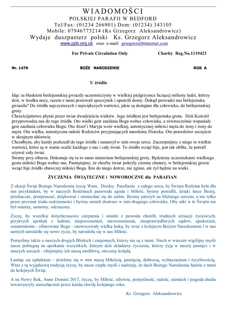 WIADOMOŚCI POLSKIEJ PARAFII W BEDFORD Tel/Fax: (01234 266901) Dom: (01234) 343105 Mobile: 07946773214 (Ks Grzegorz Aleksandrowicz) Wydaje duszpasterz polski Ks. Grzegorz Aleksandrowicz www.ppb.org.uk oraz e-mail: [email protected] For Private Circulation Only Nr. 1476 Charity Reg.No.1119423 BOŻE NARODZENIE ROK A U źródła Idąc za blaskiem betlejemskiej gwiazdy uczestniczymy w wielkiej pielgrzymce liczącej miliony ludzi, którzy dziś, w środku nocy, razem z nami przerwali spoczynek i opuścili domy. Dokąd prowadzi nas betlejemska gwiazda? Do źródła najczystszych i największych wartości, jakie są dostępne dla człowieka, do betlejemskiej groty. Chrześcijaństwo płynie przez świat dwadzieścia wieków. Jego źródłem jest betlejemska grota. Dziś Kościół przyprowadza nas do tego źródła. Oto wielki gest zaufania Boga wobec człowieka, a równocześnie wspaniały gest zaufania człowieka Bogu. Oto Józef i Maryja wzór wielkiej, autentycznej miłości męża do żony i żony do męża. Oto wielka, autentyczna radość Rodziców przyjmujących narodziny Dziecka. Oto prawdziwe szczęście w skrajnym ubóstwie. Chciałbym, aby każdy podszedł do tego źródła i zanurzył w nim swoje serce. Zaczerpnijmy z niego te wielkie wartości, które są w stanie ocalić każdego z nas i cały świat. To źródło wciąż bije, jest tak obfite, że potrafi ożywić cały świat. Stoimy przy ołtarzu. Dokonuje się tu to samo misterium betlejemskiej groty. Będziemy uczestnikami wielkiego gestu miłości Boga wobec nas. Pamiętajmy, że choćby świat pokryły ciemne chmury, w betlejemskiej grocie wciąż bije źródło zbawczej miłości Boga. Kto do niego dotrze, nie zginie, ale żył będzie na wieki. ŻYCZENIA ŚWIĄTECZNE i NOWOROCZNE dla PARAFIAN Z okazji Świąt Bożego Narodzenia życzę Wam, Drodzy Parafianie z całego serca, by Święta Rodzina była dla nas przykładem, by w naszych Rodzinach panowała zgoda i Miłość, byśmy potrafili, dzięki łasce Bożej, przebaczać, przepraszać, dziękować i uśmiechać się do siebie. Byśmy patrzyli na bliźniego sercem, a nie tylko przez pryzmat trudu codzienności i byśmy umieli dostrzec w nim drugiego człowieka. Oby nikt w te Święta nie był smutny, samotny, odrzucony. Życzę, by wszelkie dotychczasowe cierpienia i smutki z powodu chorób, trudnych sytuacji życiowych, przykrych spotkań z ludźmi, nieporozumień, niezrozumienia, niesprawiedliwych sądów, upokorzeń, osamotnienia - ofiarowane Bogu - zaowocowały wielką łaską, by wraz z kolejnym Bożym Narodzeniem i w nas samych narodziło się nowe życie, by narodziła się w nas Miłość. Pomyślmy także o naszych drogich Bliskich i znajomych, którzy nie są z nami. Niech w wieczór wigilijny myśli nasze pobiegną na spotkanie wszystkich, którym dziś składamy życzenia, którzy żyją w naszej pamięci i w naszych sercach - obejmijmy ich naszą modlitwą, otoczmy kolędą. Łamiąc się opłatkiem – dzielimy się w nim naszą Miłością, pamięcią, dobrocią, wybaczaniem i życzliwością. Wraz z tą wyjątkową tradycją życzę, by nasze ciepłe myśli i nadzieję, że duch Bożego Narodzenia będzie z nami do kolejnych Świąt. A na Nowy Rok, Anno Domini 2017, życzę, by Miłość, zdrowie, pomyślność, radość, uśmiech i pogoda ducha towarzyszyły nierozłącznie przez każdą chwilę kolejnego roku. Ks Grzegorz Aleksandrowicz Sobota, 24.12.2016 Godz.24.00 - PASTERKA - W intencji parafian. BOŻE NARODZENIE Niedziela,25.12.2016 Godz. 9.30 - W intencji parafian. Godz.11.00 - W intencji parafian. Godz.19.00 - za dusze ś.p. Janiny Miniewskiej - int. rodziny. Poniedziałek, 26.12.2016 - UROCZYSTOŚĆ ŚWIĘTEGO SZCZEPANA - drugi dzień świąt. Godz. 9.30 O zdrowie i błog. Boże dla Marka Wodeckiego z ok.5-tych urodzin - int. rodziców. Godz.11.00 za ś.p.Stanisława i Haliny Jasińskich w 4-tą rocznicę śmierci– int. syna z rodziną. Godz.19.00 - za dusze ś.p. Janiny Miniewskiej - int. rodziny. Wtorek, 27.12.2016 Godz. 9.30 - za dusze ś.p. Janiny Miniewskiej - int. rodziny. Św. Jana Apostoła Godz.19.00 - O łaskę wiary dla John Allan za wst. św.Jana Apostoła– int. Pani Ewy Allan. Środa, 28.12.2016 Godz. 9.30 - za dusze ś.p. Janiny Miniewskiej - int. rodziny. Św.MłodzieniaszkówJana Godz.19.00 od - za dusze ś.p. rodziców Aliny i Edwarda Grochowskich - int. dzieci. Czwartek,29.12.2016 Godz. 9.30 - za dusze ś.p. Janiny Miniewskiej - int. rodziny. Św.Tomasza Becket Godz.19.00 - za dusze ś.p. Zbigniewa Błaszczyńskiego – int. kolegi Jacka z żoną i dziećmi Piątek, 30.12.2016 Godz.15.00 - za dusze ś.p. Pawła Ulanowskiego w rocznicę śmierci. UROCZYSTOŚĆ KORONKA DO MIŁOSIERDZIA BOŻEGO. Godz.19.00 - za dusze ś.p. Janiny Miniewskiej - int. rodziny. ŚW. RODZINY Sobota, 31.12.2016 Godz. 9.30 - za dusze ś.p. Janiny Miniewskiej - int. rodziny. Św. Sylwestra Godz.19.00 - W intencji dziękczynno - błagalanej za 2016 rok. NABOŻEŃSTWO DZIĘKCZYNNO - BŁAGALNE. Niedziela. 1.1.2017 UROCZYSTOŚĆ ŚWIĘTEJ BOŻEJ RODZICIELKI MARYI OGŁOSZENIA PARAFIALNE: 1. W tym tygodniu we wtorek 27 grudnia o godz.16.00 zapraszamy na PARAFIALNE SPOTKANIE OPŁATKOWE i wspólne kolędowanie do naszego kościoła w Bedford. 2. Porządek nabożeństw i Mszy św. w okresie świąt Bożego Narodzenia jest podana (jak powyżej). 3. W ostatni dzień roku w sobotę 31 grudnia o godz.19.00 zapraszam do naszego kościoła na Mszę świętą i Nabożeństwo dziękczynno - błagalne z wystawieniem Najświętszego Sakramentu. 4. W okresie miesiąca stycznia 2017 r. nie będzie Mszy świętych wieczornych (od poniedziałku do piątku). 5. Są jeszcze do nabycia kalendarze ścienne na 2017 rok w cenie Ł 1.50, Ł 2.00 i Ł 2.50 6. Z okazji Kolędy Parafialnej są również do nabycia komplety kolędowe w cenie Ł 5. 7. Jak zwykle są do nabycia: „Gość Niedzielny” w cenie Ł 2 i „Mały Gość Niedzielny” w cenie Ł 1.50 8. W dalszym ciągu prz