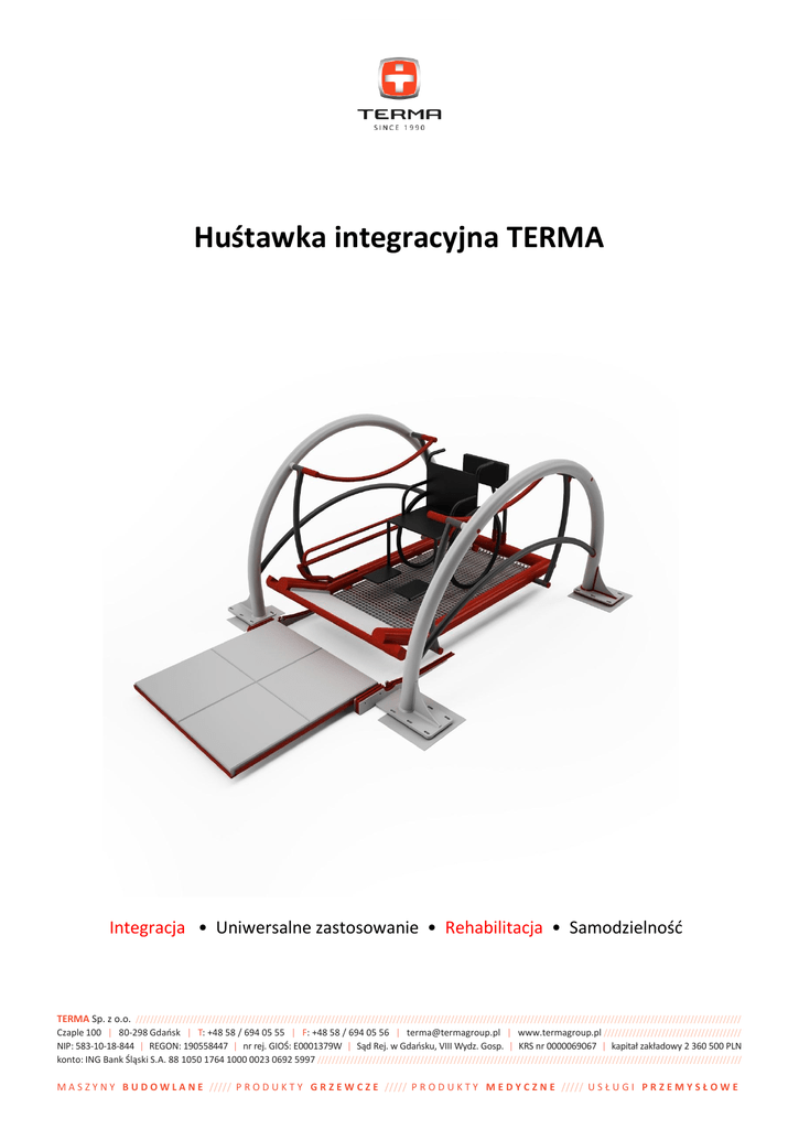 Huśtawka integracyjna TERMA Integracja • Uniwersalne zastosowanie • Rehabilitacja • Samodzielność TERMA Sp. z o.o. /////////////////////////////////////////////////////////////////////////////////////////////////////////////////////////////////////////////////////////////////////// Czaple 100 | 80-298 Gdańsk | T: +48 58 / 694 05 55 | F: +48 58 / 694 05 56 | [email protected] | www.termagroup.pl ////////////////////////////////////// NIP: 583-10-18-844 | REGON: 190558447 | nr rej. GIOŚ: E0001379W | Sąd Rej. w Gdańsku, VIII Wydz. Gosp. | KRS nr 0000069067 | kapitał zakładowy 2 360 500 PLN konto: ING Bank Śląski S.A. 88 1050 1764 1000 0023 0692 5997 /////////////////////////////////////////////////////////////////////////////////////////////////////////////////// M A S Z Y N Y B U D O W L A N E ///// P R O D U K T Y G R Z E W C Z E ///// P R O D U K T Y M E D Y C Z N E ///// U S Ł U G I P R Z E M Y S Ł O W E Kod produktu: WDHUS01 Przeznaczenie: Huśtawka integracyjna firmy TERMA dedykowana jest na place zabaw, siłownie zewnętrzne, do parków oraz przydomowych terenów zielonych w celu zapewnienia możliwości jednoczesnej zabawy osobom pełnosprawnym oraz użytkownikom na wózkach inwalidzkich. Huśtawka integracyjna występuje w zestawie z tablicą informacyjną, która musi znaleźć się z bezpośrednim sąsiedztwie zamontowanego urządzenia, w nieosłoniętym, dobrze widocznym dla użytkowników miejscu. Urządzenie przeznaczone jest do montażu na terenie siłowni zewnętrznych. W przypadku instalacji na terenie placu zabaw, urządzenie należy dodatkowo ogrodzić. Materiały: Konstrukcja: profile stalowe z podkładem epoksydowym + malowanie proszkowe. Platforma: kratownica stalowa ocynkowana, blacha aluminiowa ryflowana Oparcie: poliuretan Fundamenty: beton klasy min B-15 Tablica informacyjna: rama stalowa malowana proszkowo + tablica z plexi z nadrukiem UV Wymiary: Wymiary zewnętrzne urządzenia: 2210 mm x 1871 mm Wysokość urządzenia: ok. 1252 mm Wymiary platformy ruchomej: 1400 x 810 mm Odległość platformy od poziomu gruntu: 260 mm Wysokość swobodnego upadku: brak Wymiary strefy funkcjonalnej: 6213 mm x 4871 mm Głębokość fundamentowa: ok. 696 mm Powierzchnia strefy funkcjonalnej: 30,26 m^2 Strona 2 z 4 M A S Z Y N Y B U D O W L A N E ///// P R O D U K T Y G R Z E W C Z E ///// P R O D U K T Y M E D Y C Z N E ///// U S Ł U G I P R Z E M Y S Ł O W E Bezpieczeństwo: Huśtawka integracyjna TERMA spełnia wymagania normy PN-EN 16630:2015-06. Użytkowanie/obsługa: Huśtawka integracyjna występuje w zestawie z tablicą informacyjną, która musi znaleźć się w bezpośrednim sąsiedztwie zamontowanego urządzenia, w nieosłoniętym, dobrze widocznym dla użytkowników miejscu. Tablicę zapewnia producent. Strona 3 z 4 M A S Z Y N Y B U D O W L A N E ///// P R O D U K T Y G R Z E W C Z E ///// P R O D U K T Y M E D Y C Z N E ///// U S Ł U G I P R Z E M Y S Ł O W E Montaż: Kotwienie do gruntu. Nie jest wymagana warstwa amortyzacyjna. Konieczne jest podłoże jednorodne. W przypadku montażu na placach zabaw, urządzenie należy dodatkowo ogrodzić. Rekomendowany sposób grodzenia znajduje się na rysunku poniżej. Producent nie zapewnia ogrodzenia. Cechy użytkowe: Projekt huśtawki firmy TERMA stawia na integrację. Na platformie do huśtania mieści się oprócz 1 osoby na wózku, również 1 osoba pełnosprawna. Sprawia to, że dzieci mogą bawić się z rówieśnikami, rodzeństwem, rodzicem lub opiekunem. Jednocześnie huśtawka daje możliwość samoobsługi przez osobę na wózku oraz użytkowanie wyłącznie przez osoby pełnosprawne. Konstrukcja daje możliwość kontaktu z osobą niepełnosprawną podczas zabawy razem lub asystowania/nadzorowania spoza huśtawki, z łatwym, nieograniczonym zabudową dostępem. Projekt wpisuje się w założenia projektowania uniwersalnego, czyli dostępnego dla wszystkich potencjalnych użytkowników, zarówno pełno-, jak i niepełnosprawnych. Huśtawka daje możliwość rehabilitacji ruchowej oraz społecznej. Huśtawka wizualnie nawiązuje do stylistyki wyposażenia placów zabaw, jednocześnie jest atrakcyjna wzorniczo. Producent: TERMA Sp. z o.o. Czaple 100, 80-298 Gdańsk M: +48 / 609 900 451 T: +48 58 / 694 06 02 F: +48 58 / 694 05 06 [email protected] www.termamed.pl Strona 4 z 4 M A S Z Y N Y B U D O W L A N E ///// P R O D U K T Y G R Z E W C Z E ///// P R O D U K T Y M E D Y C Z N E ///// U S Ł U G I P R Z E M Y S Ł O W E
