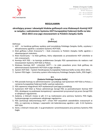 Polski Związek Golfa Lim Center, Al. Jerozolimskie 65/79 00-697 Warszawa Tel: +48 22 6305560 Fax: +48 22 6305561 www.pzgolf.pl REGULAMIN określający prawa i obowiązki klubów golfowych oraz Klubowych Komisji HCP w związku z wdrożeniem Systemu HCP Europejskiej Federacji Golfa na lata 2012-2015 oraz jego stosowaniem w Polskim Związku Golfa § 1. [Definicje] Definicje: 1. HCP - to handicap golfowy wydany pod jurysdykcją Polskiego Związku Golfa, uzyskany i aktualizowany zgodnie z zasadami Systemu HCP EGA; 2. Klub golfowy („Klub Zrzeszony”) – klub zrzeszony w Polskim Związku Golfa zgodnie z obowiązującym statutem; 3. Klub macierzysty – to klub golfowy, który odpowiada za prowadzenie HCP członków w nim zrzeszonych; 4. Komisja HCP PZG – to komisja problemowa Zarządu PZG upoważniona do nadzoru nad stosowaniem Systemu HCP EGA w Polsce; 5. Klubowa Komisja HCP („Komitet HCP”) – to ciało powołane przez klub golfowy do administrowania Systemem HCP EGA w jego obrębie; 6. System HCP EGA – System Handicapowy Europejskiej Federacji Golfa na lata 2012-2015; 7. System PZG Eagle – Centralny system informatyczny Polskiego Związku Golfa „PZG Eagle”; 1. 2. 3. 4. 5. 6. § 2. [Zadania Polskiego Związku Golfa] PZG posiada licencję na administrowanie i jurysdykcję nad Systemem HCP EGA w Polsce, z ramienia Europejskiej Federacji Golfa i pod jej nadzorem. PZG zapewnia integralność HCP wydawanych pod jego jurysdykcją. Systemem HCP EGA w Polsce administruje Zarząd PZG za pośrednictwem Komisji HCP PZG, działającej na podstawie kompetencji i upoważnień przyznanych jej przez Zarząd PZG w odrębnym regulaminie. Zadania, o których mowa w pkt 2-3 są realizowane przy pomocy Systemu PZG Eagle, funkcjonującego na podstawie odrębnego regulaminu. PZG zachowuje dokumentację HCP i zmian HCP wszystkich zawodników zrzeszonych w PZG, co najmniej za bieżący i poprzedni rok kalendarzowy zgodnie z pkt. 3.3.6 Systemu HCP EGA. Dane, o których mowa pkt. 5 są gromadzone i przechowywane przy pomocy Systemu PZG Eagle. Polski Związek Golfa z siedzibą w Warszawie, LIM Center, Al. Jerozolimskie 65/79, 00-697 Warszawa, Polska. NIP 11813-89-478. KRS 00000117289 prowadzony przez Sąd Rejonowy dla m.st. W-wy. XII wydz. KRS. REGON: 010345636. Polski Związek Golfa Lim Center, Al. Jerozolimskie 65/79 00-697 Warszawa Tel: +48 22 6305560 Fax: +48 22 6305561 www.pzgolf.pl 1. 2. 3. 4. 5. 6. 7. 1. 2. 3. 4. 5. 6. § 3. [Prawa i obowiązki klubu golfowego] Klub golfowy pełni funkcję władz HCP dla członków w nim zrzeszonych, dla których jest on klubem macierzystym. Zawodnik może przynależeć tylko do jednego klubu macierzystego, z zastrzeżeniem pkt 4.2.3 Systemu HCP EGA. Jeżeli zawodnik jest członkiem więcej niż jednego klubu golfowego, musi wskazać jeden z nich jako swój klub macierzysty. Funkcję władzy HCP klub golfowy pełni pod nadzorem Komisji HCP PZG. Klub golfowy jest odpowiedzialny za prawidłowe stosowanie postanowień Systemu HCP EGA. Klub golfowy jest zobowiązany do powołania w swoich strukturach Klubowej Komisji HCP do wykonywania obowiązków wymienionych w pkt. 3.4 Systemu HCP EGA. W przypadku stwierdzenia poważnych uchybień w zakresie stosowania Systemu HCP EGA przez klub golfowy Zarząd PZG może, na wniosek Komisji HCP PZG, pozbawić klub golfowy kompetencji władzy HCP lub ustalić dla niego takie warunki działania jakie uzna za stosowne. W przypadku niedopełnienia przez klub golfowy obowiązków wynikających z Systemu HCP Zarząd PZG, na wniosek Komisji HCP PZG, może podjąć decyzję o unieważnieniu HCP członków danego klubu golfowego. § 4. [Prawa i obowiązki Klubowej Komisji HCP] Klubowa Komisja HCP jest powoływana przez klub golfowy do wykonywania zadań wynikających z pkt. 3.4 Systemu HCP EGA przy pomocy Systemu PZG Eagle. Klubowa Komisja HCP działa na podstawie regulaminu uchwalonego przez władze klubu golfowego, Reguł Gry w Golfa, Systemu HCP EGA oraz statutu i regulaminów PZG. Klubowa Komisja HCP składa się z trzech osób, będących członkami klubu golfowego. Rekomenduję się aby członkowie komisji reprezentowali obydwie płcie. Członkiem Klubowej Komisji HCP może zostać tylko członek danego klubu golfowego, posiadający odpowiednią wiedzę i doświadczenie związane z obsługa Systemu HCP EGA. Pracami Klubowej Komisji HCP kieruje jej Przewodniczący, który ma obowiązek: a) informowania Komisji HCP PZG drogą elektroniczną na adres [email protected] o składzie osobowym komisji i wszelkich jego zmianach; b) aktualizowania danych w panelu Klubowej Komisji HCP Systemu PZG Eagle za pośrednictwem adresu poczty elektronicznej [email protected]; c) aktualizowania danych dotyczących komisji zamieszczonych na stronie internetowej PZG za pośrednictwem adresu poczty elektronicznej [email protected]. Do zadań Klubowej Komisji HCP, w szczególności należy: a) administrowanie Systemem HCP EGA w klubie golfowym; b) nadzór nad przestrzeganiem Systemu HCP EGA przez członków klubu; c) zapewnienie jednolitości HCP EGA wydawanych w klubie golfowym; d) przeprowadzenie DWH w terminie ustalonym przez Komisję HCP PZG i pod jej nadzorem; Polski Związek Golfa z siedzibą w Warszawie, LIM Center, Al. Jerozolimskie 65/79, 00-697 Warszawa, Polska. NIP 11813-89-478. KRS 00000117289 prowadzony przez Sąd Rejonowy dla m.st. W-wy. XII wydz. KRS. REGON: 010345636. Polski Związek Golfa Lim Center, Al. Jerozolimskie 65/79 00-697 Warszawa Tel: +48 22 6305560 Fax: +48 22 6305561 www.pzgolf.pl e) rozstrzyganie sporów, wątpliwości lub zażaleń dotyczących zastosowania Systemu HCP EGA w klubie golfowym; f) występowanie do Komisji HCP PZG w sprawach dotyczących wykładni zapisów Systemu HCP EGA; g) podejmowanie decyzji w sprawie: zawieszenia lub utraty HCP przez członka klubu, przywrócenia HCP członka klubu, zmiany HCP członka klubu w drodze DWH. h) przekazywanie do rozpoznania przez Komisję HCP PZG odwołań od podjętych decyzji