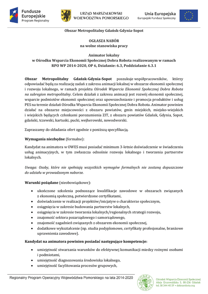 Obszar Metropolitalny Gdańsk-Gdynia-Sopot OGŁASZA NABÓR na wolne stanowiska pracy Animator lokalny w Ośrodku Wsparcia Ekonomii Społecznej Dobra Robota realizowanym w ramach RPO WP 2014-2020, OP 6, Działanie: 6.3, Poddziałanie 6.3.1 Obszar Metropolitalny Gdańsk-Gdynia-Sopot poszukuje współpracowników, którzy odpowiadać będą za realizację zadań z zakresu animacji lokalnej w obszarze ekonomii społecznej i rozwoju lokalnego, w ramach projektu Ośrodek Wsparcia Ekonomii Społecznej Dobra Robota na subregion metropolitalny. Celem działań z zakresu animacji jest rozwój ekonomii społecznej, wsparcie podmiotów ekonomii społecznej oraz upowszechnianie i promocja produktów i usług PES na terenie działań Ośrodka Wsparcia Ekonomii Społecznej Dobra Robota. Animator powinien działać na obszarze miejscowości z obszaru powiatów, gmin miejskich, miejsko-wiejskich i wiejskich będących członkami porozumienia ZIT, z obszaru powiatów Gdańsk, Gdynia, Sopot, gdański, tczewski, kartuski, pucki, wejherowski, nowodworski. Zapraszamy do składania ofert zgodnie z poniższą specyfikacją. Wymagania niezbędne (formalne): Kandydat na animatora w OWES musi posiadać minimum 3-letnie doświadczenie w świadczeniu usług animacyjnych, w tym zwłaszcza odnośnie rozwoju lokalnego i tworzenia partnerstw lokalnych. Uwaga: Osoby, które nie spełniają wszystkich wymogów formalnych nie zostaną dopuszczone do udziału w prowadzonym naborze. Warunki pożądane (nieobowiązkowe): ukończone szkolenia podnoszące kwalifikacje zawodowe w obszarach związanych z ekonomią społeczną, potwierdzone certyfikatami, doświadczenie w realizacji projektów/inicjatyw o charakterze społecznym, osiągnięcia w zakresie budowania partnerstw lokalnych, osiągnięcia w zakresie tworzenia lokalnych/regionalnych strategii rozwoju, znajomość sektora pozarządowego i samorządowego, znajomość zagadnień związanych z obszarem ekonomii społecznej, dodatkowe wykształcenie (np. studia podyplomowe, certyfikaty profesjonalne, branżowe uprawnienia zawodowe). Kandydat na animatora powinien posiadać następujące kompetencje: umiejętność stwarzania warunków do efektywnej komunikacji miedzy rożnymi osobami i podmiotami, umiejętność diagnozowania środowiska lokalnego, umiejętność facylitowania procesów grupowych, umiejętność pracy z grupą, moderowania i prowadzenia spotkań, znajomość specyfiki i najważniejszych uwarunkowań społeczno-gospodarczych obszaru, w którym prowadzi działania animacyjne, znajomość specyfiki i najważniejszych uwarunkowań prawno – finansowych funkcjonowania sektora ekonomii społecznej, wiedza nt. funkcjonowania samorządu terytorialnego, umiejętność rozwiązywania konfliktów, umiejętność przygotowania procesu animacji, który będzie uwzględniał rozwój organizacji oraz rozwój idei ekonomii społecznej. Wymagania dodatkowe (będące przedmiotem oceny): dyspozycyjność oraz możliwość podjęcia pracy w wymiarze jednego etatu, praktyczna znajomość formalnych zagadnień związanych z obszarem ekonomii społecznej, znajomość specyfiki realizacji projektów finansowanych ze środków unijnych, posiadanie kluczowych kompetencji i umiejętności pozwalających na optymalne wykonywanie zadań na stanowisku: samodzielność i dynamizm w działaniu, wysokie umiejętności organizacyjne, umiejętność pracy w zespole i angażowania innych w aktywną współpracę, umiejętność skutecznego działania pod presją czasu, umiejętność planowania czasu pracy i elastyczność w działaniu, odpowiedzialność, umiejętność obsługi komputera (Excel, Word, PowerPoint), łatwość pisania i swoboda wypowiedzi, kreatywność i zdolność do jasnej komunikacji, wysoka kultura osobista. Uwaga: Po analizie dokumentów sprawdzających stopień spełnienia powyższych wymagań zastrzega się prawo zaproszenia na rozmowy kwalifikacyjne jedynie wybranych osób. Zakres wykonywanych zadań na stanowisku: diagnozowanie potencjału lokalnego środowiska, inicjowanie spotkań, działań i kontaktów pomiędzy podmiotami działającymi na danym obszarze, inicjowanie i wspieranie powstawania grup osób i instytucji, zamierzających rozpocząć działalność w formie PES, zawiązywanie i rozwój partnerstw, sieci współpracy lokalnych podmiotów w celu rozwoju PES i PS, wymianę informacji nt. zmieniających się przepisów prawa dotyczących PES, ułatwianie kontaktów, doprowadzenie do lepszego poznania się mieszkańców i tworzonych przez nich grup i środowisk, animowanie wśród mieszkańców dyskusji dotyczących ekonomii społecznej, wyszukiwanie i wspieranie liderów lokalnych, inicjowanie powstawania grup inicjatywnych, motywowanie grup i środowisk do podejmowania aktywności ukierunkowanych na rozwój ekonomii społecznej, włączanie lokalnych Jednostek Samorządu Terytorialnego do działań na rzecz rozwoju ekonomii społecznej, działania ukierunkowane na integrację sektora pozarządowego, administracji publicznej i sektora biznesu, budowanie lokalnych koalicji, w tym współpraca z Jednostkami Samorządu Terytorialnego, instytucjami publicznymi i pozarządowymi oraz sektorem biznesu (rozumiane jako inicjowanie, wsparcie, koalicje, dobry klimat, edukowanie itp.), moderowanie sytuacji edukacyjnych w środowisku, stałe motywowanie osób, podmiotów, w tym instytucji publicznych do podjęcia i kontynowania działania między innymi poprzez wskazywanie możliwych korzyści społeczno-ekonomicznych lub kosztów zaniechania, ścisła współpraca ze Specjalistą ds. partnerstw, doradcą kluczowym zaangażowanym w proces wsparcia na terytorium działania animatora, praca w zespole animatorów, praca modelem efektywności (w oparciu o cele i efekty). Obszar działań animatorów: Animator powinien działać na obszarze miejscowości z obszaru powiatów, gmin miejskich, miejsko-wiejskich i wiejskich będących członkami porozumienia ZIT. Każdy animato