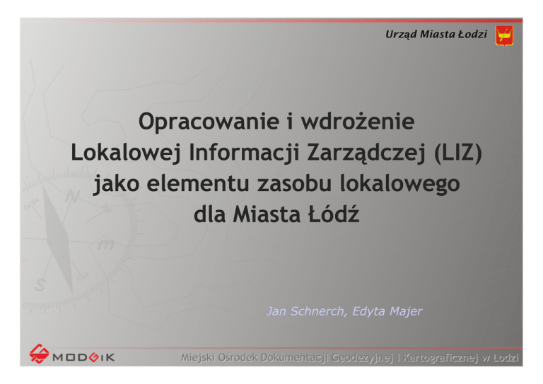 Urząd Miasta Łodzi Opracowanie i wdrożenie Lokalowej Informacji Zarządczej (LIZ) jako elementu zasobu lokalowego dla Miasta Łódź Jan Schnerch, Edyta Majer Urząd Miasta Łodzi Zarządzeniem Nr 1025/VI/11 z dnia 29 lipca 2011 Prezydent Miasta Łodzi powołał zespół do realizacji Projektu: „Opracowanie i wdrożenie Lokalowej Informacji Zarządczej (LIZ) jako elementu zasobu Lokalowego dla Miasta Łódź” Urząd Miasta Łodzi • Miejski Ośrodek Dokumentacji Geodezyjnej i Kartograficznej w Łodzi (MODGiK) został wyznaczony jako jednostka odpowiedzialna za realizację Projektu. • Udzielono Panu Janowi Schnerchowi, Dyrektorowi Miejskiego Ośrodka Dokumentacji Geodezyjnej i Kartograficznej w Łodzi pełnomocnictwa do reprezentowania Miasta Łodzi w ramach realizacji Projektu. • Nadzór merytoryczny w zakresie realizacji Projektu powierzono Dyrektorowi Wydziału Budynków i Lokali Urzędu Miasta Łodzi. Urząd Miasta Łodzi W zarządzeniu Prezydent Miasta Łodzi powołał zespół do realizacji Projektu w następującym składzie: Kierownik Projektu: • Dariusz Kwapisz - Z-ca Dyrektora ds. Informatycznych w Miejskim Ośrodku Dokumentacji Geodezyjnej i Kartograficznej w Łodzi; Z-cy Kierownika Projektu: • Edyta Majer - Kierownik Działu Aktualizacji Zasobu i Wdrożeń w Miejskim Ośrodku Dokumentacji Geodezyjnej i Kartograficznej w Łodzi, • Anna Wierzbicka - p.o. Kierownika Oddziału Baz Danych w Wydziale Informatyki Urzędu Miasta Łodzi; Członkowie: Przedstawiciele Administracji Nieruchomościami: • Tomasz Ciszewski - Dyrektor Administracji Nieruchomościami Łódź – Bałuty „Bałuty Nowe”, • Agnieszka Bednarek - Z-ca Dyrektora Administracji Nieruchomościami Łódź – Bałuty „Centrum”, • Anita Głowacka - Specjalista ds. informatycznych Administracji Nieruchomościami Łódź – Śródmieście „Nowe Miasto”, Urząd Miasta Łodzi Przedstawiciel dawnych referatów: • Agata Jabłkowska - Podinspektor w Centrum Obsługi Mieszkańców Łódź-Polesie Przedstawiciele Wydziału Budynków i Lokali: • • • Urszula Waszczyk - p.o. Kierownika Oddziału Lokali Użytkowych i Eksploatacji w Wydziale Budynków i Lokali Urzędu Miasta Łodzi, Jolanta Pogońska - Inspektor w Oddziale Lokali Mieszkalnych w Wydziale Budynków i Lokali Urzędu Miasta Łodzi, Małgorzata Marynowska - Inspektor w Oddziale ds. Zarządzania w Wydziale Budynków i Lokali Urzędu Miasta Łodzi. Powołany został również Zespół wspierający w składzie: • • Jan Maciej Czajkowski – Kierownik Oddziału ds. Organizacji Centrum Kontaktu z Mieszkańcami w Wydziale Organizacyjnym; Jacek Szopiński - Główny Specjalista w Miejskim Ośrodku Dokumentacji Geodezyjnej i Kartograficznej w Łodzi. Urząd Miasta Łodzi Celem projektu „Opracowanie i wdrożenie Lokalowej Informacji Zarządczej (LIZ) jako elementu zasobu lokalowego Miasta Łódź" jest stworzenie ewidencji lokali będącej podstawą do budowy informacji zarządczej. Założeniem głównym Projektu jest: 1. utworzenie bazy danych lokali (lokal powiązany z budynkiem, budynek z działką), 2. zasilanie/aktualizowanie bazy będzie odbywało się w miejscach powstawania zmian (będzie najszybszy dostęp do informacji). Urząd Miasta Łodzi Cele szczegółowe budowy Lokalowej Informacji Zarządczej (LIZ) to uzyskanie: • wiedzy o rozmiarze posiadanego i zarządzanego zasobu lokalowego, • kontroli nad realizacją umów najmu i dzierżawy, • wiedzy o stanie technicznym substancji lokalowej, • możliwości prowadzenia analiz ilościowych, jakościowych, finansowych w oparciu o przyjęte wskaźniki, • możliwości prowadzenia analiz w odniesieniu do obszarów: dzielnic, administracji nieruchomości, kwartałów ulic • możliwość prowadzenia analiz czasowych z interwałem miesięcznym (prezentowane na obszarze kwartału i większego) Urząd Miasta Łodzi LIZ obejmuje stworzenie bazy danych lokali przy wykorzystaniu danych z aplikacji ewidencji gruntów budynków i lokali (EGBil) oraz posiadanych przez Administracje Nieruchomości (AN). Dostarczona baza lokali będzie podzbiorem tworzonej bazy Ewidencji Nieruchomości (EN). Urząd Miasta Łodzi Przedmiot zamówienia jest realizowany w następujących etapach: Etap I Część I Stworzenie zasobu lokali, przy wykorzystaniu danych: • pochodzących z bazy EGBiL prowadzonej przez Miejski Ośrodek Dokumentacji Geodezyjnej i Kartograficznej (MODGiK), • pochodzących z plików XML przekazywanych z aplikacji będących w użytkowaniu AN do Urzędu Miasta Łodzi (UMŁ). Część II • przygotowanie aplikacji służącej do raportowania w zakresie zasobu lokalowego. Urząd Miasta Łodzi Etap II • Przygotowanie danych oraz aplikacji służącej do raportowania w zakresie obsługi finansowej lokalu (nieruchomości - przedmiotu). Etap II stanowi prawo opcji, którego realizacje Zamawiający uzależnia od zmiany swoich potrzeb. Urząd Miasta Łodzi Założenia: • Raportowanie będzie wykorzystywane do celów zarządczych i dostępne będzie tylko w UMŁ. • Raporty tworzone będą na podstawie danych znajdujących się w bazie EN. • Dane w EN zasilane będą danymi z AN. • Raporty powinny być łatwo konfigurowalne przez użytkownika końcowego. Urząd Miasta Łodzi Terminy realizacji Projektu LIZ: • Etap I do 30 marca 2012r. – część I Etapu I (załadowana baza danych lokali) do końca listopada 2011r. – część II Etapu I (aplikacja do raportowania) do końca marca 2012r. • Etap II (finansowy, obszar fakultatywny zdefiniowany w trakcie realizacji Projektu) do końca III kwartału 2012r. Urząd Miasta Łodzi Przy realizacji Projektu wykorzystane zostaną informację dostępnych w bazach danych UMŁ, MODGiK i AN: EGBIL - Do zbudowania właściwej bazy danych zostaną w pierwszej kolejności wykorzystane dane z bazy EGBiL prowadzonej przez MODGiK. - W bazie tej znajdują się wszystkie samodzielne lokale w Łodzi oraz te, które są własnością i we w