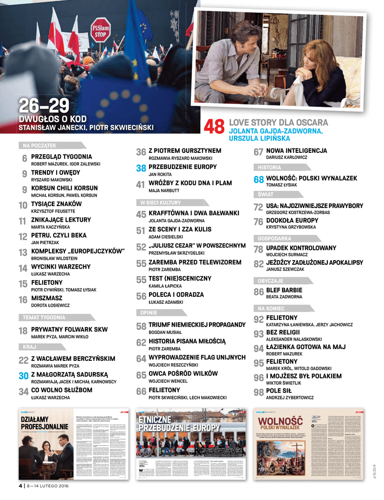 26–29 DWUGŁOS DWUG DW UGŁO ŁOS SOK KOD 48 LOVE STORY DLA OSCARA STANISŁAW JANECKI, PIOTR SKWIECIŃSKI [ NA POCZĄTEK 36 Z PIOTREM GURSZTYNEM PRZEGLĄD TYGODNIA 6 KORSUN CHILI KORSUN MARTA KACZYŃSKA PETRU, CZYLI BEKA 12 JAN PIETRZAK 45 BRONISŁAW WILDSTEIN 14 WYCINKI WARZECHY 15 FELIETONY ŁUKASZ WARZECHA ZAREMBA PRZED TELEWIZOREM 62 66 CO WOLNO SŁUŻBOM 34 ŁUKASZ WARZECHA KRAJ ROZMOWA Niektórzy komentatorzy na siłę doszukują się konfliktów czy pęknięć. A reformy przeprowadzane dziś w Polsce to wspólne dzieło prezydenta, rządu i większości parlamentarnej Jacek i Michał Karnowscy rozmawiają z MAŁGORZATĄ SADURSKĄ, szefową Kancelarii Prezydenta Andrzeja Dudy To biura, które mają umożliwić spełnienie obietnic wyborczych? Tak. Prezydent bardzo poważnie traktuje swoje zobowiązania i dlatego w taki sposób została ukształtowana kancelaria. Andrzej Duda chce rozmawiać z przedstawicielami wszystkich grup społecznych, także tych rzadziej zauważanych. Ale chce też rozmawiać o przyszłości Polski w gronie autorytetów i ekspertów. I temu właśnie służy kolejne powołane przez niego ciało, czyli Narodowa Rada Rozwoju. Oczywiście tak ważna struktura jak Kancelaria Prezydenta nigdy nie jest „skończona”, zawsze coś może wymagać zmiany. Potoczna opinia jest taka, że mało kogo zwolniliście, utrzymując kadrę urzędniczą odziedziczoną po poprzednikach. Zwolnienia były rzeczywiście niewielkie, mówimy o kilkunastu osobach. Kolejny temat to Klarysew. To poważna sprawa. Pisaliśmy o niej obszernie w tygodniku „wSieci”. Jeszcze za prezydentury Lecha Kaczyńskiego to był normalny, dobrze wyposażony ośrodek konferencyjny. Teraz zostały puste ściany. Tak, dosłownie puste ściany. Z Klarysewa zniknęło prawie całe wyposażenie, nie zostało nic. Resztę „zutylizowano”, czyli spisano na straty. Musi to zastanawiać, bo przecież niszczyć można przedmioty całkowicie niezdatne do użycia, nikomu już niepotrzebne. W Klarysewie tymczasem pozbyto się rzeczy dobrej jakości. Ktoś zlekceważył swoje podstawowe obowiązki. To nie była własność prywatna, to była własność Kancelarii Prezydenta, czyli skarbu państwa. Mało tego, jak wy- ŁAZIENKA GOTOWA NA MAJ 94 ROBERT MAZUREK PIOTR ZAREMBA nika z oficjalnych dokumentów, z Klarysewa wywożono sprzęty już po odejściu poprzedników, czyli 7 sierpnia. Mam jeszcze w pamięci kilka niewywiezionych mebli, a wykazanych w protokołach jako „zutylizowane”. Niektórzy pytają, czy tego wyposażenia nie należy poszukać w różnych miejscach, gdzieś na działkach? Szafy na broń długą raczej się nie wyrzuca na śmietnik. To już zadanie prokuratury. WOJCIECH WENCEL WIKTOR ŚWIETLIK FELIETONY POLE SIŁ HISTORIA KRYZYS IMIGRACYJNY ETNICZNE PRZEBUDZENIE EUROPY Co dalej z willą w Klarysewie? Zostanie przywrócona do życia? Teraz to miejsce sprawia wrażenie przygnębiające, to po prostu ponury, zaniedbany pustostan. Myślimy jednak, co można z tym zrobić. Trwają prace koncepcyjne, szacujemy koszty. Moim zdaniem to miejsce trzeba wyremontować, wyposażyć i przywrócić mu dawny blask. 8—14 LUTEGO 2016 | 31 DZIEJE PAŃSTWA TOMASZ ŁYSIAK WOLNOŚĆ dziennikarz O POLSKI WYNALAZEK Europie należy przypomnieć, że to właśnie nam, Polakom, twórcom, „wynalazcom”, eksperymentatorom, którzy odkryli pierwiastek wolności jako fundament szczęścia narodów i kluczowy element funkcjonowania państw, należy się szacunek Termin marcowego posiedzenia Rady Europejskiej (17–18 marca) zyskał ostatnio niemal magiczne znaczenie. Odkąd Donald Tusk oznajmił, że to termin ostateczny na jakiekolwiek decyzje dotyczące ochrony zewnętrznej granicy Schengen, kolejni europejscy przywódcy powtarzają to twierdzenie jak polityczną mantrę Jaką funkcję będzie pełniło to miejsce, jeśli rzeczywiście wróci do życia? To może być np. miejsce spotkań intelektualistów, nawiązujące do seminariów lucieńskich organizowanych przez śp. Lecha Kaczyńskiego. Albo miejsce, w którym spokojnie mogą pracować eksperci. Pomysłów z pewnością nie zabraknie. Przy okazji sprawy Klarysewa były prezydent Bronisław Komorowski zarzucił wam brak elegancji. Sugerował, że nie powinno się informować o sprawach dotyczących poprzedników na urzędzie. Takie opinie rzeczywiście się pojawiały. Nie mogę jednak się z nimi zgodzić. W przypadku dbałości o mienie skarbu państwa takie kategorie estetyczne jak „elegancja” nie mają nic do rzeczy. Obejmując urząd, musiałam sprawdzić, w jakim on jest stanie, czy zapisany w dokumentach majątek rzeczywiście jest na swoim miejscu. Gdybym nie zleciła inwentaryzacji, być może aż do dziś nie wiedzielibyśmy, że zginęła np. „Gęsiarka”. Czy wtedy kategorie elegancji byłyby spełnione? 98 ANDRZEJ ZYBERTOWICZ PIOTR SKWIECIŃSKI, LECH MAKOWIECKI JAN ROKITA publicysta W marcu miałoby więc nastąpić coś, co sprawi, że zostanie powstrzymana fala afroazjatyckich imigrantów przybywających na nasz kontynent, na dobre powróci swoboda podróżowania wzdłuż i wszerz Europy, a także zostanie zahamowany powolny, 38 | 8—14 LUTEGO 2016 ale systematyczny pochód antyeuropejskiej prawicy, po raz pierwszy na serio aspirującej do władzy w kilku unijnych krajach z Francją na czele. Tyle tylko, że na dobrą sprawę nikt nie potrafi jasno powiedzieć, co takiego miałoby się wydarzyć na marcowym unijnym szczycie. Sytuacja wygląda bowiem na patową. Żeby ją zmienić, trzeba by decyzji nagłych, stanowczych i radykalnych, na dodatek idących pod prąd europejskim ideologicznym nawykom i poprawnościom. Unia musiałaby się okazać zdolna nie tylko do wycofania się z gwarantowanych traktatami zawiłych procedur azylowych stworzonych na całkiem inne czasy i inne okoliczności, lecz nadto do powołania w trybie nagłym kilkudziesięciotysięcznej formacji zbrojnej do ochrony swoich granic zewnętrznych. Co więcej, musi