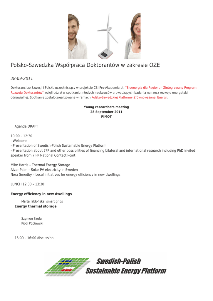 Polsko-Szwedzka Współpraca Doktorantów w zakresie OZE 28-09-2011 Doktoranci ze Szwecji i Polski, uczestniczący w projekcie CBI Pro-Akademia pt. "Bioenergia dla Regionu - Zintegrowany Program Rozwoju Doktorantów" wzięli udział w spotkaniu młodych naukowców prowadzących badania na rzecz rozwoju energetyki odnawialnej. Spotkanie zostało zrealizowane w ramach Polsko-Szwedzkiej Platformy Zrównoważonej Energii. Young researchers meeting 28 September 2011 PIMOT Agenda DRAFT 10:00 – 12:30 - Welcome - Presentation of Swedish-Polish Sustainable Energy Platform - Presentation about 7FP and other possibilities of financing bilateral and international research including PhD invited speaker from 7 FP National Contact Point Mike Harris – Thermal Energy Storage Alvar Palm – Solar PV electricity in Sweden Nora Smedby – Local initiatives for energy efficiency in new dwellings LUNCH 12:30 – 13:30 Energy efficiency in new dwellings Marta Jabłońska, smart grids Energy thermal storage Szymon Szufa Piotr Popławski 15:00 – 16:00 discussion Strona CBI Pro-Akademia używa ciasteczek (cookies), dzięki którym nasz serwis może działać lepiej. Zobacz