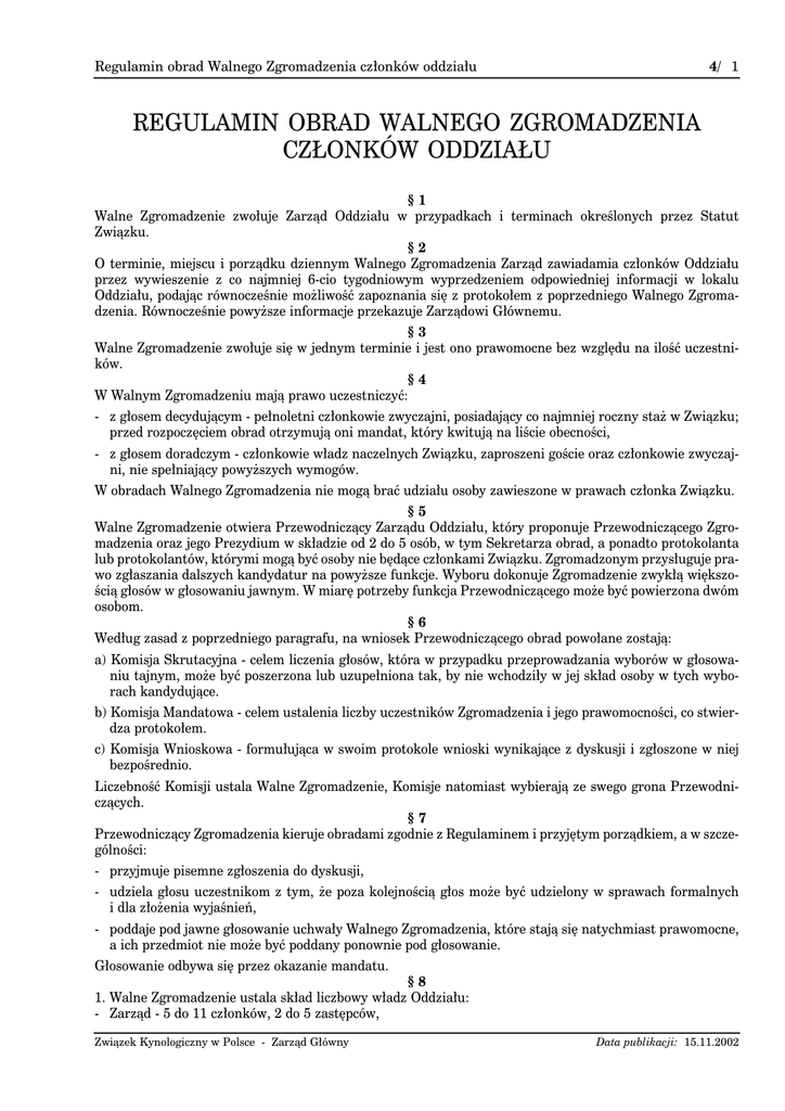 Regulamin obrad Walnego Zgromadzenia członków oddziału 4/ 1 REGULAMIN OBRAD WALNEGO ZGROMADZENIA CZŁONKÓW ODDZIAŁU §1 Walne Zgromadzenie zwołuje Zarząd Oddziału w przypadkach i terminach określonych przez Statut Związku. §2 O terminie, miejscu i porządku dziennym Walnego Zgromadzenia Zarząd zawiadamia członków Oddziału przez wywieszenie z co najmniej 6-cio tygodniowym wyprzedzeniem odpowiedniej informacji w lokalu Oddziału, podając równocześnie możliwość zapoznania się z protokołem z poprzedniego Walnego Zgromadzenia. Równocześnie powyższe informacje przekazuje Zarządowi Głównemu. §3 Walne Zgromadzenie zwołuje się w jednym terminie i jest ono prawomocne bez względu na ilość uczestników. §4 W Walnym Zgromadzeniu mają prawo uczestniczyć: - z głosem decydującym - pełnoletni członkowie zwyczajni, posiadający co najmniej roczny staż w Związku; przed rozpoczęciem obrad otrzymują oni mandat, który kwitują na liście obecności, - z głosem doradczym - członkowie władz naczelnych Związku, zaproszeni goście oraz członkowie zwyczajni, nie spełniający powyższych wymogów. W obradach Walnego Zgromadzenia nie mogą brać udziału osoby zawieszone w prawach członka Związku. §5 Walne Zgromadzenie otwiera Przewodniczący Zarządu Oddziału, który proponuje Przewodniczącego Zgromadzenia oraz jego Prezydium w składzie od 2 do 5 osób, w tym Sekretarza obrad, a ponadto protokolanta lub protokolantów, którymi mogą być osoby nie będące członkami Związku. Zgromadzonym przysługuje prawo zgłaszania dalszych kandydatur na powyższe funkcje. Wyboru dokonuje Zgromadzenie zwykłą większością głosów w głosowaniu jawnym. W miarę potrzeby funkcja Przewodniczącego może być powierzona dwóm osobom. §6 Według zasad z poprzedniego paragrafu, na wniosek Przewodniczącego obrad powołane zostają: a) Komisja Skrutacyjna - celem liczenia głosów, która w przypadku przeprowadzania wyborów w głosowaniu tajnym, może być poszerzona lub uzupełniona tak, by nie wchodziły w jej skład osoby w tych wyborach kandydujące. b) Komisja Mandatowa - celem ustalenia liczby uczestników Zgromadzenia i jego prawomocności, co stwierdza protokołem. c) Komisja Wnioskowa - formułująca w swoim protokole wnioski wynikające z dyskusji i zgłoszone w niej bezpośrednio. Liczebność Komisji ustala Walne Zgromadzenie, Komisje natomiast wybierają ze swego grona Przewodniczących. §7 Przewodniczący Zgromadzenia kieruje obradami zgodnie z Regulaminem i przyjętym porządkiem, a w szczególności: - przyjmuje pisemne zgłoszenia do dyskusji, - udziela głosu uczestnikom z tym, że poza kolejnością głos może być udzielony w sprawach formalnych i dla złożenia wyjaśnień, - poddaje pod jawne głosowanie uchwały Walnego Zgromadzenia, które stają się natychmiast prawomocne, a ich przedmiot nie może być poddany ponownie pod głosowanie. Głosowanie odbywa się przez okazanie mandatu. §8 1. Walne Zgromadzenie ustala skład liczbowy władz Oddziału: - Zarząd - 5 do 11 członków, 2 do 5 zastępców, Związek Kynologiczny w Polsce - Zarząd Główny Data publikacji: 15.11.2002 4/ 2 Regulamin obrad Walnego Zgromadzenia członków oddziału - Komisja Rewizyjna - 3 do 7 członków, 2 lub 3 zastępców, - Oddziałowy Sąd Koleżeński - 5 do 11 członków, 1 do 3 zastępców. 2. Ustępujący Zarząd jest uprawniony do zgłaszania kandydatur do władz Oddziału w liczbie nie większej od ustalonej ilości członków tych władz i ich zastępców. Zebrani zgłaszają dalsze kandydatury, aż do podjęcia przez Zgromadzenie uchwały o zamknięciu listy. Zgłaszający kandydata obowiązany jest podać jego krótką charakterystykę. 3. Warunkiem kandydowania jest zgoda zainteresowanego, która w razie jego nieobecności może być złożona w formie pisemnej na ręce Przewodniczącego. 4. Listy kandydatów sporządza się w kolejności alfabetycznej. §9 Wybory do władz odbywają się w głosowaniu tajnym i są przeprowadzane przez Komisję Skrutacyjną, która rozdaje uczestnikom ostemplowane karty do głosowania. § 10 Głosowanie odbywa się przez oddanie karty z pozostawionymi nazwiskami tych kandydatów, na których głos ma być oddany. Pozostałe nazwiska winny zostać skreślone. Liczba nazwisk pozostawionych nie może być większa od liczby członków władz Oddziału ustalonych przez Walne Zgromadzenie. Pozostawienie większej ilości nazwisk nie skreślonych czyni głos nieważnym. Zastępców członków nie wybiera się oddzielnie. Zostają nimi kolejni kandydaci według uzyskanej ilości głosów. W przypadku uzyskania przez dwóch lub więcej kandydatów jednakowej ilości głosów, gdy z uwagi na ustaloną liczbę władz Oddziału nie mogą oni wszyscy zostać uznani za wybranych, przeprowadza się dodatkowe głosowanie na powyższych zasadach. § 11 Po zakończeniu głosowania Komisja Skrutacyjna niezwłocznie dokonuje obliczanie głosów, pracując w pomieszczeniu niedostępnym dla pozostałych uczestników Zgromadzenia. Z wyników głosowania sporządza się protokół w 4 egzemplarzach, który podpisują wszyscy członkowie Komisji. Karty do głosowania z oddanymi głosami oraz 1 egzemplarz protokołu zabezpiecza się w zamkniętej kopercie, która podlega przechowaniu przez Zarząd Oddziału. § 12 Zasady powyższe stosuje się przy wyborze delegatów Oddziału na Zjazd Delegatów. § 13 W przypadku trudności w prawidłowym prowadzeniu Zgromadzenia z powodu niewłaściwego zachowania się zebranych, Przewodniczący obrad jest uprawniony do: uprzedzenia, że dalsze zakłócanie przebiegu Zgromadzenia spowoduje zawieszenie obrad i zawieszenie Zgromadzenia przed wyczerpaniem porządku dziennego, a w przypadku nieskuteczności tego uprzedzenia do zawieszenia obrad i zakończenia Walnego Zgromadzenia. § 14 Zawieszenie obrad może być dokonane przez Przewodniczącego w przypadku niemożności ich kontynuowania z przyczyn techniczny
