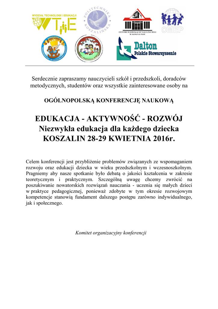 Serdecznie zapraszamy nauczycieli szkół i przedszkoli, doradców metodycznych, studentów oraz wszystkie zainteresowane osoby na OGÓLNOPOLSKĄ KONFERENCJĘ NAUKOWĄ EDUKACJA - AKTYWNOŚĆ - ROZWÓJ Niezwykła edukacja dla każdego dziecka KOSZALIN 28-29 KWIETNIA 2016r. Celem konferencji jest przybliżenie problemów związanych ze wspomaganiem rozwoju oraz edukacji dziecka w wieku przedszkolnym i wczesnoszkolnym. Pragniemy aby nasze spotkanie było debatą o jakości kształcenia w zakresie teoretycznym i praktycznym. Szczególną uwagę chcemy zwrócić na poszukiwanie nowatorskich rozwiązań nauczania - uczenia się małych dzieci w praktyce pedagogicznej, ponieważ zdobyte w tym okresie rozwojowym kompetencje stanowią fundament dalszego postępu zarówno indywidualnego, jak i społecznego. Komitet organizacyjny konferencji KOMUNIKAT 1 Program konferencji przewiduje w części teoretycznej dyskusję oraz refleksję poświęconą aktywnym metodom kształcenia i ich miejscu w praktyce pedagogicznej. Podczas sesji plenarnej poruszone zostaną kwestie uwarunkowań niezbędnych do budowania aktywności edukacyjnej dziecka w warunkach instytucjonalnych. W sekcjach problemowych przewidziane są warsztaty z zakresu praktycznego zastosowania wybranych aktywizujących metod i technik pracy z dzieckiem. Organizatorzy przewidują m.in. warsztaty muzycznoteatralne, metodyczne, diagnozy i terapii, zajęcia praktyczne z zakresu zastosowania najnowszych technologii w nauczaniu dziecka oraz wizytę studyjną w wybranych placówkach wychowania przedszkolnego w Koszalinie. Wykłady i warsztaty prowadzić będą specjaliści z zakresu neurodydaktyki, psychologii i dydaktyki wywodzący się ze środowisk naukowych, jak i praktycy (doradcy metodyczni, nauczyciele, terapeuci). Szczegółowy program konferencji przesłany będzie w Komunikacie 2. Warunkiem udziału w konferencji jest rejestracja on-line poprzez wypełnienie formularza zgłoszeniowego znajdującego się na stronie WWW.EAR.TU.KOSZALIN.PL Termin zgłaszania udziału w konferencji upływa dnia 10.04.2016r. Liczba miejsc ograniczona! Zgłoszenie zostanie potwierdzone po dokonaniu wpłaty opłaty konferencyjnej w wysokości 150 PLN na rachunek bankowy Organizatora: Politechnika Koszalińska ul. Śniadeckich 2 75-453 Koszalin 71 1030 1263 0000 0000 8949 9003 Bank Handlowy w Warszawie (Citibank Handlowy) z adnotacją 2489380042P/16 oraz imię i nazwisko uczestnika Koszt udziału w konferencji obejmuje udział w części plenarnej i warsztatowej oraz catering. Organizator zastrzega sobie możliwość odwołania konferencji z powodu zbyt małej ilości zgłoszonych osób. W takim wypadku Organizator dokona zwrotu kwot wpłaconych przez uczestników. Uczestnicy konferencji dokonują opłaty za noclegi we własnym zakresie. Organizator nie dokonuje rezerwacji miejsc noclegowych dla uczestników konferencji. W trakcie konferencji Organizator zastrzega sobie prawo wykonywania zdjęć oraz utrwalania przebiegu obrad i warsztatów w formie dokumentacji filmowej w celu wykorzystania w publikacjach oraz innych serwisach reklamowych Organizatora.