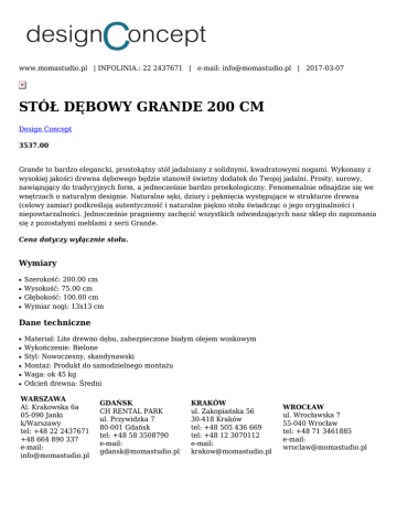 www.momastudio.pl | INFOLINIA.: 22 2437671 | e-mail: [email protected] | 2017-03-07 STÓŁ DĘBOWY GRANDE 200 CM Design Concept 3537.00 Grande to bardzo elegancki, prostokątny stół jadalniany z solidnymi, kwadratowymi nogami. Wykonany z wysokiej jakości drewna dębowego będzie stanowił świetny dodatek do Twojej jadalni. Prosty, surowy, nawiązujący do tradycyjnych form, a jednocześnie bardzo proekologiczny. Fenomenalnie odnajdzie się we wnętrzach o naturalym designie. Naturalne sęki, dziury i pęknięcia występujące w strukturze drewna (celowy zamiar) podkreślają autentyczność i naturalne piękno stołu świadcząc o jego oryginalności i niepowtarzalności. Jednocześnie pragniemy zachęcić wszystkich odwiedzających nasz sklep do zapoznania się z pozostałymi meblami z serii Grande. Cena dotyczy wyłącznie stołu. Wymiary ● ● ● ● Szerokość: 200.00 cm Wysokość: 75.00 cm Głębokość: 100.00 cm Wymiar nogi: 13x13 cm Dane techniczne ● ● ● ● ● ● Materiał: Lite drewno dębu, zabezpieczone białym olejem woskowym Wykończenie: Bielone Styl: Nowoczesny, skandynawski Montaż: Produkt do samodzielnego montażu Waga: ok 45 kg Odcień drewna: Średni WARSZAWA Al. Krakowska 6a 05-090 Janki k/Warszawy tel: +48 22 2437671 +48 664 890 337 e-mail: [email protected] GDAŃSK CH RENTAL PARK ul. Przywidzka 7 80-001 Gdańsk tel: +48 58 3508790 e-mail: [email protected] KRAKÓW ul. Zakopiańska 56 30-418 Kraków tel: +48 505 436 669 tel: +48 12 3070112 e-mail: [email protected] WROCŁAW ul. Wrocławska 7 55-040 Wrocław tel: +48 71 3461885 e-mail: [email protected]