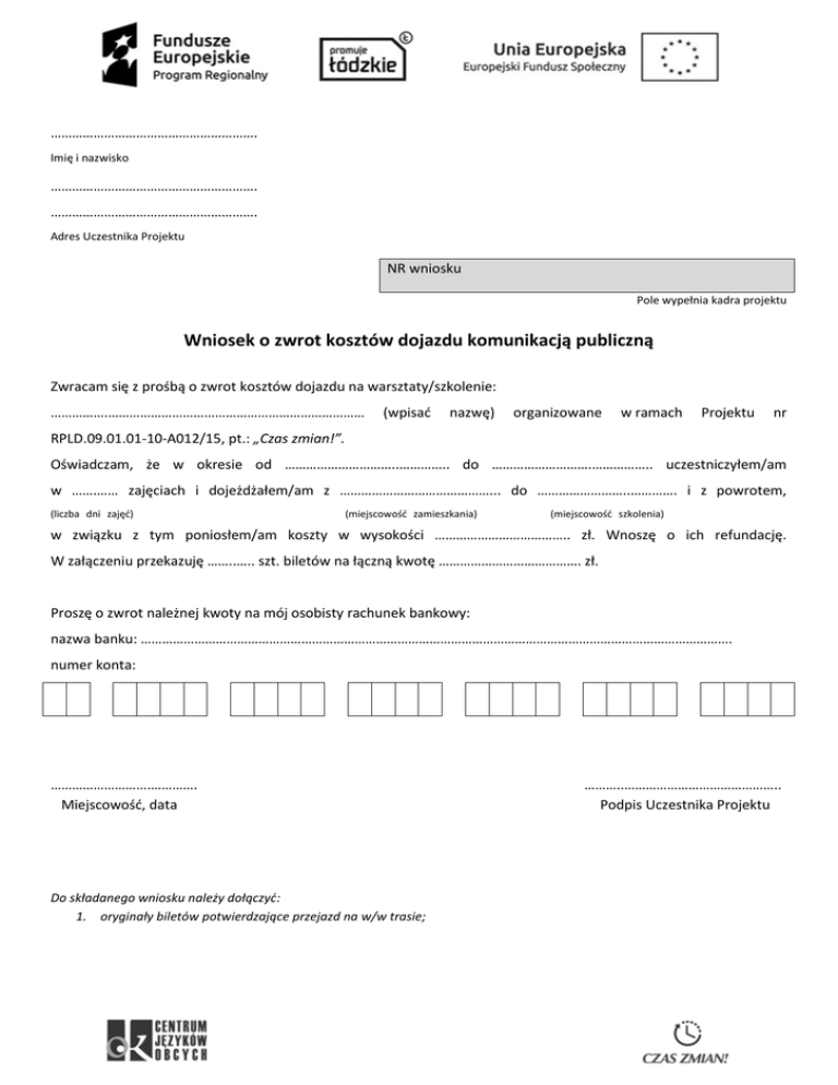 …………………………………………………. Imię i nazwisko …………………………………………………. …………………………………………………. Adres Uczestnika Projektu NR wniosku Pole wypełnia kadra projektu Wniosek o zwrot kosztów dojazdu komunikacją publiczną Zwracam się z prośbą o zwrot kosztów dojazdu na warsztaty/szkolenie: …………….……………………………………………………………… (wpisać nazwę) organizowane w ramach Projektu nr RPLD.09.01.01-10-A012/15, pt.: „Czas zmian!”. Oświadczam, że w okresie od …………………………..………….. do ……………………….…………….. uczestniczyłem/am w …….…… zajęciach i dojeżdżałem/am z ……………………………………... do ……………………..…………. i z powrotem, (liczba dni zajęć) (miejscowość zamieszkania) (miejscowość szkolenia) ) w związku z tym poniosłem/am koszty w wysokości ……………………………….. zł. Wnoszę o ich refundację. W załączeniu przekazuję ……..….. szt. biletów na łączną kwotę …………………………………. zł. Proszę o zwrot należnej kwoty na mój osobisty rachunek bankowy: nazwa banku: …………………………………………………………………………………………………………………………………………………. numer konta: ……………………….…………. Miejscowość, data Do składanego wniosku należy dołączyć: 1. oryginały biletów potwierdzające przejazd na w/w trasie; ………..…………………………………….. Podpis Uczestnika Projektu …………………………………………………. Imię i nazwisko …………………………………………………. …………………………………………………. Adres Uczestnika Projektu NR wniosku Pole wypełnia kadra projektu Wniosek o zwrot kosztów dojazdu samochodem prywatnym Zwracam się z prośbą o zwrot kosztów dojazdu na warsztaty/szkolenie: …………….……………………………………………………………… (wpisać nazwę) organizowane w ramach Projektu nr RPLD.09.01.01-10-A012/15, pt.: „Czas zmian!”. Oświadczam, że w okresie od …………………………..………….. do ……………………….…………….. uczestniczyłem/am w …….…… zajęciach i dojeżdżałem/am z ……………………………………... do ……………………..…………. i z powrotem (liczba dni zajęć) (miejscowość zamieszkania) (miejscowość szkolenia) samochodem o numerze rejestracyjnym ………………………………….. . W związku z tym wnoszę o refundację kosztów dojazdu do wysokości ceny najtańszego/ych biletu/ów transportu publicznego na w/w trasie, która obsługiwana jest przez ……………………………………………………… i wynosi ………………………………………….. zł. Proszę o zwrot kosztów dojazdu w wysokości: ………………………….…….. liczba dni zajęć x ………….……………………….. zł cena najtańszego biletu x 2 = …………………………………. zł kwota wnioskowana Proszę o zwrot należnej kwoty na mój osobisty rachunek bankowy: nazwa banku: …………………………………………………………………………………………………………………………………………………. numer konta: ……………………….…………. Miejscowość, data ………..…………………………………….. Podpis Uczestnika Projektu Do składanego wniosku należy dołączyć: 1. kserokopia prawa jazdy Uczestnika Projektu z dopiskiem „Potwierdzam za zgodność z oryginałem (imię i nazwisko, podpis UP)” 2. kserokopia dowodu rejestracyjnego samochodu z dopiskiem „Potwierdzam za zgodność z oryginałem (imię i nazwisko, podpis UP)” 3. zaświadczenie przewoźnika wykonującego usługi w zakresie komunikacji publicznej o wysokości najtańszego biletu na danej trasie lub w przypadku odmowy wydania przez przewoźnika takiego zaświadczenia – oświadczenie Uczestnika projektu o cenie najtańszego biletu na danej trasie, z załączonym biletem potwierdzającym koszt dojazdu z miejsca zamieszkania do miejsca odbywania szkoleń; 4. umowa użyczenia samochodu (jeśli właścicielem nie jest Uczestnik Projektu); 5. oświadczenie Uczestnika Projektu osoby dowożonej oraz oświadczenie osoby dowożącej o dowożeniu Uczestnika Projektu wraz z kserokopią prawa jazdy osoby dowożącej i dowodu rejestracyjnego samochodu (jeżeli Uczestnik był dowożony); ………………………………………………… Miejscowość i data OŚWIADCZENIE PRZEWOŹNIKA O CENIE BILETU Oświadczam, że cena najtańszego biletu jednorazowego normalnego (dla osoby dorosłej) na trasie od ……………………..………………………………………………..……………… do ……………………..………………………………………………..…………… wynosi ………………..…. brutto. …………………………………..…………….……………………. Pieczęć i podpis Przewoźnika UMOWA UŻYCZENIA SAMOCHODU zawarta w dn. ....................... w ...................................................... pomiędzy: ..................................................... , zamieszkałym w ............................. przy ul. ............................................., legitymującym się dowodem osobistym serii ……... nr ...................., zwanym dalej Użyczającym a .............................................. , zamieszkałym w ............................. przy ul. ..................................................., legitymującym się dowodem osobistym serii …..... nr ................, zwanym dalej Biorącym do używania o treści następu