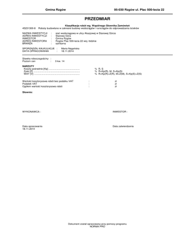 Gmina Rzgów 95-030 Rzgów ul. Plac 500-lecia 22 PRZEDMIAR 45231300-8 Klasyfikacja robót wg. Wspólnego Słownika Zamówień Roboty budowlane w zakresie budowy wodociągów i rurociągów do odprowadzania ścieków NAZWA INWESTYCJI ADRES INWESTYCJI INWESTOR ADRES INWESTORA BRANŻA : : : : : sieć wodociągowa w ulicy Akacjowej w Starowej Górze Starowa Góra Gmina Rzgów Rzgów Plac 500-lecia 22 woj. łódzkie sanitarna SPORZĄDZIŁ KALKULACJE : DATA OPRACOWANIA : Stawka roboczogodziny : Poziom cen : Maria Nagańska 18.11.2014 3 kw. 14 NARZUTY Koszty pośrednie [Kp] ............................................ Zysk [Z] .................................................................. WAT [V] ................................................................. Wartość kosztorysowa robót bez podatku VAT Podatek VAT Ogółem wartość kosztorysowa robót % R, S % R+Kp(R), M, S+Kp(S) % R+Kp(R)+Z(R), M+Z(M), S+Kp(S)+Z(S) : : : zł zł zł Słownie: WYKONAWCA : INWESTOR : Data opracowania 18.11.2014 Data zatwierdzenia Dokument został opracowany przy pomocy programu NORMA PRO 2014 siećStarowa Gora Akacjowa PRZEDMIAR Lp. Podstawa Opis i wyliczenia sieć wodociągowa d110 w ulicy w ul. Akacjowej 1 KNNR 1 Roboty pomiarowe przy liniowych robotach ziemnych - trasa dróg w terenie 0111-01 równinnym. 43,40/1000 2 KNNR 1 0209-06 j.m. Poszcz km km Wykopy oraz przekopy wyk.na odkład koparkami przedsiębiernymi o poj.łyżki 0.40 m3 w gr.kat. III 1,7*43,40 m3 3 KNR-W 2-01 Pełne umocnienie pionowych ścian wykopów liniowych o szerokości do 1 m i 0313-02 głęb. do 3 m balami drewnianymi w gruntach suchych kat. III-IV z rozbiórką 43,40*0,6*2< szalunki w dolej części wykopu do gł1,0m poniżej pterenu> m2 4 KNNR 1 0202-01 wywiezienie nadmiaru ziemi m3 73,78+1,302 m3 5 KNNR 1 0303-02 ręczny wykop dna pod podsypkę rurociągu w gr.kat. III m3 43,40*0,3*0,10 m3 6 KNNR 4 1411-01 Podłoża pod kanały i obiekty z materiałów sypkich grub. 10 cm m3 43,40*0,1*0,3 m3 7 KNR 4-01 0108-05 0108-08 dowóz piasku samochodami samowyładowczymi na odległość 10 km grunt. kat. I-II m3 <zasypka wykopu piaskiem >73,78 <objętość przewodu >-43,40*3,14*0,11*0,11/4 m3 m3 8 KNNR 4 1014-03 Sieci wodociągowe -Trojniki żeliwne ciśnieniowe kołnierzowe o śr. 110 /80mm szt 1 szt 9 KNNR 4 1009-04 Sieci wodociągowe - montaż rurociągów z rur polietylenowych (PE, PEHD) o śr.zewnętrznej 110 mm 43,40 m m3 m2 0,043 RAZEM 0,043 73,780 RAZEM 73,780 52,080 RAZEM 52,080 75,082 RAZEM 10 KNNR 4 1010-04 m Sieci wodociągowe - połączenie rur polietylenowych ciśnieniowych PE, PEHD złącz. metodą zgrzewania czołowego o śr. zewn. 110 mm 43,40/12+3 złącz. 11 KNR-W 2-18 Odnogi wbudowane w istniejące rurociągi z rur PE o śr. 110 mm 0804-03 1 wcin. 12 Oferta Materiały - korek PE110 1 szt szt 13 KNNR 4 1119-01 Hydranty p.pożarowe nadziemne o śr. 80 mm F-myJafar lub równorzędnyZ zabezpieczeniem przed wypływem wody w przypadku złamania Komora dolna, korpus pokrywa gniazdo kłowe, kaptur-Żeliwo sferoidalne EN-GJS-400-15 trzpień-Stal X20Cr13 Rura łącznikowa-Stal X6CrNi18-10 Grzyb EN-GJS-400-15+EPDM Korek dławiacy , nakkrętka trzpienia, gniazdo -mosiądz uszczelki-Guma EPDM malowanie-Farba epoksydowa o grubości warstwy 200µm 1<głębokości 1,60 > kpl 14 KNNR 1 0318-01 15 KNNR 1 0214-04 wcin. kpl Ręczne zasypywanie wraz z zagęszczeniem wykopów o ścianach pionowych o m3 szerokości 0.8-2.5 m i głęb.do 1.5 m w gr.kat. I-III Warstwa 30 cm nad rurą wodociągową 43,40*1,0*0,4-3,14*0,11*0,11/4*43,40 m3 Zasypanie wykopów .fund.podłużnych,punktowych,rowów,wykopów obiektowych spycharkami z zagęszcz.mechanicznym ubijakami (gr.warstwy w stanie luźnym 35 cm) - kat.gr. I-II 43,40<wykop całk>-16,948<ręczna zasypka> -2- Norma PRO Wersja 4.34 Nr seryjny: 6638 Użytkownik: Urząd Gminy Rzgów Razem 75,082 1,302 RAZEM 1,302 1,302 RAZEM 1,302 73,780 -0,412 RAZEM 73,368 1,000 RAZEM 1,000 43,400 RAZEM 43,400 6,617 RAZEM 6,617 1,000 RAZEM 1,000 1,000 RAZEM 1,000 1,000 RAZEM 1,000 16,948 RAZEM 16,948 26,452 RAZEM 26,452 m3 m3 2014 siećStarowa Gora Akacjowa Lp. Podstawa 16 KNNR 4 1111-04 PRZEDMIAR Opis i wyliczenia j.m. Zasuwa z żeliwa sferoidalnego z miekkim zamknięciem, klinowa, kołnieżowa f. kpl. Jafar lub równorzedna z obudową i skrzynką uliczną ,tabliczką informacyjną Średnica nominalna 80mm Ciśnienie nominalne- 1,0 Mpa Przyłącza- kołnierzowe Materiał korpusu-Żeliwo sferoidalne GGG50 Materiał trzpienia-Stal nierdzewna klin-Żeliwo sferoidalne z nawulkanizowana powłoką z gumy EPDM 1 kpl. 17 KNNR 4 1612-01 Jednokrotne płukanie sieci wodociągowej o śr. nominalnej do 150 mm 18 KNNR 4 1610-01 Próba wodna szczelności kanałów rurowych o śr.nominalnej do 150 mm 19 KNNR 4 1611-01 Dezynfekcja rurociągów sieci wodociągowych o śr.nominalnej do 150 mm 20 KNR 2-19 0219-01 Oznakowanie trasy wodociągu ułożonego w ziemi taśmą z tworzywa sztuczne- m go 43,40 m 21 KNR 2-19 0134-03 Oznakowanie trasy wodociągu na słupku betonowym kpl. 1 kpl. 22 KNNR 4 1430-01 Wykonanie różnych elementów drobnowymiarowych o objętości do 1.5 m3 m3 elementy betonowe 3*0,5*0,5*0,4< bloki podporowe - mogą być płyty fundamentowe 50x50x30>+ 3 m3 *0,7*0,7*0,2<obetonowanie zasuw > 23 kalkulacja własna Obsługa geodezyjna, inwentaryzacja powykonawcza, zajęcie pasa drogowego, kpl. badanie wody 1 kpl. 1 odc. 200m odc. 200m Poszcz 1,000 RAZEM 1 1 Norma PRO Wersja 4.34 Nr seryjny: 6638 Użytkownik: Urząd Gminy Rzgów 1,000 1,000 RAZEM -3- 1,000 1,000 RAZEM odc. 200m odc. 200m 1,000 1,000 RAZEM odc. -1 prób. odc. -1 prób. Razem 1,000 43,400 RAZEM 43,400 1,000 RAZEM 1,000 0,594 RAZEM 0,594 1,000 RAZEM 1,000 Lp. Podstawa wyceny Opis Jedn. miary 1 2 3 sieć wodociągowa d110 w ulicy w ul. Akacjowej 1 KNNR 1 0111- Roboty pomiarowe przy liniowych robotach ziemnych - km trasa dróg w terenie równinnym. 01 2 KNNR 1 0209- Wykopy oraz przekopy wyk.na odkład koparkami przed- m3 siębiernymi o poj.łyżki 0.40 m3 w gr.