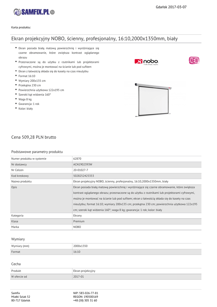 Gdańsk 2017-03-07 Karta produktu: Ekran projekcyjny NOBO, ścienny, profesjonalny, 16:10,2000x1350mm, biały Ekran posiada białą matową powierzchnię i wyróżniające się czarne obramowanie, które zwiększa kontrast oglądanego obrazu Przeznaczone są do użytku z rzutnikami lub projektorami cyfrowymi, można je montować na ścianie lub pod sufitem Ekran z łatwością składa się do kasety na czas nieużytku Format 16:10 Wymiary 200x135 cm Przekątna 230 cm Powierzchnia użytkowa 122x195 cm Szeroki kąt widzenia 160° Waga 8 kg Gwarancja: 1 rok Kolor: biały Cena 509,28 PLN brutto Podstawowe parametry produktu Numer produktu w systemie 62870 Nr dostawcy ACN1902393W Nr Celcen 20-01027-7 Kod kreskowy 5028252425353 Nazwa produktu Ekran projekcyjny NOBO, ścienny, profesjonalny, 16:10,2000x1350mm, biały Opis Ekran posiada białą matową powierzchnię i wyróżniające się czarne obramowanie, które zwiększa kontrast oglądanego obrazu; przeznaczone są do użytku z rzutnikami lub projektorami cyfrowymi, można je montować na ścianie lub pod sufitem; ekran z łatwością składa się do kasety na czas nieużytku; format 16:10; wymiary 200x135 cm; przekątna 230 cm; powierzchnia użytkowa 122x195 cm; szeroki kąt widzenia 160°; waga 8 kg; gwarancja: 1 rok; kolor: biały Kategoria Ekrany Klasa Premium Marka NOBO Wymiary Wymiary (mm) 2000x1350 Format 16:10 Cecha Produkt Ekran projekcyjny W ofercie od 2017-01 Samfix Miałki Szlak 52 80-717 Gdańsk NIP: 583-026-77-81 REGON: 190500169 +48 (58) 305 31 60 Gdańsk 2017-03-07 Karta katalogowa produktu cd. Ekran projekcyjny NOBO, ścienny, profesjonalny, 16:10,2000x1350mm, biały Typ Profesjonalny Rodzaj Ścienny Wspólny słownik zamówień CPV 30237210-4 Ekrany antyodblaskowe Certyfikaty Ilość lat gwarancji 1 Hit Standard Nowy produkt w ofercie Nowość Kolor Kolor Biały Serdecznie zapraszamy do współpracy Zespół Samfix. Samfix Miałki Szlak 52 80-717 Gdańsk NIP: 583-026-77-81 REGON: 190500169 +48 (58) 305 31 60