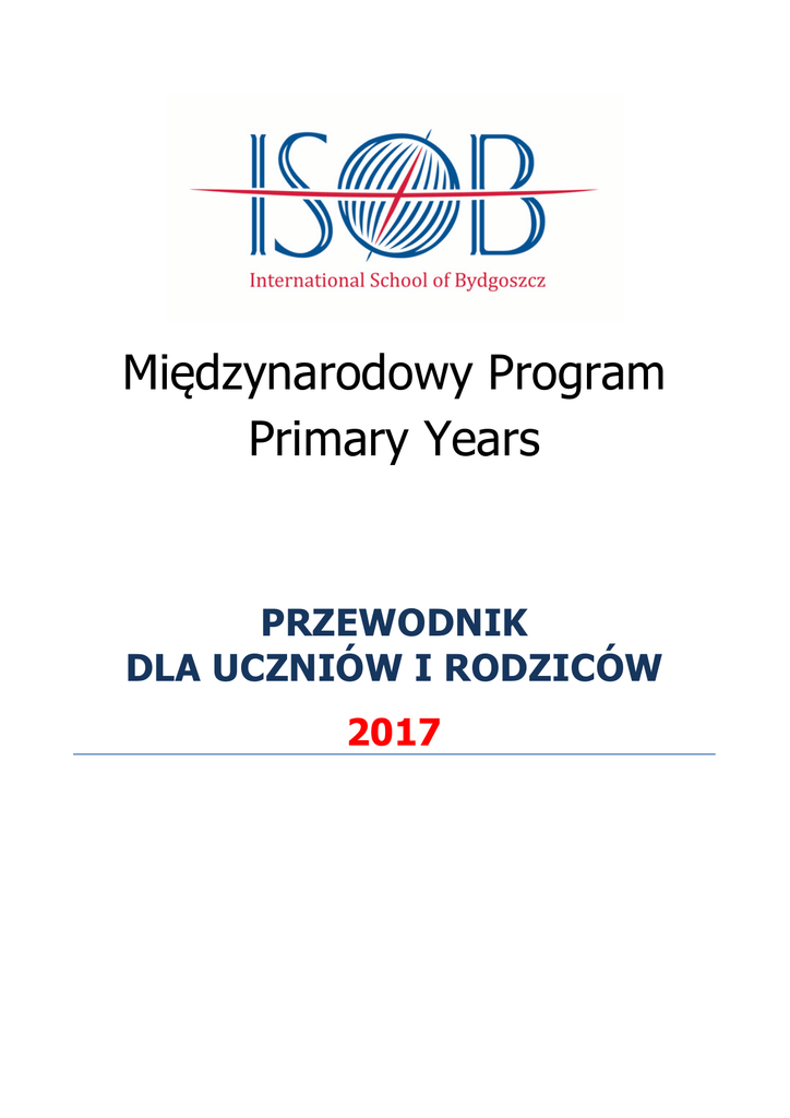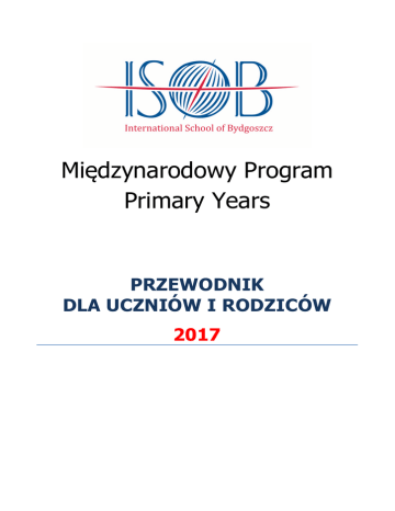Międzynarodowy Program Primary Years PRZEWODNIK DLA UCZNIÓW I RODZICÓW 2017 Spis treści 1. Wstęp ............................................................................................................................... 4 2. Misja i Filozofia ISoB. ......................................................................................................... 5 3. Profil Ucznia IB .................................................................................................................. 6 4. Primary Years Programme w ISoB ....................................................................................... 7 5. 6. 7. 4.1. Model Programu Nauczania PYP. ................................................................................. 7 4.2. The written curriculum - Założenia programowe ........................................................... 8 4.3. The taught curriculum - Metody i formy nauczania ..................................................... 10 4.4. The assessed curriculum – Sposoby oceniania ............................................................ 10 4.5. Wystawa dydaktyczna w PYP .................................................................................... 10 Program nauczania........................................................................................................... 11 5.1. Poszczególne przedmioty .......................................................................................... 11 5.1.1 Edukacja językowa.................................................................................................... 11 5.1.2 Matematyka ............................................................................................................. 11 5.1.3 Nauki ścisłe .............................................................................................................. 12 5.1.4 Wiedza o Społeczeństwie .......................................................................................... 12 5.1.5 Edukacja Osobista, Społeczna oraz Wychowanie Fizyczne (PSPE) ................................ 12 5.1.6 Sztuka ...................................................................................................................... 13 5.2 Program badawczy (Kolejność tematów zmienna w zależności od decyzji nauczyciela).. 13 5.2.1 Klasa 0 ..................................................................................................................... 13 5.2.2 Klasa 1 ..................................................................................................................... 14 5.2.3 Klasa 2 ..................................................................................................................... 16 5.2.4 Klasa 3 ..................................................................................................................... 17 5.2.5 Klasa 4 ..................................................................................................................... 18 5.2.6 Klasa 5 ..................................................................................................................... 20 5.3 Praca domowa ......................................................................................................... 21 Zasady oceniania ............................................................................................................. 22 6.1 Definicja oceniania ................................................................................................... 22 6.2 Cele oceniania .......................................................................................................... 22 6.3 Zasady oceniania...................................................................................................... 23 6.4 Kiedy oceniamy? ...................................................................................................... 24 6.5 Raportowanie........................................................................................................... 25 6.6 Ocenianie zachowania .............................................................................................. 27 6.7 Egzaminy poprawkowe oraz odwołanie się od ocen końcowych (jedynie klasa 4 i 5)... 29 Szkolny Regulamin Zachowywania .................................................................................... 32 2 8. 7.1 Regulamin Zachowania ............................................................................................. 32 7.2 Konsekwencje niedopuszczalnego zachowania ........................................................... 35 7.3 Polityka Językowa. ................................................................................................... 36 7.4 Polityka anti-bullyingowa. ......................................................................................... 37 7.5 Zasady dotyczące stroju ........................................................................................... 39 7.6 Frekwencja .............................................................................................................. 41 7.7 Polityka Technologii Informacyjnej ISoB .................................................................... 42 7.8 Regulamin biblioteki szkolnej .................................................................................... 44 Informacje praktyczne ...................................................................................................... 45 8.1 Zorganizowany uczeń ............................................................................................... 45 8.2 Kalendarz szkolny ..................................................................................................... 46 8.3 Obiady..................................................................................................................... 47 8.4 Parking .................................................................................................................... 47 8.5 Sprawy zdrowotne ...