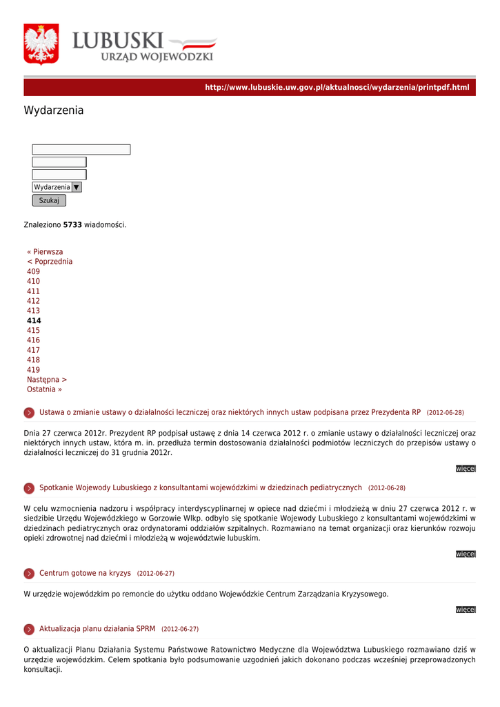 http://www.lubuskie.uw.gov.pl/aktualnosci/wydarzenia/printpdf.html Wydarzenia Wydarzenia ▼ Szukaj Znaleziono 5733 wiadomości. « Pierwsza < Poprzednia 409 410 411 412 413 414 415 416 417 418 419 Następna > Ostatnia » Ustawa o zmianie ustawy o działalności leczniczej oraz niektórych innych ustaw podpisana przez Prezydenta RP (2012-06-28) Dnia 27 czerwca 2012r. Prezydent RP podpisał ustawę z dnia 14 czerwca 2012 r. o zmianie ustawy o działalności leczniczej oraz niektórych innych ustaw, która m. in. przedłuża termin dostosowania działalności podmiotów leczniczych do przepisów ustawy o działalności leczniczej do 31 grudnia 2012r. więcej Spotkanie Wojewody Lubuskiego z konsultantami wojewódzkimi w dziedzinach pediatrycznych (2012-06-28) W celu wzmocnienia nadzoru i współpracy interdyscyplinarnej w opiece nad dziećmi i młodzieżą w dniu 27 czerwca 2012 r. w siedzibie Urzędu Wojewódzkiego w Gorzowie Wlkp. odbyło się spotkanie Wojewody Lubuskiego z konsultantami wojewódzkimi w dziedzinach pediatrycznych oraz ordynatorami oddziałów szpitalnych. Rozmawiano na temat organizacji oraz kierunków rozwoju opieki zdrowotnej nad dziećmi i młodzieżą w województwie lubuskim. więcej Centrum gotowe na kryzys (2012-06-27) W urzędzie wojewódzkim po remoncie do użytku oddano Wojewódzkie Centrum Zarządzania Kryzysowego. więcej Aktualizacja planu działania SPRM (2012-06-27) O aktualizacji Planu Działania Systemu Państwowe Ratownictwo Medyczne dla Województwa Lubuskiego rozmawiano dziś w urzędzie wojewódzkim. Celem spotkania było podsumowanie uzgodnień jakich dokonano podczas wcześniej przeprowadzonych konsultacji. więcej Konkurs o Nagrodę i Medal Zygmunta Glogera (2012-06-26) Wojewoda Marcin Jabłoński zachęca do udziału w konkursie o Nagrodę i Medal Zygmunta Glogera. Jego laureaci zostaną uhonorowani podczas sesji naukowej „Miejsca święte, miejsca przeklęte. Polskie doświadczenia przestrzeni”. Termin zgłaszania kandydatów mija 31 lipca. Ich pula to 48 tys. zł. więcej Szkolenie w Eisenhüttenstadt (2012-06-26) W przygranicznym Eisenhüttenstadt odbyły się ćwiczenia strażaków województwa lubuskiego w nowym budynku, który służyć będzie do szkolenia polskich oraz niemieckich strażaków w warunkach zbliżonych do rzeczywistego zagrożenia podczas pożarów. więcej Weekend z wicewojewodą (2012-06-26) W miniony piątek zakończył się sezon artystyczny 2011/2012 w Teatrze imienia Juliusza Osterwy w Gorzowie Wielkopolskim. Podczas uroczystości dyrektor Jan Tomaszewicz został uhonorowany medalem "Zasłużony dla kultury polskiej". Nie zabrakło również podziękowań oraz kwiatów. więcej Seminarium urbanistyczne (2012-06-25) Wojewoda Marcin Jabłoński otworzył seminarium urbanistyczne. Szkolenie poświęcone jest problemom planowania przestrzennego w świetle istniejących oraz zmieniających się przepisów prawnych. więcej 100 zł - dodatek do świadczenia pielęgnacyjnego (2012-06-25) Dodatkowe 100 zł dla niektórych osób pobierajacych świadczenie pielęgnacyjne więcej 50-lat Zespołu Szkół w Kostrzynie (2012-06-23) Zespół Szkół im. Marii Skłodowskiej-Curie w Kostrzynie nad Odrą świętował 50-lecie istnienia. Z dyrekcją, pedagogami i absolwentami spotkał się wicewojewoda Jan Świrepo. więcej « Pierwsza < Poprzednia 409 410 411 412 413 414 415 416 417 418 419 Następna > Ostatnia »