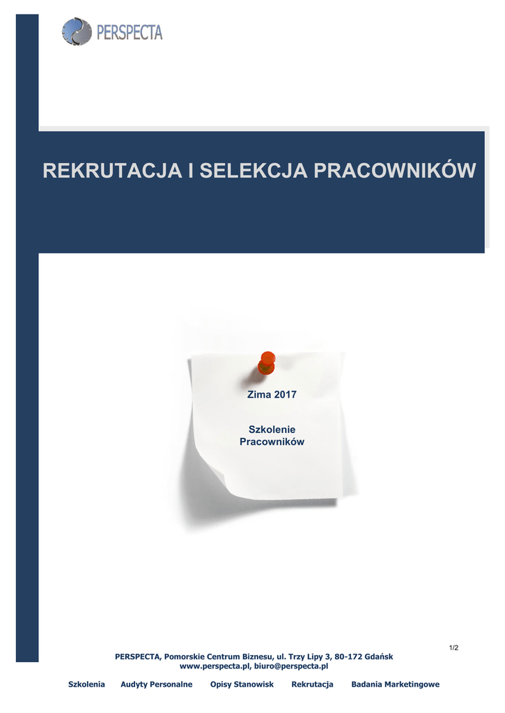 REKRUTACJA I SELEKCJA PRACOWNIKÓW Zima 2017 Szkolenie Pracowników 1/2 PERSPECTA, Pomorskie Centrum Biznesu, ul. Trzy Lipy 3, 80-172 Gdańsk www.perspecta.pl, [email protected] Szkolenia Audyty Personalne Opisy Stanowisk Rekrutacja Badania Marketingowe KORZYŚCI UCZESTNICTWA W SZKOLENIACH ZAMKNIĘTYCH Program indywidualnie przygotowany dla Uczestników szkolenia Część praktyczna szkolenia opracowana w oparciu o specyfikę branży i stanowiska uczestników Imienny certyfikat ukończenia szkolenia Bogaty pakiet materiałów szkoleniowych Doświadczona kadra trenerska Realizację w formie 20% teorii, 80% praktyki Dostęp do najnowszej wiedzy i narzędzi szkoleniowych Warunki organizacyjne: Termin Miejsce Przybliżony koszt Do ustalenia. Do ustalenia. Szkolenia organizujemy na terenie całego kraju. 3500 PLN netto – 1 dzień szkoleniowy (8 godzin zegarowych) dla grupy do 10 osób. 10% zniżki przy podpisaniu umowy na miesiąc przed realizacją szkolenia. W cenie: opracowanie indywidualnego programu dopasowanego do potrzeb Klienta, przygotowanie materiałów uwzględniających specyfikę branży, przeprowadzenie szkolenia, bogaty pakiet materiałów szkoleniowych, imienne certyfikaty ukończenia szkolenia. PRZYKŁADOWE MODUŁY SZKOLENIA Cel szkolenia: Gdzie tkwi sukces firmy? Oczywiście – w pracownikach, zatem proces ich rekrutacji powinien w sposób selektywny wybrać najlepszych kandydatów. Celem szkolenia jest pokazanie uczestnikom jak skutecznie zaplanować proces rekrutacji. Moduły Szkoleniowe: WPROWADZENIE DO PROCESU REKRUTACJI I SELEKCJI (m.in. planowanie procesu rekrutacji, redagowanie ogłoszeń, selekcje cv i lm kandydatów, źródła rekrutacji- wewnętrzne, zewnętrzne oraz zalety i wady, rodzaje rekrutacji- szeroka, segmentowa oraz zalety i wady, funkcje rekrutacji- informacyjna, motywacyjna, preselekcyjna, model „sita”, model „kapitału ludzkiego”, regulacje prawne- ochrona danych osobowych, dyskryminacja, strategie selekcyjne). METODY REKRUTACYJNE (m.in. Formy rekrutacji oraz ich wady i zalety, direct search, ogłoszenia prasowe, internetowe, nowoczesne formy poszukiwania Kandydatów: portale społecznościowe, fora internetowe, poprawność tworzenia ogłoszeń, targi pracy, współpraca z agencjami pośrednictwa pracy i firmami konsultingowymi). NARZĘDZIA REKRUTACYJNE (m.in. testy psychologiczne, ankiety, kwestionariusze, referencje, wywiad środowiskowy, zadania próbne, grafologia, obserwacja uczestnicząca, AC, metoda carta vita). OPISY STANOWISK I PROFIL KANDYDATA (m.in. sformułowanie celów i zadań na stanowisku pracy, elementy opisów stanowisk i ich tworzenie, metody analizy stanowisk pracy- zadania, zachowania, atrybuty, profil osobowy a opis stanowiska, elementy kompletnego profilu kandydata, rodzaje kompetencji- społeczne, menedżerskie, osobiste, opisy kompetencji, kryteria oceny kompetencji, ćwiczenie z określania wymagań na stanowiska). DOKUMENTY APLIKACYJNE (m.in. rola dokumentów na etapie rekrutacji, wzory i standardy pisania dokumentów, CV, listy motywacyjne, zaświadczenia, certyfikaty, referencje- szczegółowa analiza, najczęstsze błędy popełniane przy konstruowaniu dokumentów aplikacyjnych. ROZMOWA KWALIFIKACYJNA (m.in. komunikacja werbalna i niewerbalna, aktywne słuchanie kandydata, wstępna ocena kandydata, zadawanie pytań- rodzaje pytań, jakich pytań unikać, sporządzanie notatek w trakcie rozmowy, metoda STAR przy ocenie kompetencji zawodowych, indywidualne treningi uczestników szkolenia). OCENA ZINTEGROWANA- ASSESMENT CENTER (m.in. AC jako metoda oceny kompetencji, korzyści z zastosowania AC, etapy- przygotowań, realizacji, oceny, etapy przebiegu AC, wady stosowania AC- wysoki poziom stresu, sztuczne warunki, nierzetelne wyniki). INDYWIDUALNE TRENINGI REKRUTACJI PRACOWNIKÓW Indywidualne symulacje prowadzenia rozmów kwalifikacyjnych oraz praca nad mocnymi i słabymi stronami poszczególnych Uczestników szkolenia. Powyższe moduły szkolenia są przykładowe. Program szkolenia zostanie dopasowany do Państwa potrzeb oraz będzie uwzględniać specyfikę branży. Dla Klientów realizujących szkolenia cykliczne dodatkowy rabat, uzależniony od wielkości całego projektu. W celu opracowania indywidualnej oferty wraz z programem szkolenia prosimy o przesłanie zapytania do Działu Szkoleń: [email protected] podając preferowaną tematykę szkolenia oraz ilość osób. Konsultanci dopasują ofertę do Państwa potrzeb. 2/2 PERSPECTA, Pomorskie Centrum Biznesu, ul. Trzy Lipy 3, 80-172 Gdańsk www.perspecta.pl, [email protected] Szkolenia Audyty Personalne Opisy Stanowisk Rekrutacja Badania Marketingowe