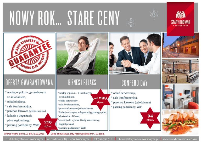 10 * nocleg w pok. 2-, 3- osobowym ze śniadaniem, ze śniadaniem, * obiad serwowany, * obiadokolacja, * sala konferencyjna, * sala konferencyjna, zł/os. * sala konferencyjna, * przerwa kawowa (całodzienna) * parking podziemny, WiFi * dyskoteka z DJ-em, 219 zł/os. Oferta ważna od 01.01 do 31.03.2016 Hotel Stary Browar Kościerzyna 299 * kolacja uroczysta z degustacją grzanego piwa, * kolacja z degustacją * parking podziemny, WiFi od * przerwa kawowa (jednorazowa), * przerwa kawowa (jednorazowa), piwa regionalnego * obiad serwowany, * nocleg w pok. 2-, 3- osobowym * atrakcja do wyboru (kulig saneczkowy, 94 zł/os. kąpiel piwna) * parking podziemny, WiFi Cena obowiązuje przy rezerwacji dla min. 10 osób. ul. Słodowa 3, 83 – 400 Kościerzyna tel. 790 792 710 [email protected] www.starybrowarkoscierzyna