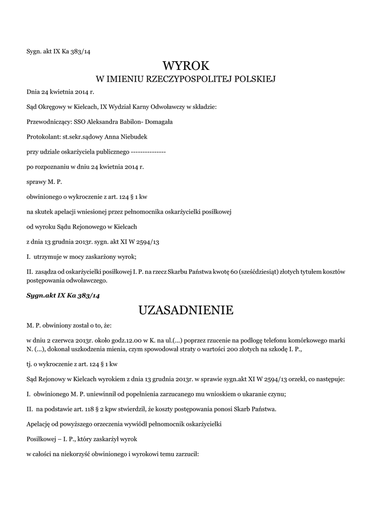 Sygn. akt IX Ka 383/14 WYROK W IMIENIU RZECZYPOSPOLITEJ POLSKIEJ Dnia 24 kwietnia 2014 r. Sąd Okręgowy w Kielcach, IX Wydział Karny Odwoławczy w składzie: Przewodniczący: SSO Aleksandra Babilon- Domagała Protokolant: st.sekr.sądowy Anna Niebudek przy udziale oskarżyciela publicznego --------------po rozpoznaniu w dniu 24 kwietnia 2014 r. sprawy M. P. obwinionego o wykroczenie z art. 124 § 1 kw na skutek apelacji wniesionej przez pełnomocnika oskarżycielki posiłkowej od wyroku Sądu Rejonowego w Kielcach z dnia 13 grudnia 2013r. sygn. akt XI W 2594/13 I. utrzymuje w mocy zaskarżony wyrok; II. zasądza od oskarżycielki posiłkowej I. P. na rzecz Skarbu Państwa kwotę 60 (sześćdziesiąt) złotych tytułem kosztów postępowania odwoławczego. Sygn.akt IX Ka 383/14 UZASADNIENIE M. P. obwiniony został o to, że: w dniu 2 czerwca 2013r. około godz.12.00 w K. na ul.(...) poprzez rzucenie na podłogę telefonu komórkowego marki N. (...), dokonał uszkodzenia mienia, czym spowodował straty o wartości 200 złotych na szkodę I. P., tj. o wykroczenie z art. 124 § 1 kw Sąd Rejonowy w Kielcach wyrokiem z dnia 13 grudnia 2013r. w sprawie sygn.akt XI W 2594/13 orzekł, co następuje: I. obwinionego M. P. uniewinnił od popełnienia zarzucanego mu wnioskiem o ukaranie czynu; II. na podstawie art. 118 § 2 kpw stwierdził, że koszty postępowania ponosi Skarb Państwa. Apelację od powyższego orzeczenia wywiódł pełnomocnik oskarżycielki Posiłkowej – I. P., który zaskarżył wyrok w całości na niekorzyść obwinionego i wyrokowi temu zarzucił: 1. obrazę przepisów postępowania, a w szczególności art. 4 kpk i art. 7 kpk, przez dokonanie oceny wiarygodności wyjaśnień obwinionego oraz zeznań świadków A. P. i (...), bez uwzględnienia deklarowanej przez nich i widocznej ich depozycjach niechęci wobec oskarżycielki posiłkowej; 2. błąd w ustaleniach faktycznych przyjętych za podstawę wyroku, przez przyjęcie, że obwiniony nie działał w zamiarze zniszczenia telefonu, a zatem – że nie dopuścił się popełnienia zarzucanego mu czynu. W oparciu o tak sformułowane zarzuty, wniósł skarżący o uchylenie zaskarżonego wyroku i przekazanie sprawy do ponownego rozpoznania Sądowi I instancji. Sąd Okręgowy zważył, co następuje: Apelacja pełnomocnika oskarżycielki posiłkowej okazała się bezzasadna, a podniesione w niej zarzuty nieuprawnione. Stosownie do treści przepisów art. 4 kpk i art. 7 kpk, które z mocy art. 8 kpw recypowane zostały do postępowania w sprawach o wykroczenia, organy prowadzące postępowanie obowiązane są badać oraz uwzględniać okoliczności przemawiające zarówno na korzyść, jak i na niekorzyść obwinionego ( zasada obiektywizmu ) oraz, winny te organy kształtować swe przekonanie na podstawie wszystkich przeprowadzonych dowodów, ocenianych swobodnie z uwzględnieniem zasad prawidłowego rozumowania oraz wskazań wiedzy i doświadczenia życiowego ( zasada swobodnej oceny dowodów ). Wbrew twierdzeniom autora skargi apelacyjnej, w sprawie niniejszej orzekający sąd nie uchybił żadnej z dwóch przywołanych zasad, bowiem przeprowadził w sprawie wszystkie niezbędne dla jej wyjaśnienia dowody, które poddał wnikliwej i wszechstronnej ocenie, która pozostaje w zgodzie z zasadami logiki i doświadczeniem życiowym. Nie jest tak, jak zarzuca skarżący, jakoby Sąd Rejonowy oceniając zebrane w sprawie dowody nie uwzględnił istniejącego pomiędzy stronami procesu ( małżonkowie P. ) silnego konfliktu, który również występuje w relacji pomiędzy córką stron J. i oskarżycielką oraz matką obwinionego a oskarżycielką. Fakt istnienia tego konfliktu na gruncie wszystkich pozyskanych dowodów był i jest oczywisty oraz bezsporny, a w związku z tym nie było potrzeby zgłębiania tej okoliczności przyznawanej przez wszystkich uczestników procesu ( obwiniony, pokrzywdzona, wymienieni świadkowie ). Niezależnie jednak od powyższego, fakt istnienia poważnego rozłamu w rodzinie stron, a nawet eskalacji wspomnianego konfliktu, zasadnie orzekający sąd miał na uwadze analizując i oceniając dowody osobowe ( por. uzasadnienie Sądu Rejonowego k. 5 – 7 ), wprost wskazując na postawę poszczególnych osób oraz m.in. dokument z karty 43 – 44 sygnowany podpisem J. P.. Godzi się przy tym zauważyć, iż rzeczony konflikt, w który zaangażowani są nie tylko małżonkowie P., ale ich najstarsza ( choć ciągle nastoletnia córka) oraz A. P. ( z jednej strony matka obwinionego, z drugiej zaś teściowa pokrzywdzonej ), nakazuje ostrożność zarówno przy ocenie twierdzeń obwinionego i wspierających go świadków w osobach J. P. i A. P., jak i przy ocenie depozycji I. P.. Wzajemna niechęć, w odniesieniu do oceny relacji każdej z wymienionych osób, w takim samym stopniu i zakresie winna była zostać wzięta pod uwagę, bowiem rodzinny konflikt był istotnym elementem nie tylko przy ocenie wiarygodności wyjaśnień obwinionego i zeznań świadków obrony, ale również przy ocenie wiarygodności zeznań pokrzywdzonej. W tym stanie rzeczy, generalnie ostrożność w powołanym zakresie tyczyła wszystkich relacji pochodzących od osób zaangażowanych w spór, a nie tylko depozycji M. P., J. P. i A. P., jak zdawał się postulować pełnomocnik oskarżycielki posiłkowej. Nie jest również zasadnym pogląd autora apelacji, iż na ocenie dowodów zaważył „czynnik ilościowy”, tj. fakt, iż wersję zdarzenia przedstawioną przez obwinionego potwierdzały dwie inne osoby ( świadkowie ), podczas gdy pokrzywdzona w swej relacji była osamotniona, gdyż w krytycznym czasie nie towarzyszył jej nikt dla niej przyjazny i obiektywny, kto opisałby przebieg zajścia w zgodzie z jej zeznaniami. Rzecz w tym, iż niezależnie od liczby osób relacjonujących wypadki z dnia 2 czerwca 2013r., Sąd Rejonowy dokonał oceny dowodów osobowych przez pryzmat ich spójności, wzajemnej korelacji, przy uwzg