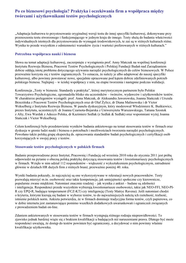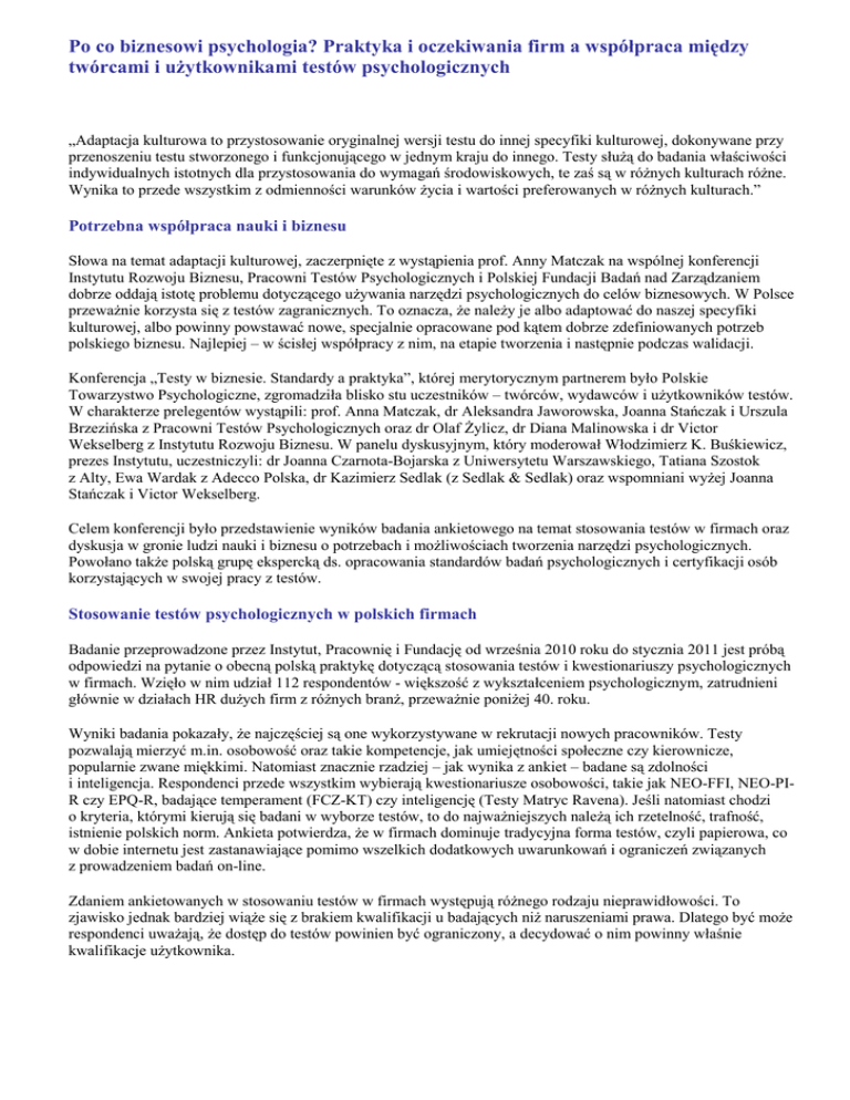 Po co biznesowi psychologia? Praktyka i oczekiwania firm a współpraca między twórcami i uŜytkownikami testów psychologicznych „Adaptacja kulturowa to przystosowanie oryginalnej wersji testu do innej specyfiki kulturowej, dokonywane przy przenoszeniu testu stworzonego i funkcjonującego w jednym kraju do innego. Testy słuŜą do badania właściwości indywidualnych istotnych dla przystosowania do wymagań środowiskowych, te zaś są w róŜnych kulturach róŜne. Wynika to przede wszystkim z odmienności warunków Ŝycia i wartości preferowanych w róŜnych kulturach.” Potrzebna współpraca nauki i biznesu Słowa na temat adaptacji kulturowej, zaczerpnięte z wystąpienia prof. Anny Matczak na wspólnej konferencji Instytutu Rozwoju Biznesu, Pracowni Testów Psychologicznych i Polskiej Fundacji Badań nad Zarządzaniem dobrze oddają istotę problemu dotyczącego uŜywania narzędzi psychologicznych do celów biznesowych. W Polsce przewaŜnie korzysta się z testów zagranicznych. To oznacza, Ŝe naleŜy je albo adaptować do naszej specyfiki kulturowej, albo powinny powstawać nowe, specjalnie opracowane pod kątem dobrze zdefiniowanych potrzeb polskiego biznesu. Najlepiej – w ścisłej współpracy z nim, na etapie tworzenia i następnie podczas walidacji. Konferencja „Testy w biznesie. Standardy a praktyka”, której merytorycznym partnerem było Polskie Towarzystwo Psychologiczne, zgromadziła blisko stu uczestników – twórców, wydawców i uŜytkowników testów. W charakterze prelegentów wystąpili: prof. Anna Matczak, dr Aleksandra Jaworowska, Joanna Stańczak i Urszula Brzezińska z Pracowni Testów Psychologicznych oraz dr Olaf śylicz, dr Diana Malinowska i dr Victor Wekselberg z Instytutu Rozwoju Biznesu. W panelu dyskusyjnym, który moderował Włodzimierz K. Buśkiewicz, prezes Instytutu, uczestniczyli: dr Joanna Czarnota-Bojarska z Uniwersytetu Warszawskiego, Tatiana Szostok z Alty, Ewa Wardak z Adecco Polska, dr Kazimierz Sedlak (z Sedlak & Sedlak) oraz wspomniani wyŜej Joanna Stańczak i Victor Wekselberg. Celem konferencji było przedstawienie wyników badania ankietowego na temat stosowania testów w firmach oraz dyskusja w gronie ludzi nauki i biznesu o potrzebach i moŜliwościach tworzenia narzędzi psychologicznych. Powołano takŜe polską grupę ekspercką ds. opracowania standardów badań psychologicznych i certyfikacji osób korzystających w swojej pracy z testów. Stosowanie testów psychologicznych w polskich firmach Badanie przeprowadzone przez Instytut, Pracownię i Fundację od września 2010 roku do stycznia 2011 jest próbą odpowiedzi na pytanie o obecną polską praktykę dotyczącą stosowania testów i kwestionariuszy psychologicznych w firmach. Wzięło w nim udział 112 respondentów - większość z wykształceniem psychologicznym, zatrudnieni głównie w działach HR duŜych firm z róŜnych branŜ, przewaŜnie poniŜej 40. roku. Wyniki badania pokazały, Ŝe najczęściej są one wykorzystywane w rekrutacji nowych pracowników. Testy pozwalają mierzyć m.in. osobowość oraz takie kompetencje, jak umiejętności społeczne czy kierownicze, popularnie zwane miękkimi. Natomiast znacznie rzadziej – jak wynika z ankiet – badane są zdolności i inteligencja. Respondenci przede wszystkim wybierają kwestionariusze osobowości, takie jak NEO-FFI, NEO-PIR czy EPQ-R, badające temperament (FCZ-KT) czy inteligencję (Testy Matryc Ravena). Jeśli natomiast chodzi o kryteria, którymi kierują się badani w wyborze testów, to do najwaŜniejszych naleŜą ich rzetelność, trafność, istnienie polskich norm. Ankieta potwierdza, Ŝe w firmach dominuje tradycyjna forma testów, czyli papierowa, co w dobie internetu jest zastanawiające pomimo wszelkich dodatkowych uwarunkowań i ograniczeń związanych z prowadzeniem badań on-line. Zdaniem ankietowanych w stosowaniu testów w firmach występują róŜnego rodzaju nieprawidłowości. To zjawisko jednak bardziej wiąŜe się z brakiem kwalifikacji u badających niŜ naruszeniami prawa. Dlatego być moŜe respondenci uwaŜają, Ŝe dostęp do testów powinien być ograniczony, a decydować o nim powinny właśnie kwalifikacje uŜytkownika. Powołanie polskiej grupy ds. opracowania standardów stosowania testów psychologicznych w biznesie OŜywiona dyskusja podczas konferencji, co nie zdarza się zbyt często na tego rodzaju spotkaniach, pokazała, jak bardzo temat stosowania testów psychologicznych w organizacjach jest waŜny dla kaŜdej ze stron – nauki i biznesu. Dobre narzędzia, tj. rzetelne, sprawdzone i zgodne ze standardami i normami etycznymi są bezwzględnie potrzebne. Tu zasadniczego sporu nie ma. Natomiast waŜne jest, aby dostępne w Polsce testy były dostosowane do naszej specyfiki kulturowej i słuŜyły pomocą w konkretnych działaniach np. specjalistów HR dotyczących rekrutacji czy rozwoju pracowników. Dlatego organizatorzy konferencji postanowili powołać Polską Grupę Ekspercką EFPA „EURO TEST – WO”. Jej zadaniem będzie opracowanie standardów stosowania testów w biznesie, zgodnie z wytycznymi Europejskiej Federacji Towarzystw Psychologicznych, a takŜe stworzenie systemu certyfikacji dla osób korzystających z tego rodzaju narzędzi badawczych, a nie będących psychologami. Do udziału w pracach grupy zgłosiło się ponad dwadzieścia osób spośród uczestników spotkania, zarówno psychologów, jak i przedstawicieli biznesu. To dobry znak na przyszłość dla specjalistów HR, headhunterów, trenerów i coachów, którym dobre, polskie testy są najbardziej potrzebne, oraz zapowiedź ściślejszego współdziałania w tym zakresie obu światów – nauki i biznesu. Patronat medialny nad badaniem i konferencją objęły: Biznes.wieszjak.pl, HRNews, Nowoczesna Firma, „Personel i Zarządzanie” i „Puls Biznesu”.