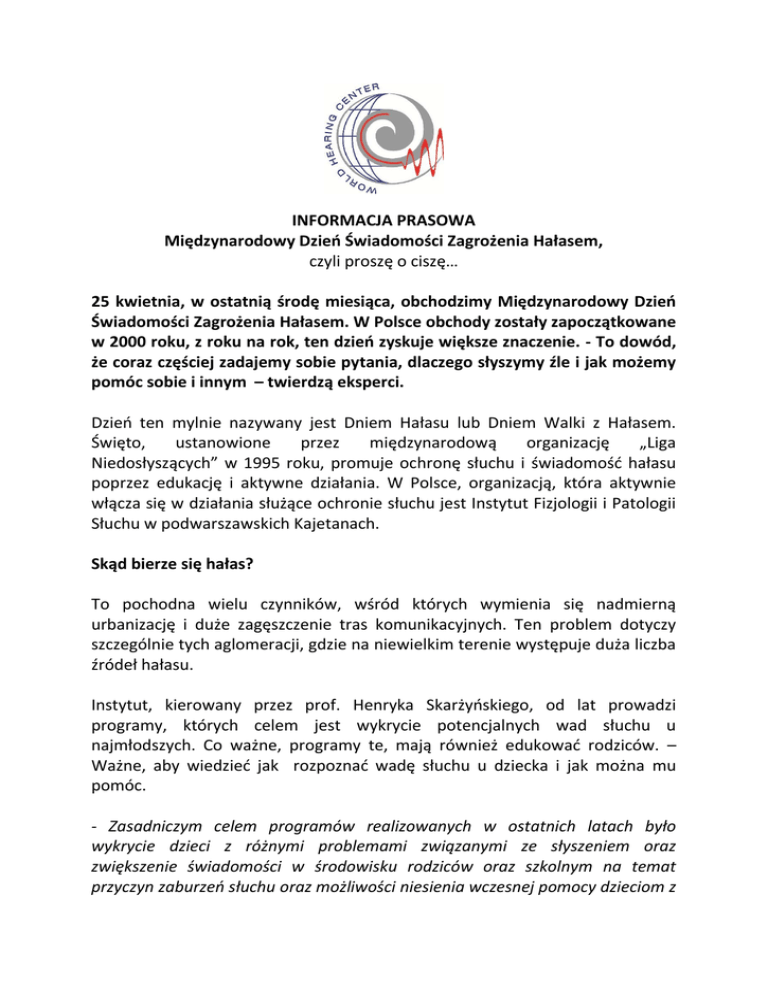 INFORMACJA PRASOWA Międzynarodowy Dzień Świadomości Zagrożenia Hałasem, czyli proszę o ciszę… 25 kwietnia, w ostatnią środę miesiąca, obchodzimy Międzynarodowy Dzień Świadomości Zagrożenia Hałasem. W Polsce obchody zostały zapoczątkowane w 2000 roku, z roku na rok, ten dzień zyskuje większe znaczenie. - To dowód, że coraz częściej zadajemy sobie pytania, dlaczego słyszymy źle i jak możemy pomóc sobie i innym – twierdzą eksperci. Dzień ten mylnie nazywany jest Dniem Hałasu lub Dniem Walki z Hałasem. Święto, ustanowione przez międzynarodową organizację „Liga Niedosłyszących” w 1995 roku, promuje ochronę słuchu i świadomość hałasu poprzez edukację i aktywne działania. W Polsce, organizacją, która aktywnie włącza się w działania służące ochronie słuchu jest Instytut Fizjologii i Patologii Słuchu w podwarszawskich Kajetanach. Skąd bierze się hałas? To pochodna wielu czynników, wśród których wymienia się nadmierną urbanizację i duże zagęszczenie tras komunikacyjnych. Ten problem dotyczy szczególnie tych aglomeracji, gdzie na niewielkim terenie występuje duża liczba źródeł hałasu. Instytut, kierowany przez prof. Henryka Skarżyńskiego, od lat prowadzi programy, których celem jest wykrycie potencjalnych wad słuchu u najmłodszych. Co ważne, programy te, mają również edukować rodziców. – Ważne, aby wiedzieć jak rozpoznać wadę słuchu u dziecka i jak można mu pomóc. - Zasadniczym celem programów realizowanych w ostatnich latach było wykrycie dzieci z różnymi problemami związanymi ze słyszeniem oraz zwiększenie świadomości w środowisku rodziców oraz szkolnym na temat przyczyn zaburzeń słuchu oraz możliwości niesienia wczesnej pomocy dzieciom z zaburzeniami słuchu. Unikalną cechą realizowanych programów było to, że badania wykonywano na terenie szkoły za pomocą urządzeń, które umożliwiają przesyłanie wyników badań bezpośrednio po ich wykonaniu, co w zdecydowany sposób ułatwia nadzór nad realizacją programu oraz ułatwia kontrolę jakości prowadzonych badań – mówi prof. Henryk Skarżyński, dyrektor Instytutu Fizjologii i Patologii Słuchu. W latach 2007-2014 eksperci z Instytutu przebadali ponad 410 tys. dzieci, głównie z klas pierwszych, zarówno mieszkańców terenów wiejskich, jak i dużych miast. Badania potwierdziły tezę, że odsetek dzieci z cechami zaburzeń słuchu spowodowanych hałasem, rośnie. Wnioskiem, a zarazem najważniejszym problemem jest to, że w grupie dzieci, u których lekarze podejrzewali zaburzenia słuchu, aż 72 proc. rodziców nie było świadomych problemu. Z tej grupy, tylko 27 proc. dzieci miało wcześniej wykonane badanie słuchu. To świadczy, jak ważne jest nagłaśnianie problemu. Pionierzy lepszego słyszenia Zespół ekspertów z Instytutu Fizjologii i Patologii Słuchu, we współpracy z licznymi ośrodkami krajowymi i zagranicznymi, stworzył podwaliny prowadzonych dziś badań przesiewowych. Dane, dzięki mobilnym urządzeniom, są wysyłane od razu do Instytutu, co ułatwia ich kontrolę i diagnozę. Ponadto, w odróżnieniu od badań prowadzonych w USA , są bardziej szczegółowe - bazują na ocenie progu słyszenia dla częstotliwości audiometrycznych, a nie tylko trzech wybranych tonów o określonych natężeniu. - To niewątpliwie wyróżnia Polskę na tle innych krajów, które prowadzą badania przesiewowe słuchu – tłumaczą eksperci.
