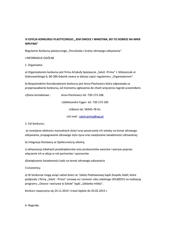 IV EDYCJA KONKURSU PLASTYCZNEGO ,,JEM OWOCE I WARZYWA, BO TO DOBRZE NA MNIE WPŁYWA" Regulamin Konkursu plastycznego ,,Pocztówka z krainy zdrowego odżywiania". I INFORMACJE OGÓLNE 1. Organizator. a) Organizatorem konkursu jest firma Artykuły Spożywcze ,,Salvit -Prima" J. Matyszczak ul. Dobrowolskiego 6, 80-286 Gdańsk zwana w dalszej części regulaminu ,,Organizatorem". b) Bezpośrednim Koordynatorem konkursu jest Anna Piechowicz która odpowiada za przeprowadzenie konkursu, od momentu ogłoszenia do chwili wręczenia nagród uczestnikom. c)Dane kontaktowe : Anna Piechowicz tel. 730-173-186 ci)Aleksandra Cygan tel. 730-173-185 cii)biuro tel. 58345-78-61. ciii) mail : [email protected] 2. Cel konkursu: a) rozwijanie zdolności manualnych dzieci oraz poszerzanie ich wiedzy na temat zdrowego odżywiania, propagowanie zdrowego stylu życia oraz zwiększanie świadomości zdrowotnej. b) integracja Dostawcy ze Społecznością szkolną c) aktywizacja lokalnych przedsiębiorców oraz producentów owoców i warzyw poprzez włączenie ich w akcję w roli partnerów i sponsorów d)zwiększanie świadomości ludzi na temat zdrowego odżywiania 3.Uczestnicy. a) W konkursie mogą wziąć udział dzieci ze Szkoły Podstawowej bądź Zespołu Szkół, które podpisały z firmą ,,Salvit - Prima" umowę na I semestr roku szkolnego 2014/2015 na realizację programu ,,Owoce i warzywa w Szkole" bądź ,,Szklanka mleka". Konkurs rozpoczyna się 24.11.2014 i trwać będzie do 20.02.2015 r. 4. Nagrody. a) W konkursie przewidziane są nagrody rzeczowe bądź bony towarowe oraz dyplomy b) Organizator zapewnia nagrody i dyplomy wszystkim uczestnikom konkursu, których prace trafią na konkurs i zostaną poddane ocenie Jury. c) Miejsca przyznawane będą wg kolejności : I,II II ex, III, III ex. , wyróżnienia w kategoriach ( ustala Jury podczas obrad jakie kategorie i ile wyróżnień), wyróżnienia indywidualne sponsorów ( dokonują sponsorzy), nagrody pocieszenia dla uczestników którzy nie zdobyli żadnego miejsca w konkursie. 5. Jury. a) Oceny prac konkursowych dokona Jury powołane przez Organizatora składające się z przedstawicieli władz samorządowych,niezależnych artystów plastyków, partnerów i sponsorów. II PRZEDMIOT KONKURSU 1.Przedmiotem konkursu jest wykonanie jednostronnej widokówki, której tematem przewodnim jest ,,Kraina zdrowego odżywiania", która ma za zadanie zachęcać do prowadzenia zdrowego stylu życia, zdrowego odżywiania, uprawiania sportu, zwiększania aktywności fizycznej, kreatywnego spędzania czasu na świeżym powietrzu itp. 2.Technika wykonania pracy jest dowolna. 3.Wymiary pracy : min. : 15 cm X 10 cm, max. 30 cm X 21 cm (A4) 4.Każda praca na odwrocie musi zawierać następujące informacje : Nazwę i adres Szkoły z której pochodzi praca, imię i nazwisko uczestnika, wiek oraz klasa, w której się znajduje ( wzór 1) III UCZESTNICY 1. Uczestnikami konkursu mogą być dzieci uczęszczające do klas 0-3 Szkoły Podstawowej. 2.Każdy z uczestników konkursu musi posiadać zgodę rodzica bądź prawnego opiekuna na udział w konkursie oraz na publikację prac w mediach oraz internecie (wzór 2). Zgoda powinna być nieodłącznym elementem pracy plastycznej umiejscowionym na jej odwrocie. IV ZASADY DOSTARCZENIA PRAC DO ORGANIZATORA 1. Ze względu na różnorodną liczebność uczniów w Szkołach Podstawowych ( w odniesieniu do liczby uczniów klas 0-III, objętych programem "Owoce i warzywa w Szkole" oraz "Szklanka mleka") zastosowano przelicznik: Szkoła może nadesłać prace w liczbie: do 50 uczniów - to Szkoła przysyła 5 prac plastycznych, i dalej... do 100 uczniów - 7 prac do 200 uczniów - 10 prac do 300 uczniów - 12 prac do 400 uczniów - 15 prac powyżej 500 uczniów 17 prac 2. Prace zbiorowe: Dozwolone jest aby autorem jednej pracy były maksymalnie dwie osoby. Z każdej Szkoły uczestnicy mogą przygotować maksymalnie 3 prace zbiorowe co jest składową ogólnej liczby dostarczanych prac ( jeśli w Szkole jest 50 uczniów to wg przelicznika mogą dostarczyć do Organizatora 5 prac z czego jeśli 3 będą pracami zbiorowymi to 2 będą to prace jednostek ). 3. Każda Szkoła zobowiązana jest dostarczyć listę uczestników konkursu wraz z pracami konkursowymi ( wzór 3) 4. Prace należy dostarczyć do firma Artykuły Spożywcze ,,Salvit- Prima" J. Matyszczak ul. Dobrowolskiego 6, 80-286 Gdańsk do dnia 27.02.2015 r. 5. Prace można przekazać przez Kierowcę Firmy ,,Salvit - Prima", który dostarczy je do siedziby Organizatora. Kierowca nie ponosi odpowiedzialności za przekazane prace. 6. Wszystkie prace niewłaściwie opisane bądź uszkodzone będą zdyskwalifikowane. 7. Jedyną drogą dostarczenia pracy na konkurs jest przekazanie jej przez Szkołę. Niedopuszczalne jest dostarczanie prac przez opiekunów bądź rodziców bez wiedzy i zgody Dyrekcji Szkoły. Prace dostarczone drogą ,,okrężną" będą zdyskwalifikowane. POSTANOWIENIA KOŃCOWE 1. Regulamin jest własnością intelektualną Organizatora i tylko on upoważniony jest do dokonywania jakichkolwiek zmian. 2. Niestosowanie się do regulaminu wyklucza uczestników z konkursu. 3. Konkurs zakończy się Galą finałową połączoną z konferencją w kwietniu 2015 r. Planowanym miejscem zakończenia akcji jest Stadion PGE Arena w Gdańsku. O szczegółach będą informowani Państwo na bieżąco.