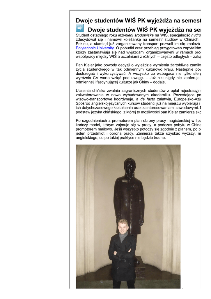 Dwoje studentów WIŚ PK wyjeżdża na semestr stu Dwoje studentów WIŚ PK wyjeżdża na semes Student ostatniego roku inżynierii środowiska na WIŚ, specjalność hydrotechni zdecydował się i namówił koleżankę na semestr studiów w Chinach. Wylat Pekinu, a stamtąd już zorganizowany transport pozwoli im się znaleźć pod s Polytechnic University. O pobudki oraz przebieg przygotowań zapytaliśmy go w którzy zastanawiają się nad wyjazdami organizowanymi w ramach programu współpracy między WIŚ a uczelniami z różnych – często odległych – zakątków ś Pan Kielar jako powody decyzji o wyjeździe wymienia żartobliwie zamiłowanie życia studenckiego w tak odmiennym kulturowo kraju. Następnie poważnie dostrzegać i wykorzystywać. A wszystko co wzbogaca nie tylko sferę indy wyróżnia CV warto wziąć pod uwagę. – Już nikt nigdy nie zaoferuje mi mo odmiennej i fascynującej kulturze jak Chiny – dodaje. Uczelnia chińska zwalnia zagranicznych studentów z opłat rejestracyjnej i za zakwaterowanie w nowo wybudowanym akademiku. Pozostające po stron wizowo-transportowe koordynuje, a de facto załatwia, Europejsko-Azjatycka Spośród angielskojęzycznych kursów studenci już na miejscu wybierają i deklar ich dotychczasowego kształcenia oraz zainteresowaniami zawodowymi. Dodatk podstaw języka chińskiego, z której to możliwości pan Kielar zamierza skorzysta Po uzgodnieniach z promotorem plan obrony pracy magisterskiej w lipcu poz kończy model, którym zajmuje się w pracy, a podczas pobytu w Chinach bę promotorem mailowo. Jeśli wszystko potoczy się zgodnie z planem, po powroc jeden przedmiot i obrona pracy. Zamierza także uzyskać wyższy, niż obe angielskiego, co po takiej praktyce nie będzie trudne. Życzymy powodz Życzymy powodz wyjazdach! data publikacji: 26.02.2016 r. przez: Monika Piaskowska, 1051 odsłon © Wydział Inżynierii Środowiska http://www.wis.pk.edu.pl/