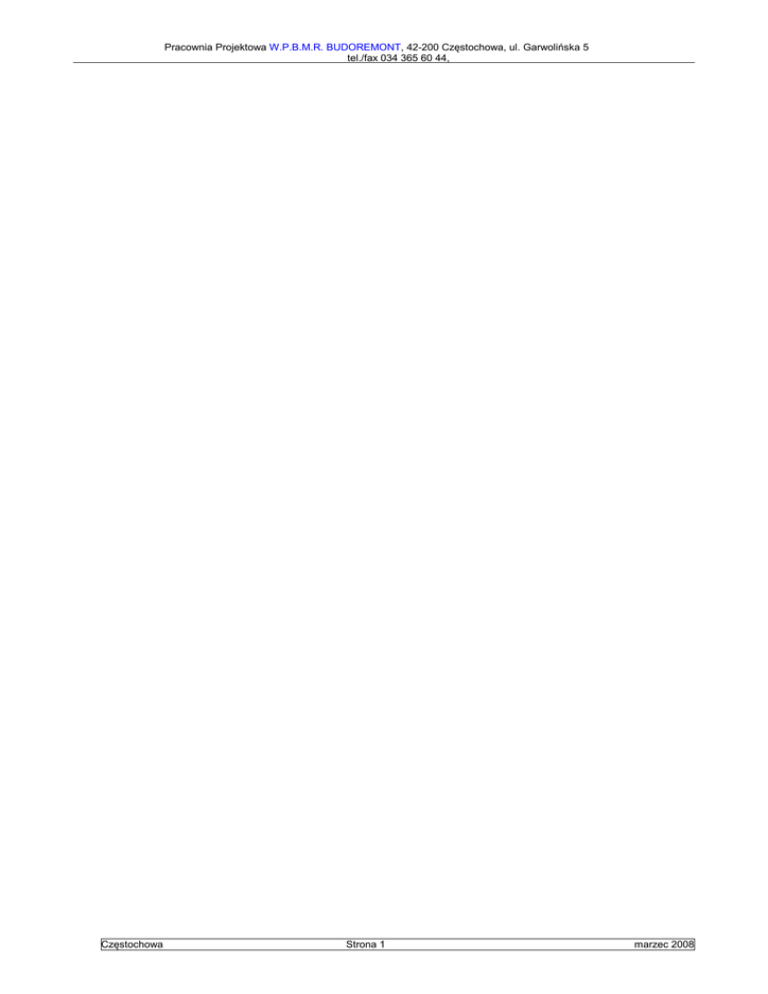 Pracownia Projektowa W.P.B.M.R. BUDOREMONT, 42-200 Częstochowa, ul. Garwolińska 5 tel./fax 034 365 60 44, Częstochowa Strona 1 marzec 2008 Pracownia Projektowa W.P.B.M.R. BUDOREMONT, 42-200 Częstochowa, ul. Garwolińska 5 tel./fax 034 365 60 44, ZAWARTOŚĆ OPRACOWANIA A A A A 1. 2. 3. 4. Częstochowa Charakterystyka formalna. Dane ogólne obiektu. Dane konstrukcyjno - materiałowe Zakres prac remontowych Strona 2 marzec 2008 Pracownia Projektowa W.P.B.M.R. BUDOREMONT, 42-200 Częstochowa, ul. Garwolińska 5 tel./fax 034 365 60 44, A 1. Charakterystyka formalna. 1.1. Dane ewidencyjne: Obiekt: Szkoła Podstawowa nr 48 Częstochowa, ul. Schillera 5 Stadium: Dokumentacja projektowo kosztorysowa Inwestor: Urząd Miasta Częstochowy Częstochowa, ul. Śląska 11/13 A 2. Dane ogólne obiektu. Budynki będące przedmiotem niniejszego opracowania znajdują się w Częstochowie przy ul. Schillera 5. Budynek pływalni Szkoły Podstawowej jest obiektem jednokondygnacyjnym, wolnostojącym, wykonanym w konstrukcji stalowej. Dane techniczne budynku pływalni: pow. uŜytkowa 548,30 m2 pow. zabudowy 569,40 m2 kubatura 4190,78 m3 A 3. Dane konstrukcyjno - materiałowe - fundamenty – ławy i stopy fundamentowe Ŝelbetowe konstrukcja nośna – słupy stalowe obudowane blachą, częściowo murowane, ściany działowe – technologia tradycyjna, cegła na zaprawie cementowej, stropodach – stropodach stalowy, rygle oparte na słupach na których opieraja się płatwie do których przymocowana jest blacha, poszycie – blacha trapezowa, okładzina zewnętrzna – blacha trapezowa, tynki wewnętrzne – cementowo – wapienne, podłogi i posadzki – płytki gresowe Instalacje: - wodociągowa, - kanalizacji sanitarnej, - kanalizacji deszczowej, Częstochowa Strona 3 marzec 2008 Pracownia Projektowa W.P.B.M.R. BUDOREMONT, 42-200 Częstochowa, ul. Garwolińska 5 tel./fax 034 365 60 44, - centralnego ogrzewania z węzła cieplnego, wentylacji mechanicznej, elektryczna, odgromowa, A 4. Zakres prac remontowych Na podstawie oględzin uznano za pilne przeprowadzenie następujących prac remontowych: - odczyszczenie i pomalowanie konstrukcji stalowej budynku pływalni, - wymiana płytek ceramicznych przybasenia, 4.1. Renowacja konstrukcji stalowej budynku pływalni Do renowacji przewidziano konstrukcję stalowa budynku pływalni. Zaklasyfikowano do renowacji: główne słupy nośne rygle stalowe płatwie stalowe belki stalowe kątowniki /stęŜenia/ pręty /stęŜenia/ blachy stalowe /mocowania stęŜeń/ blacha/profil /mocowanie oświetlenia/ 14 szt. 6 szt. 7 szt. 4 szt. 24 szt 11 szt 48 szt 8 szt Łącznie do renowacji zaklasyfikowano 582,33 m2 konstrukcji stalowej Przewidziano renowację elementów stalowych budynku pływalni poprzez oczyszczenie poszczególnych elementów, a następnie pokrycie ich odpowiednią farbą. Zakres prac: - Częstochowa zabezpieczenie podłoŜa oraz okien i drzwi ustawienie rusztowań czyszczenie elementów stalowych nałoŜenie warstwy farby podkładowej /dwie warstwy/ np. technologia firmy NOBILES nałoŜenie warstwy zasadniczej farby /dwie warstwy/ np. technologia firmy NOBILES nałoŜenie warstwy termoodpornej p.poŜ /dwie warstwy/ np. technologia firmy NOBILES Strona 4 marzec 2008 Pracownia Projektowa W.P.B.M.R. BUDOREMONT, 42-200 Częstochowa, ul. Garwolińska 5 tel./fax 034 365 60 44, Schemat konstrukcji stalowej krytej pływalni- rys. 1 - 4 Wykaz elementów objętych renowacją, wg tab. Nr 1. Elementy objęte renowacją przedstawiają fotografie. 4.2. Wymiana płytek ceramicznych plaŜy basenu: Przewiduje się wymianę wszystkich płytek ceramicznych przybasenia – łączna powierzchnia 271,50m2. Zakres prac: - demontaŜ istniejących płytek, - demontaŜ innych urządzeń, - przygotowanie podłoŜa, - zaizolowanie podłoŜa, - połoŜenie nowych płytek gresowych z atestem antypoślizgowym. Widok i przekrój przybasenia przedstawiają rys. nr 2, 4. Częstochowa Strona 5 marzec 2008 Pracownia Projektowa W.P.B.M.R. BUDOREMONT, 42-200 Częstochowa, ul. Garwolińska 5 tel./fax 034 365 60 44, DOKUMENTACJA FOTOGRAFICZNA Częstochowa Strona 6 marzec 2008 Pracownia Projektowa W.P.B.M.R. BUDOREMONT, 42-200 Częstochowa, ul. Garwolińska 5 tel./fax 034 365 60 44, Nr 1. Widok ściany Pd Nr 2. Widok dachu i ściany Pd Częstochowa Strona 7 marzec 2008 Pracownia Projektowa W.P.B.M.R. BUDOREMONT, 42-200 Częstochowa, ul. Garwolińska 5 tel./fax 034 365 60 44, Nr 3. NaroŜnik Pd-W Nr 4. Widok przybasenia i niecki basenu Częstochowa Strona 8 marzec 2008 Pracownia Projektowa W.P.B.M.R. BUDOREMONT, 42-200 Częstochowa, ul. Garwolińska 5 tel./fax 034 365 60 44, Nr 5. Widok dachu /wentylacja, oświetlenie, stęŜenia/ Nr 6. Korozja Częstochowa Strona 9 marzec 2008 Pracownia Projektowa W.P.B.M.R. BUDOREMONT, 42-200 Częstochowa, ul. Garwolińska 5 tel./fax 034 365 60 44, Nr 7. Widok dachu, naroŜnik Pn-Z /stęŜenia/ Nr 8. Korozja Częstochowa Strona 10 marzec 2008 Pracownia Projektowa W.P.B.M.R. BUDOREMONT, 42-200 Częstochowa, ul. Garwolińska 5 tel./fax 034 365 60 44, Nr 9. Widok dachu, naroŜnik PN-W /stęŜenia, wentylacja/ Nr 10. Widok dachu, naroŜnik PN-W /korozja/ Częstochowa Strona 11 marzec 2008 Pracownia Projektowa W.P.B.M.R. BUDOREMONT, 42-200 Częstochowa, ul. Garwolińska 5 tel./fax 034 365 60 44, Nr 11. Ściana wschodnia - korozja Nr 12. Płytki na przybaseniu – część południowa Częstochowa Strona 12 marzec 2008 Pracownia Projektowa W.P.B.M.R. BUDOREMONT, 42-200 Częstochowa, ul. Garwolińska 5 tel./fax 034 365 60 44, Nr 13. Płytki na przybaseniu – część wschodnia Nr 14. Płytki na przybaseniu – część zachodnia Częstochowa Strona 13 marzec 2008 Pracownia Projektowa W.P.B.M.R. BUDOREMONT, 42-200 Częstochowa, ul. Garwolińska 5 tel./fax 034 365 60 44, Nr 15. Płytki na przybaseniu – kratka ściekowa Nr 16. Widok z zewnątrz - naroŜnik Pn-W Częstochowa Strona 14 marzec 2008 Pracownia Projektowa W.P.B.M.R. BUDOREMONT, 42-200 Częstochowa, ul. Garwoli