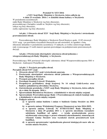 Protokół Nr XXV/2016 z XXV Sesji Rady Miejskiej w Strykowie, która odbyła się w dniu 23 września 2016 r. w siedzibie domu kultury w Strykowie W posiedzeniu uczestniczyli: radni Rady Miejskiej w Strykowie wg listy obecności, przewodniczący Zarządów osiedli m. Stryków wg listy obecności, sołtysi wg listy obecności, osoby zaproszone wg listy obecności. Ad pkt. 1 Otwarcie obrad XXV Sesji Rady Miejskiej w Strykowie i stwierdzenie prawomocności obrad. Przewodniczący Rady Miejskiej w Strykowie Paweł Kasica o godz. 12.05 otworzył XXV sesję i po powitaniu wszystkich obecnych na sali stwierdził, że zgodnie z listą obecności aktualnie w posiedzeniu uczestniczy 15 radnych, co wobec ustawowego składu rady wynoszącego 15 osób stanowi quorum pozwalające na podejmowanie prawomocnych decyzji. Ad pkt. 2 Powierzenie obowiązków sekretarza obrad jednemu z wiceprzewodniczących Rady Miejskiej w Strykowie. Przewodniczący RM powierzył obowiązki sekretarza obrad Wiceprzewodniczącemu RM w Strykowie Andrzejowi Pożarlikowi. Ad pkt. 3 Przyjęcie porządku obrad. Porządek obrad XXV sesji: 1. Otwarcie obrad XXV sesji i stwierdzenie quorum. 2. Powierzenie obowiązków sekretarza obrad jednemu z Wiceprzewodniczących Rady Miejskiej w Strykowie. 3. Przyjęcie porządku obrad. 4. Powołanie Komisji Uchwał i Wniosków. 5. Perspektywa przebudowy drogi krajowej Nr 14 relacji Łódź-Łowicz oraz budowy południowej obwodnicy Strykowa. 6. Zatwierdzenie protokołu z XXIV sesji Rady Miejskiej w Strykowie, która odbyła się w dniu 26 sierpnia 2016 r. 7. Sprawozdanie Burmistrza Strykowa z działalności w okresie między sesjami. 8. Sprawozdanie Przewodniczącego Rady i Przewodniczących stałych komisji rady z działalności w okresie między sesjami. 9. Podjęcie uchwał: a) w sprawie zmian budżetu i zmian w budżecie Gminy Stryków na 2016 rok, b) w sprawie zmiany Wieloletniej Prognozy Finansowej na lata 2016-2025, c) w sprawie zmiany Uchwały Nr XVIII/132/2011 Rady Miejskiej w Strykowie z dnia 29 grudnia 2011 r. w sprawie określenia warunków udzielania bonifikat od opłaty z tytułu przekształcenia prawa użytkowania wieczystego w prawo własności nieruchomości, stanowiących własność Gminy Stryków oraz wysokości stawek procentowych tych bonifikat, d) w sprawie sprostowania i ujednolicenia pisowni istniejących nazw ulic na terenie miasta Stryków, 1 e) w sprawie nadania nazwy ulicy położonej na terenie miasta Strykowa, f) w sprawie nadania nazwy ulicom w miejscowości Anielin Swędowski, g) w sprawie rozpatrzenia skargi na działanie Burmistrza Strykowa. 10. Interpelacje i zapytania radnych. 11. Wolne wnioski i sprawy różne. 12. Przyjęcie protokołu Komisji Uchwał i Wniosków. 13. Zamknięcie obrad. Głosowanie nad porządkiem obrad: 14 głosów za bez głosów przeciwnych i 0 głosów wstrzymujących się Ad pkt. 4 Powołanie Komisji Uchwał i Wniosków. Do pracy w Komisji Uchwał i Wniosków zgodę wyrazili następujący radni: 1) Krzysztof Bandurowicz , 2) Damian Drzewiecki, 3) Dariusz Dziewulski. Głosowanie nad powołaniem Komisji Uchwał i Wniosków w w/w składzie: 14 głosów za bez głosów przeciwnych i 1 głos wstrzymujący się. Ad. pkt. 5 Perspektywa przebudowy drogi krajowej Nr 14 relacji Łódź-Łowicz oraz budowy południowej obwodnicy Strykowa. Przewodniczący Rady Miejskiej w Strykowie poinformował, że na dzisiejsze posiedzenie rady zostali zaproszeni wszyscy posłowie z naszego okręgu wyborczego. Obecny jest tylko Pan Sebastian Szulc asystent posła Pana Artura Dunina. Z zaproszenia nie skorzystał minister Infrastruktury i Budownictwa. Z Oddziału Łódzkiego Generalnej Dyrekcji Dróg Krajowych i Autostrad przybył na posiedzenie rady Pan Marek Brodowski – Naczelnik Wydziału Inwestycji. Przewodniczący Rady Miejskiej w Strykowie przywitał zaproszonych gości. Pan Andrzej Jankowski Burmistrz Strykowa dokonując wprowadzenia do tego punktu porządku obrad mówił o zrealizowanej już północnej obwodnicy Strykowa natomiast miejscowy plan zagospodarowania przestrzennego gminy Stryków przewiduje również tzw. obwodnice południową.. Zarówno oddalająca się perspektywa przebudowy drogi krajowej jak również brak obwodnicy w tym rejonie uniemożliwia uruchomienie kolejnych terenów inwestycyjnych w gminie Stryków. Jest to pierwsze spotkanie w tym temacie, mamy nadzieję, że na kolejne będą mogli przybyć zaproszeni na dziś a nieobecni posłowie z naszego okręgu wyborczego. Ogromną uciążliwość dla mieszkańców terenów przyległych stworzyła otwarta autostrada A 1 ze względu na emitowany hałas. W tej sprawie odbędzie się również w najbliższym czasie spotkanie zainteresowanych przedstawicieli gmin. Pan Marek Brodowski Naczelnik Wydziału Inwestycji w Oddz. Łódzkim GDDK i A mówił o tym, że Oddział Łódzki GDDK i A od zawsze widział potrzebę przebudowy drogi krajowej Nr 14 zanim w planach pojawiła się budowa A 2 DO Warszawy. Dla takiej inwestycji jest gotowy projekt oraz cała dokumentacja techniczna i wykupiony teren pod realizację inwestycji. To co udało się zrealizować do tej pory to rondo w Sosnowcu. W związku z oddalającą się perspektywą przebudowy drogi Nr 14 dokumentacja stała się nieaktualna. Należy uaktualnić ją pod kątem bezpieczeństwa i przystosować do wymogów Unii Europejskiej. Termin przebudowy drogi Nr 14 jest odsuwany przez centralę generalnej dyrekcji i podyktowany jest z ich strony budową i otwarciem autostrady A 1 w kierunku południowym. 2 Obwodnica południowa jest nową pozycją, która nigdy nie była na liście ani w ministerstwie ani w planach generalnej dyrekcji, w związku z czym budowa obwodnicy jest mało realna. Co roku wykazywana jest ze strony oddziału łódzkiego potrzeba przebudowy drogi Nr 14.Być może wsparcie ze strony parlamentarzystów pomoże w rozwiązaniu tego problemu. Radny Bogdan Walczak mówił, że czuje się lekceważony takim postępowaniem Gener
