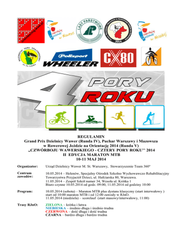 REGULAMIN Grand Prix Dzielnicy Wawer (Runda IV), Puchar Warszawy i Mazowsza w Rowerowej Jeździe na Orientację 2014 (Runda V) „CZWÓRBOJU WAWERSKIEGO - CZTERY PORY ROKU’’ 2014 II EDYCJA MARATON MTB 10-11 MAJ 2014 Organizator: Urząd Dzielnicy Wawer M. St. Warszawy, Stowarzyszenie Team 360° Centrum zawodów: 10.05.2014 – Helenów, Specjalny Ośrodek Szkolno Wychowawczo Rehabilitacyjny Towarzystwa Przyjaciół Dzieci, ul. Hafciarska 80, Warszawa. 11.05.2014 – Zespół Szkół numer 34, Wesoła ul. Krótka 1 Biuro czynne 10.05.2014 od godz. 09:00, 11.05.2014 od godziny 10:00 Program: 10.05.2014 (sobota) – Maraton MTB plus dystans klasyczny (start interwałowy ) start od 10:00 maraton MTB i od 12:00 zawody w RJnO. 11.05.2014 (niedziela) – scorelauf (start masowy/interwałowy, 11:00) Trasy RJnO: ZIELONA – krótka i łatwa NIEBIESKA – średnio długa i średnio trudna CZERWONA – dość długa i dość trudna CZARNA – bardzo długa i bardzo trudna Zalecane trasy Rok urodzenia Panie Panowie Rok urodzenia Panie Panowie RJnO: 2002 i później K12 M12 1965–1974 K40 M40 2000–2001 K14 M14 1955–1964 K50 M50 1997–1999 K17 M17 1945–1954 K60 M60 1994–1996 K20 M20 1944 i później K70 M70 1975–1993 K21 M21 Są to tylko zalecane trasy, wystartować można na dowolnej. Szczegóły klasyfikacji generalnej można znaleźć w regulaminie na stronie www.orienteering.waw.pl Kategorie i długości tras maraton MTB: do lat 9 dziewcząt i chłopców (rok ur. 2005 i młodsze) 2,5 km do lat 12 dziewcząt i chłopców (rok ur. 2004-2002) 2,5 km do lat 16 dziewcząt i chłopców (rok ur. 2001-1998) 10,0 km do lat 19 dziewcząt i chłopców (rok ur. 1997-1995) 15,0 km do lat 40 kobiet i mężczyzn (rok ur. 1994-1974) 20,0 km do lat 60 kobiet i mężczyzn (rok ur. 1973-1954) 15,0 km powyżej lat 60 kobiet i mężczyzn (rok ur. 1953 i starsi) 10,0 km Program maraton MTB: 09:00-10:00 10:00 10:00 10:30 12:00 Zgłoszenia: Do 09.05.2014 (piątek) do godziny 13:00 za pomocą formularza na stronie www.orienteering.waw.pl lub na adres [email protected] (w zgłoszeniu należy obowiązkowo podać rok urodzenia) Wpisowe: Maraton MTB– start bezpłatny. Zawody w RJnO: Zgłoszenia w terminie poprzez stronę www.orienteering.waw.pl 10 zł/za 1 start Zgłoszenia w terminie poprzez e-mail [email protected] 15 zł/za 1 start Zgłoszenia w dniu zawodów /w miarę posiadanych map/ 20 zł/za 1 start Osoby zgłoszone, a nie startujące 5 zł/za 1 start Mapy i teren: Specjalistyczne mapy do rowerowej jazdy na orientację w skali od 1:7 500 do 1:20 000, e-2.5m. Aktualność: wiosna 2014. Numer startowy: Każdy zawodnik otrzyma imienny numer startowy, który obowiązuje podczas całego cyklu Mistrzostw. Wydanie duplikatu numeru za opłatą 5 PLN. Obowiązki uczestników: Zawodnicy muszą posiadać kaski ochronne. Dzieci do lat 10 i nie posiadający karty rowerowej muszą przebywać pod opieką dorosłych. Potwierdzanie punktów: Karta startowa Klasyfikacja: Prowadzona będzie w poszczególnych kategoriach wiekowych w postaci rankingu zgodnie z Regulaminem Pucharu Warszawy i Mazowsza oraz Grand Prix Dzielnicy Wawer M. St. Warszawy zamieszczonym na stronie www.orienteering.waw.pl Numer maraton MTB: Każdy zawodnik zgłoszony w terminie otrzyma imienny numer startowy. Osoby nie zgłoszone dostaną numer startowy bez imienia i nazwiska. 1 okrążenie 1 okrążenie 2 okrążenia 3 okrążenia 4 okrążenia 3 okrążenia 2 okrążenia rejestracja, odbiór numerów startowych start na dystansie 2,5 km do lat 9 dziewcząt i chłopców start na dystansie 5,0 km do lat 12 dziewcząt i chłopców start na dystansie 10, 15 km pozostałe kategorie wiekowe uroczyste zakończenie. Trasy maraton Wyznakowana w terenie biało-czerwonymi taśmami oraz dodatkowo znakami MTB: informującymi o kierunku jazdy. Pętla o długości 2,5 km /kolor żółty na schemacie/ Pętla o długości 5 km. /kolor niebieski na schemacie/ Startujący na dystansie 2,5 km pokonują jeden lub dwa razy pętle żółtą o długości 2,5 km, startujący w pozostałych kategoriach pokonują pętle niebieską o długości 5,0 km w ilości podanej w punkcie kategorie i długości tras. Nagrody: Podsumowanie zawodów i wręczenie nagród nastąpi w dniu16.11.2014 r. Specjalna nagroda w postaci losowania jednego lub dwóch rowerów firmy Wheeler wśród osób, które wystartują w minimum jednym etapie w 9 rundach cyklu, za każdy start powyżej, zawodnik otrzymuję dodatkowy kupon biorący udział w losowaniu. Jedna osoba maksymalnie może mieć 4 kupony biorące udział w losowaniu. rowerów. Klasyfikacja maraton MTB: Prowadzona będzie w poszczególnych kategoriach wiekowych w postaci rankingu zgodnie z Regulaminem Czwórboju Wawerskiego "Cztery Pory Roku" zamieszczonym na stronie www.orienteering.waw.pl Nagrody Maraton MTB: Medale za miejsca 1-3 w każdej grupie wiekowej Schemat tras i centrum Maraton MTB: Serdecznie zapraszamy do udziału wszystkie osoby posiadające rower. Więcej informacji na: www.orienteering.waw.pl www.wawer.warszawa.pl www.team360.pl