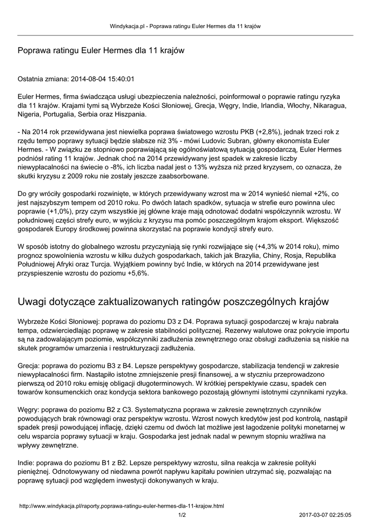Windykacja.pl - Poprawa ratingu Euler Hermes dla 11 krajów Poprawa ratingu Euler Hermes dla 11 krajów Ostatnia zmiana: 2014-08-04 15:40:01 Euler Hermes, firma świadcząca usługi ubezpieczenia należności, poinformował o poprawie ratingu ryzyka dla 11 krajów. Krajami tymi są Wybrzeże Kości Słoniowej, Grecja, Węgry, Indie, Irlandia, Włochy, Nikaragua, Nigeria, Portugalia, Serbia oraz Hiszpania. - Na 2014 rok przewidywana jest niewielka poprawa światowego wzrostu PKB (+2,8%), jednak trzeci rok z rzędu tempo poprawy sytuacji będzie słabsze niż 3% - mówi Ludovic Subran, główny ekonomista Euler Hermes. - W związku ze stopniowo poprawiającą się ogólnoświatową sytuacją gospodarczą, Euler Hermes podniósł rating 11 krajów. Jednak choć na 2014 przewidywany jest spadek w zakresie liczby niewypłacalności na świecie o -8%, ich liczba nadal jest o 13% wyższa niż przed kryzysem, co oznacza, że skutki kryzysu z 2009 roku nie zostały jeszcze zaabsorbowane. Do gry wróciły gospodarki rozwinięte, w których przewidywany wzrost ma w 2014 wynieść niemal +2%, co jest najszybszym tempem od 2010 roku. Po dwóch latach spadków, sytuacja w strefie euro powinna ulec poprawie (+1,0%), przy czym wszystkie jej główne kraje mają odnotować dodatni współczynnik wzrostu. W południowej części strefy euro, w wyjściu z kryzysu ma pomóc poszczególnym krajom eksport. Większość gospodarek Europy środkowej powinna skorzystać na poprawie kondycji strefy euro. W sposób istotny do globalnego wzrostu przyczyniają się rynki rozwijające się (+4,3% w 2014 roku), mimo prognoz spowolnienia wzrostu w kilku dużych gospodarkach, takich jak Brazylia, Chiny, Rosja, Republika Południowej Afryki oraz Turcja. Wyjątkiem powinny być Indie, w których na 2014 przewidywane jest przyspieszenie wzrostu do poziomu +5,6%. Uwagi dotyczące zaktualizowanych ratingów poszczególnych krajów Wybrzeże Kości Słoniowej: poprawa do poziomu D3 z D4. Poprawa sytuacji gospodarczej w kraju nabrała tempa, odzwierciedlając poprawę w zakresie stabilności politycznej. Rezerwy walutowe oraz pokrycie importu są na zadowalającym poziomie, współczynniki zadłużenia zewnętrznego oraz obsługi zadłużenia są niskie na skutek programów umarzenia i restrukturyzacji zadłużenia. Grecja: poprawa do poziomu B3 z B4. Lepsze perspektywy gospodarcze, stabilizacja tendencji w zakresie niewypłacalności firm. Nastąpiło istotne zmniejszenie presji finansowej, a w styczniu przeprowadzono pierwszą od 2010 roku emisję obligacji długoterminowych. W krótkiej perspektywie czasu, spadek cen towarów konsumenckich oraz kondycja sektora bankowego pozostają głównymi istotnymi czynnikami ryzyka. Węgry: poprawa do poziomu B2 z C3. Systematyczna poprawa w zakresie zewnętrznych czynników powodujących brak równowagi oraz perspektyw wzrostu. Wzrost nowych kredytów jest pod kontrolą, nastąpił spadek presji powodującej inflację, dzięki czemu od dwóch lat możliwe jest łagodzenie polityki monetarnej w celu wsparcia poprawy sytuacji w kraju. Gospodarka jest jednak nadal w pewnym stopniu wrażliwa na wpływy zewnętrzne. Indie: poprawa do poziomu B1 z B2. Lepsze perspektywy wzrostu, silna reakcja w zakresie polityki pieniężnej. Odnotowywany od niedawna powrót napływu kapitału powinien utrzymać się, pozwalając na poprawę sytuacji pod względem inwestycji dokonywanych w kraju. http://www.windykacja.pl/raporty,poprawa-ratingu-euler-hermes-dla-11-krajow.html 1/2 2017-03-07 02:25:05 Windykacja.pl - Poprawa ratingu Euler Hermes dla 11 krajów Irlandia: poprawa do poziomu BB2 z BB3. Lepsze perspektywy gospodarcze oraz spadek liczby niewypłacalności od 2013, choć ich poziom jest nadal wysoki. Osiągnięto niezależność finansową, zakończono restrukturyzację sektora bankowego, jednak gospodarka nadal wykazuje wrażliwość na wpływy zewnętrzne. W średniej perspektywie czasu, wyzwaniem pozostaje nadmierne zadłużenie. Włochy: poprawa do poziomu A2 z A3. Lepsze perspektywy gospodarcze oraz przewidywany spadek liczby niewypłacalności począwszy od drugiej połowy 2014 roku. Firmy powinny skorzystać ze wzrostu kredytów i wydatków konsumenckich, przewidywanego na 2015 rok. Kraj wkracza w okres stabilności politycznej, jednakże w średniej perspektywie czasu nadal stoją przed nim wyzwania. Nikaragua: poprawa do poziomu D3 z D4. Nastąpiła poprawa polityki fiskalnej. Szeroko zakrojone reformy podatkowe wdrożone w 2012 roku doprowadziły do poprawy ściągalności podatków i obsługi administracyjnej, nałożono ograniczenia w zakresie wydatków oraz poprawił się poziom przychodów z tytułów podatkowych. Poziom wrażliwości na czynniki zewnętrzne jest jednak nadal wysoki. Nigeria: poprawa do poziomu D3 z D4. W największej gospodarce Afryki, poprawie do właściwego poziomu uległy wskaźniki płynności zewnętrznej oraz zadłużenia, wzrost PKB jest stabilny, dzięki czemu odnotowano poprawę w zakresie ryzyka krótkoterminowego. Na perspektywach średnioterminowych waży jednak szereg czynników wrażliwości, takich jak ryzyko dla bezpieczeństwa osobistego i bezpieczeństwa firm, jak również słabe środowisko biznesowe. Portugalia: poprawa do poziomu B2 z B3. Lepsze perspektywy gospodarcze dzięki poprawie popytu krajowego i eksportu, głównie dzięki zwiększonej konkurencyjności. Od 2013 roku występuje spadek liczby niewypłacalności. Z punktu widzenia wysokiego zadłużenia publicznego oraz deficytu fiskalnego, wyjście ze wspólnego programu UE/IMF (Międzynarodowego Funduszu Walutowego) w maju jest problematyczne. Prognozowana stopa inflacji ma utrzymywać się na bardzo niskim poziomie, co może utrudniać oddłużenie sektorów publicznego i prywatnego. Serbia: poprawa do poziomu D3 z D4. Gospodarka wydobyła się z recesji. Kurs wymiany waluty ustabilizował się, a inflacja ma utrzymywać się na niskim poziomie do 2015 roku. Rezerwy walutowe są na od