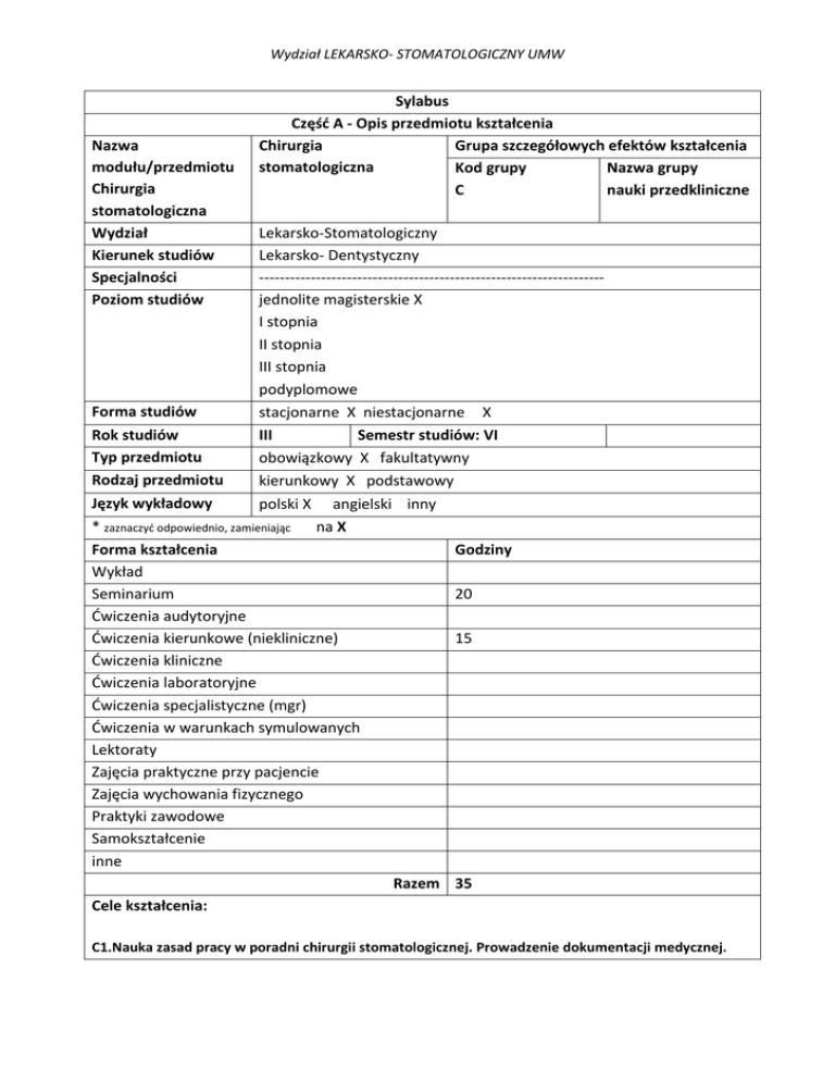 Wydział LEKARSKO- STOMATOLOGICZNY UMW Nazwa modułu/przedmiotu Chirurgia stomatologiczna Wydział Kierunek studiów Specjalności Poziom studiów Forma studiów Rok studiów Typ przedmiotu Rodzaj przedmiotu Język wykładowy Sylabus Część A - Opis przedmiotu kształcenia Chirurgia Grupa szczegółowych efektów kształcenia stomatologiczna Kod grupy Nazwa grupy C nauki przedkliniczne Lekarsko-Stomatologiczny Lekarsko- Dentystyczny ------------------------------------------------------------------jednolite magisterskie X I stopnia II stopnia III stopnia podyplomowe stacjonarne X niestacjonarne X III Semestr studiów: VI obowiązkowy X fakultatywny kierunkowy X podstawowy polski X angielski inny na X * zaznaczyć odpowiednio, zamieniając Forma kształcenia Wykład Seminarium Ćwiczenia audytoryjne Ćwiczenia kierunkowe (niekliniczne) Ćwiczenia kliniczne Ćwiczenia laboratoryjne Ćwiczenia specjalistyczne (mgr) Ćwiczenia w warunkach symulowanych Lektoraty Zajęcia praktyczne przy pacjencie Zajęcia wychowania fizycznego Praktyki zawodowe Samokształcenie inne Godziny 20 15 Razem 35 Cele kształcenia: C1.Nauka zasad pracy w poradni chirurgii stomatologicznej. Prowadzenie dokumentacji medycznej. Wydział LEKARSKO- STOMATOLOGICZNY UMW Zapoznanie studentów z zasadami aseptyki i antyseptyki. C3. Nauka przeprowadzania podmiotowego i przedmiotowego badania pacjenta z uwzględnieniem aspektów chirurgicznych. Zapoznanie studentów z zasadami kwalifikacji pacjentów do leczenia chirurgicznego w warunkach ambulatoryjnych i szpitalnych. Omówienie zasad współpracy z lekarzami innych specjalności. C3. Nauka postępowania z pacjentem przed- i pozabiegowego w przypadku leczenia chirurgicznego w warunkach ambulatoryjnych. C4. Opanowanie wiedzy z zakresu zastosowania znieczuleń miejscowych w chirurgii stomatologicznej – środki znieczulające i techniki znieczulenia. C5. Zapoznanie studentów z instrumentarium chirurgicznym. Nauka zasad i technik usuwania zębów. Macierz efektów kształcenia dla modułu/przedmiotu w odniesieniu do metod weryfikacji zamierzonych efektów kształcenia oraz formy realizacji zajęć: Numer Numer Metody weryfikacji Forma zajęć Student, który zaliczy efektu efektu dydaktycznych osiągnięcia zamierzonych kształcenia kształcenia moduł/przedmiot efektów kształcenia przedmiot kierunkow wie/umie/potrafi (formujące i podsumowujące) ** wpisz symbol zna zasady przeprowadzenia znieczulenia miejscowego tkanek narządu żucia odpowiedź ustna test SE (F.W 15) zna i rozumie podstawy antybiotykoterapii i oporności przeciwbakteryjnej odpowiedź ustna test SE W 03 - (F.W19) zna zasady znieczulenia w zabiegach stomatologicznych i podstawowe środki farmakologiczne odpowiedź ustna test SE W 04 – (F.W22) zna i rozumie patomechanizm oddziaływania chorób jamy ustnej na ogólny stan zdrowia prezentacja, test SE W 04 zna zasady aseptyki i antyseptyki test SE W 05 zna podstawowe narzędzia stosowane w chirurgii stomatologicznej oraz techniki odpowiedź ustna z wykorzystaniem narzędzi test SE, CN owego ego W 01 - (F.W6.) W 02 - Wydział LEKARSKO- STOMATOLOGICZNY UMW posługiwania się nimi U 01 - (FU6.) interpretuje wyniki badań dodatkowych U 02 (FU7) (FU7) U 03 - (FU13) ustala wskazania do określonego zabiegu stomatologicznego umie prowadzić dokumentację pacjenta, umie wypisać skierowania na badania lub leczenie specjalistyczne stomatologiczne lub ogólnomedyczne umie przygotować stanowisko pracy do zabiegów z zakresu chirurgii stomatologicznej umie przygotować pacjenta do zabiegu w warunkach sali operacyjnej współpracuje w grupie podczas nauki badania chirurgicznego i wypełniania karty badania U 04 U 05 K 01 K 02 aktywnie uczestniczy w trakcie poznawania technik znieczulenia miejscowego oraz instrumentoznawstwa odpowiedź ustna test odpowiedź ustna CN SE, CN odpowiedź ustna SE, CN odpowiedź ustna SE, CN odpowiedź ustna CN praca w grupie (wzajemne CN badanie stanu jamy ustnej) poddana ocenie przez asystenta praca w grupie polegająca CN na wzajemnym odpytywaniu się z zakresu technik znieczulenia i narzędzi chirurgicznych – pod kontrolą asystenta ** WY - wykład; SE - seminarium; CA - ćwiczenia audytoryjne; CN - ćwiczenia kierunkowe (niekliniczne); CK - ćwiczenia kliniczne; CL -ćwiczenia laboratoryjne; CM – ćwiczenia specjalistyczne (mgr); CS - ćwiczenia w warunkach symulowanych; LE - lektoraty; zajęcia praktyczne przy pacjencie - PP; WF - zajęcia wychowania fizycznego (obowiązkowe); PZ- praktyki zawodowe; SK samokształcenie Proszę oznaczyć krzyżykami w skali 1-3 jak powyższe efekty lokują państwa zajęcia w działach: przekaz wiedzy, umiejętności czy kształtowanie postaw np.: Wiedza + + + Umiejętności + + Postawy + Nakład pracy studenta (bilans punktów ECTS): 3 ECTS = 90 h Forma nakładu pracy studenta Obciążenie studenta (h) (udział w zajęciach, aktywność, przygotowanie 90 sprawdzenie, itp.) 1. Godziny kontaktowe 35 Wydział LEKARSKO- STOMATOLOGICZNY UMW 2. Czas pracy własnej studenta 55 Sumaryczne obciążenie pracy studenta 90 Punkty ECTS za moduł/przedmiotu 3 Uwagi: --------------------------------------Treść zajęć: (proszę wpisać hasłowo tematykę poszczególnych zajęć z podziałem na formę zajęć dydaktycznych, pamiętając, aby przekładała się ona na zamierzone efekty kształcenia) Wykłady - nie dotyczy Seminaria: 1. Dokumentacja lekarska. Aseptyka i antyseptyka. Przygotowanie jamy ustnej do zabiegu chirurgicznego. Profilaktyka zakażeń wirusowych w chirurgii stomatologicznej. Antybiotykoterapia w chirurgii stomatologicznej. 2. Wybrane zagadnienia z anatomii twarzoczaszki – nerw trójdzielny. Środki znieczulające miejscowo. Technika znieczulenia miejscowego. Instrumentoznawstwo w chirurgii stomatologicznej. Technika usuwania zębów. 3. Przygotowanie pacjenta do zabiegu z zakresu chirurgii stomatologicznej w warunkach ambulatoryjnych. Specyfika postępowania z pacjentami ze schorzeniami og