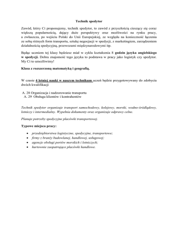 Technik spedytor Zawód, który Ci proponujemy, technik spedytor, to zawód z przyszłością cieszący się coraz większą popularnością, dający duże perspektywy oraz możliwości na rynku pracy, a zwłaszcza, po wejściu Polski do Unii Europejskiej, ze względu na konieczność łączenia ze sobą różnych form transportu, sztukę negocjacji w spedycji, z marketingiem, zarządzeniem działalnością spedycyjną, przewozami międzynarodowymi itp. Będąc uczniem tej klasy będziesz miał w cyklu kształcenia 8 godzin języka angielskiego w spedycji. Dobra znajomość tego języka to podstawa w pracy jako logistyk czy spedytor. My Ci to umożliwimy! Klasa z rozszerzoną matematyką i geografią. W czasie 4 letniej nauki w naszym technikum uczeń będzie przygotowywany do zdobycia dwóch kwalifikacji A. 28 Organizacja i nadzorowanie transportu A. 29 Obsługa klientów i kontrahentów Technik spedytor organizuje transport samochodowy, kolejowy, morski, wodno-śródlądowy, lotniczy i intermedialny. Wypełnia dokumenty oraz organizuje odprawy celne. Planuje potrzeby spedycyjne placówki transportowej. Typowe miejsca pracy: przedsiębiorstwa logistyczne, spedycyjne, transportowe; firmy z branży budowlanej, handlowej, usługowej; agencje obsługi portów morskich i lotniczych; hurtownie zaopatrujące placówki handlowe.
