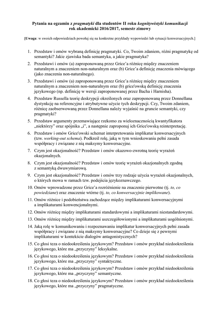Pytania na egzamin z pragmatyki dla studentów II roku kognitywistyki komunikacji rok akademicki 2016/2017, semestr zimowy [Uwaga: w swoich odpowiedziach powołuj się na konkretne przykłady wypowiedzi lub sytuacji konwersacyjnych.] 1. Przedstaw i omów wybraną definicję pragmatyki. Co, Twoim zdaniem, różni pragmatykę od semantyki? Jakie zjawiska bada semantyka, a jakie pragmatyka? 2. Przedstawi i omów (a) zaproponowaną przez Grice’a różnicę między znaczeniem naturalnym a znaczeniem non-naturalnym oraz (b) Grice’a definicję znaczenia mówiącego (jako znaczenia non-naturalnego). 3. Przedstawi i omów (a) zaproponowaną przez Grice’a różnicę między znaczeniem naturalnym a znaczeniem non-naturalnym oraz (b) grice'owską definicję znaczenia językowego (np. definicję w wersji zaproponowanej przez Bacha i Harnisha). 4. Przedstaw Russella teorię deskrypcji określonych oraz zaproponowaną przez Donnellana dystynkcję na referencyjne i atrybutywne użycie tych deskrypcji. Czy, Twoim zdaniem, różnicę zaobserwowaną przez Donnellana należy wyjaśnić na gruncie semantyki, czy pragmatyki? 5. Przedstaw argumenty przemawiające rzekomo za wieloznacznością kwantyfikatora „niektórzy” oraz spójnika „i”, a następnie zaproponuj ich Grice'owską reinterpretację. 6. Przedstaw i omów Grice'owski schemat interpretowania implikatur konwersacyjnych (tzw. working-out schema). Podkreśl rolę, jaką w tym wnioskowaniu pełni zasada współpracy i związane z nią maksymy konwersacyjne. 7. Czym jest okazjonalność? Przedstaw i omów okazowo-zwrotną teorię wyrażeń okazjonalnych. 8. Czym jest okazjonalność? Przedstaw i omów teorię wyrażeń okazjonalnych zgodną z semantyką dwuwymiarową. 9. Czym jest okazjonalność? Przedstaw i omów trzy rodzaje użycia wyrażeń okazjonalnych, o których mowa w ramach tzw. podejścia językoznawczego. 10. Omów wprowadzone przez Grice’a rozróżnienie na znaczenie pierwotne (tj. to, co powiedziane) oraz znaczenie wtórne (tj. to, co konwersacyjnie implikowane). 11. Omów różnice i podobieństwa zachodzące między implikaturami konwersacyjnymi a implikaturami konwencjonalnymi. 12. Omów różnicę między implikaturami standardowymi a implikaturami niestandardowymi. 13. Omów różnicę między implikaturami uszczegółowionymi a implikaturami uogólnionymi. 14. Jaką rolę w komunikowaniu i rozpoznawaniu implikatur konwersacyjnych pełni zasada współpracy i związane z nią maksymy konwersacyjne? Co dzieje się z pewnymi implikaturami w kontekście dialogów antagonistycznych? 15. Co głosi teza o niedookreśleniu językowym? Przedstaw i omów przykład niedookreślenia językowego, które ma „przyczyny” leksykalne. 16. Co głosi teza o niedookreśleniu językowym? Przedstaw i omów przykład niedookreślenia językowego, które ma „przyczyny” syntaktyczne. 17. Co głosi teza o niedookreśleniu językowym? Przedstaw i omów przykład niedookreślenia językowego, które ma „przyczyny” semantyczne. 18. Co głosi teza o niedookreśleniu językowym? Przedstaw i omów przykład niedookreślenia językowego, które ma „przyczyny” pragmatyczne. 19. Porównaj implikatury z presupozycjami. W swoim omówieniu uwzględnij takie własności jak podatność na wzmocnienie, nieodrywalność, podatność na uchylenie itp. 20. Czym jest presupozycja? Przedstaw i omów przykłady presupozycji związanych z użyciem (a) nazw własnych oraz (b) nierzeczywistych okresów warunkowych. 21. Czym jest presupozycja? Przedstaw i omów przykłady presupozycji związanych z użyciem (a) czasowników faktywnych oraz (b) określeń czasowych. 22. Czym jest presupozycja? Przedstaw i omów przykłady presupozycji związanych z użyciem (a) deskrypcji określonych oraz (b) zdań rozszczepionych lub konstrukcji pseudorozszczepionych. 23. Czym jest presupozycja? Przedstaw i omów przykłady presupozycji związanych z użyciem (a) czasowników implikacyjnych oraz (b) określeń powtórzeń. 24. Czym jest presupozycja? Przedstaw i omów przykłady presupozycji związanych z użyciem (a) czasowników zmiany stanu oraz (b) czasowników osądzających. 25. Na czym polega podatność na uchylenie presupozycji? Podaj i omów przykłady form, które przybiera ta własność. 26. Na czym polega rzutowalność presupozycji? Podaj i omów przykłady sytuacji (konstrukcji), w których rzutowanie zachodzi, oraz takich, w których rzutowanie to nie zachodzi. 27. Przedstaw i omów krytycznie koncepcję presupozycji semantycznych. 28. Przedstaw i omów krytycznie koncepcję presupozycji pragmatycznych. 29. Na czym polega akomodacja presupozycji? 30. Przedstaw i omów teorię metafor pojęciowych. 31. Przedstaw i omów krytycznie interakcyjną teorie metafory. Co decyduje o tym, że jest to teoria semantyczna? 32. Przedstaw i omów krytycznie teorię metafory jako skróconego porównania. Co decyduje o tym, że jest to teoria semantyczna? 33. Przedstaw i omów krytycznie teorię metafory oferowaną przez model Grice'a. Co decyduje o tym, że jest to teoria pragmatyczna? 34. Omów kategorie wypowiedzi konstatujących oraz wypowiedzi performatywnych. Dlaczego rozróżnienie na te dwa typy wypowiedzi jest — zdaniem Austina — trudne do utrzymania? 35. Omów Austinowskie kategorie aktu lokucyjnego, aktu illokucyjnego oraz aktu perlokucyjnego. Co różni akty illokucyjne od perlokucyjnych? 36. Przedstaw i omów Strawsona teorię aktów illokucyjnych. W jakim sensie odbiega ona od teorii Austinowskiej? 37. Omów Searle'a kategorię reguł konstytutywnych. Jaką rolę odgrywa ona w Searle'a koncepcji aktów mowy? 38. Przedstaw i omów Searle'a analizę udanego i niewadliwego obiecywania. Jak, Twoim zdaniem, można by w podobny sposób zanalizować inne illokucje, np. polecenia, przeprosiny itp.?