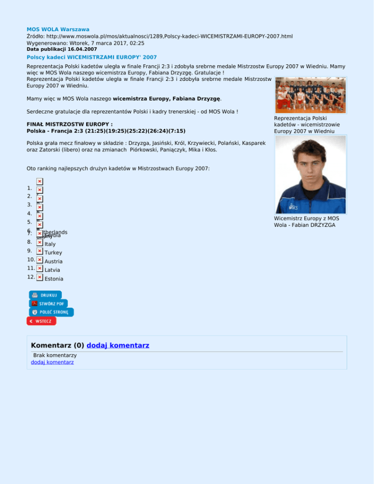 MOS WOLA Warszawa Źródło: http://www.moswola.pl/mos/aktualnosci/1289,Polscy-kadeci-WICEMISTRZAMI-EUROPY-2007.html Wygenerowano: Wtorek, 7 marca 2017, 02:25 Data publikacji 16.04.2007 Polscy kadeci WICEMISTRZAMI EUROPY' 2007 Reprezentacja Polski kadetów uległa w finale Francji 2:3 i zdobyła srebrne medale Mistrzostw Europy 2007 w Wiedniu. Mamy więc w MOS Wola naszego wicemistrza Europy, Fabiana Drzyzgę. Gratulacje ! Reprezentacja Polski kadetów uległa w finale Francji 2:3 i zdobyła srebrne medale Mistrzostw Europy 2007 w Wiedniu. Mamy więc w MOS Wola naszego wicemistrza Europy, Fabiana Drzyzgę. Serdeczne gratulacje dla reprezentantów Polski i kadry trenerskiej - od MOS Wola ! FINAŁ MISTRZOSTW EUROPY : Polska - Francja 2:3 (21:25)(19:25)(25:22)(26:24)(7:15) Reprezentacja Polski kadetów - wicemistrzowie Europy 2007 w Wiedniu Polska grała mecz finałowy w składzie : Drzyzga, Jasiński, Król, Krzywiecki, Polański, Kasparek oraz Zatorski (libero) oraz na zmianach Piórkowski, Paniączyk, Mika i Kłos. Oto ranking najlepszych drużyn kadetów w Mistrzostwach Europy 2007: 1. F 2. rP a 3. o B n l 4. ce R a le 5. u n G g se d 6. 7. iNetherlands sia rmany umSerbia 8. Italy 9. Turkey 10. Austria 11. Latvia 12. Estonia Komentarz (0) dodaj komentarz Brak komentarzy dodaj komentarz Wicemistrz Europy z MOS Wola - Fabian DRZYZGA