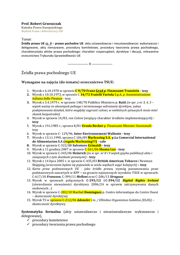 Prof. Robert Grzeszczak Katedra Prawa Europejskiego Wydział Prawa i Administracji UW Temat: Źródła prawa UE cz. II – prawo pochodne UE: akty ustawodawcze i nieustawodawcze: wykonawcze i delegowane, akty nienazwane, procedury komitetowe, procedury tworzenia prawa pochodnego, charakterystyka aktów prawa pochodnego: charakter rozporządzeń, dyrektyw i decyzji, relewantne orzecznictwo Trybunału Sprawiedliwości UE ----------------- 0 ----------------- Źródła prawa pochodnego UE Wymagane na zajęcia (do tematu) orzecznictwo TSUE: 1. Wyrok z 6.10.1970 w sprawie C 9/70 Franz Grad p. Finanzamt Traustein -‐ tezy 2. Wyrok z 10.10.1973, w sprawie C 34/73 Fratelli Variola S.p.A. p. Amministrazione italiana delle Finanze -‐ tezy 3. Wyrok z 5.4.1979 r. w sprawie 148/78 Pubblico Ministero p. Ratti (w spr. z nr 3, 4, 5 – wątek ważny to obowiązek pełnego i terminowego wdrażania dyrektyw, zakaz podejmowania działań, które mogłyby zagrozić celowi, w niektórych sytuacjach może mieć skutek bezpośredni) 4. Wyrok w sprawie 14/83, von Colson [wiążący charakter środków implementujących] -‐ tezy 5. Wyrok z 19.I.1985 r., sprawa 8/81 Ursula Becker p. Finanzamt Münster-‐Innenstadt -‐ tezy 6. Wyrok w sprawie C-‐ 129/96, Inter-‐Environnement Wallonie -‐ tezy 7. Wyrok z 13.11.1990, sprawa C 106/89 Marleasing S.A. p.La Comercial International de Alimentacion S.A (reguła Marleasing!!!) -‐ całe 8. Wyrok w sprawie C-‐322/88 Salvatore Grimaldi -‐ tezy 9. Wyrok z 11 grudnia 2007 w sprawie C-‐161/06 Skoma Lux -‐ tezy 10. Wyrok w sprawie C-‐345/06 Heinrich (tu w spr. nr 8 i 9 wątek języka publikacji aktu i związanych z tym skutkami prawnymi) -‐ tezy 11. Wyrok z 14 lipca 2005 r. w sprawie C-‐435/03 British American Tobacco i Newman Shipping (orzeczenie będzie się pojawiało w wielu wątkach zajęć kolejnych) – tezy 12. Karta praw podstawowych UE -‐ jako źródło prawa, wymóg poszanowania praw podstawowych zawartych w KPP – na gruncie najnowszych wyroków TSUE w sprawach: C-‐617/10 Fransson, C-‐399/11 Melloni oraz C-‐206/13 Siragusa 13. Wyrok w sprawach połączonych C-‐293/12 i C-‐594/12 Digital Rights Ireland (stwierdzenie nieważności dyrektywy 2006/24 w sprawie zatrzymywania danych osobowych…) 14. Wyrok w sprawie C-‐282/10 Maribel Dominguez p. Centre informatique du Centre Ouest – skuteczność dyrektywy 15. Wyrok TS w sprawie C-‐212/04 Adeneler i in. / Ellinikos Organismos Galaktos (ELOG) – skuteczność dyrektywy Systematyka formalna (akty ustawodawcze i nieustawodawcze: wykonawcze i delegowane), ü procedury komitetowe ü procedury tworzenia prawa pochodnego Formy aktów prawa pochodnego UE 1. akty ustawodawcze: Art. 289 TFUE: rozporządzenia, dyrektywy i decyzje są przyjmowane przez Parlament i Radę w ramach zwykłej procedury ustawodawczej: akt przyjmowany jest wspólnie przez PE i Radę na wniosek KE (procedura zbliżona do obecnej procedury współdecydowania); oraz w ramach jednej ze specjalnych procedur ustawodawczych: akt przyjmowany jest przez PE z udziałem Rady lub przez Radę z udziałem PE; w toku tej procedury w szczególnych przypadkach inicjatywa legislacyjna może pochodzić od grupy państw członkowskich, PE, EBC, Trybunału Sprawiedliwości lub EBI; możliwe jest również zastosowanie tzw. procedury kładki, tj. Rada Europejska może podjąć decyzję o zmianie „specjalnych procedur prawodawczych” na „zwykłą procedurę prawodawczą” Przyjmowane są w procedurze prawodawczej (ustawodawczej): § zwykłej – PE + R – wniosek KE/ art. 294 TFUE oraz § specjalnej – PE z udziałem R, R z udziałem PE – inicjatywa prawodawcza KE, wyjątkowo także możliwa inicjatywa grupy PCz, PE, EBC, ETS, EBI 2. Akty delegowane Art. 290 TFUE: „1. Akt ustawodawczy może przekazywać Komisji uprawnienia do przyjęcia aktów o charakterze nieustawodawczym o zasięgu ogólnym, które uzupełniają lub zmieniają niektóre, inne niż istotne, elementy aktu ustawodawczego. Akty ustawodawcze wyraźnie określają cele, treść, zakres oraz czas obowiązywania przekazanych uprawnień. Przekazanie uprawnień nie może dotyczyć istotnych elementów danej dziedziny, ponieważ są one zastrzeżone dla aktu ustawodawczego. 2. Warunki, którym podlega przekazanie uprawnień, są wyraźnie określone w aktach ustawod. i mogą być następujące: PE lub Rada może zadecydować o odwołaniu przekazanych uprawnień; akt delegowany może wejść w życie tylko wtedy, gdy PE lub Rada nie wyrażą sprzeciwu w terminie przewidzianym przez akt ustawodawczy (jest to tzw. dwuwariantowa procedura typu call-back). Do celów litery a) i b) PE stanowi większością głosów wchodzących w jego skład członków, a Rada większ. kwal. 3. W nagłówku aktów delegowanych dodaje się przymiotnik „delegowane” albo „delegowana”. „ Są to zatem akty KE o charakterze nieustawodawczym o zasięgu ogólnym, uzupełniają lub zmieniają niektóre, inne niż istotne, elementy a. u. i oparte na wyraźnej delegacji/ określającej m.in. warunki/ zawartej w a.u. !!!! 3. Akty wykonawcze Art. 291 TFUE: „Państwa Członkowskie przyjmują wszelkie środki prawa krajowego niezbędne do wprowadzenia w życie prawnie wiążących aktów Unii. Jeżeli konieczne są jednolite warunki wykonywania prawnie wiążących aktów Unii, akty te powierzają uprawnienia wykonawcze Komisji lub, w należycie uzasadnionych przypadkach oraz w przypadkach określonych w artykułach 24 i 26 Traktatu o Unii Europejskiej, Radzie. Do celów ustępu 2 PE i Rada, stanowiąc w drodze rozporządzeń zgodnie ze zwykłą procedurą ustawodawczą, ustanawiają z wyprzedzeniem przepisy i zasady ogólne dotyczące trybu kontroli przez Państwa Członkowskie. wykonywania uprawnień wykonawczych przez Komisję W nagłówku aktów wykonawczych dodaje się przymiotnik „wykonawcze” albo „wykonawcza”. „Zatem: akty wykonawcze – co do zasady wydają państwa cz