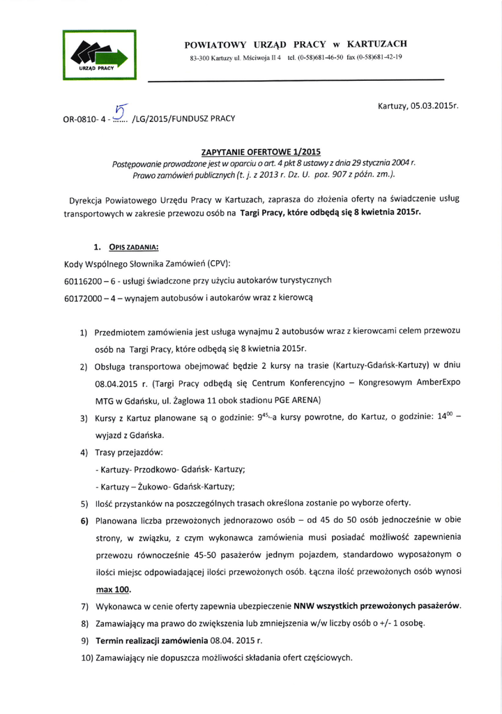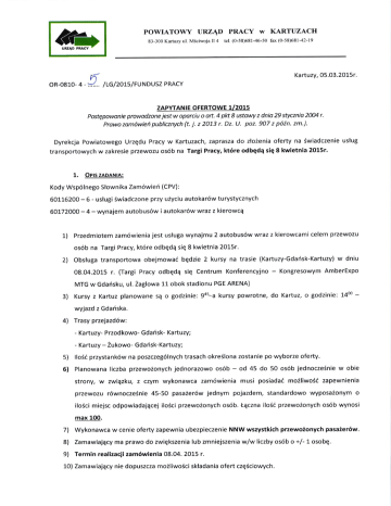 POWIATOWY URZ4D PRACY w KARTUZACH 儒 83‐ 3111K… ul M`C'WqaH4 tcl(0‐ 58)68146‐ 50 fa■ (0‐ 58)681-42‐ 19 Kartuzy′ 05032015r OR-0810-4-,`I:/LG/2015/FUNDUSZ PRACY ZAPYTANIE OFERTOWE U2015 PostQpowonie prowodzone iest w oporciu o orL 4 pk 8 ustow z dnio 29 stycznio 2404 r. Prowo zom6wiei publicznych (t. i. z 2073 r. Dz' lJ. poz. 907 z p6in. zm.). Dyrekcja powiatowego Urzqdu Pracy w Kartuzach, zaprasza do zloienia oferty na 5wiadczenie uslug transportowych w zakresie przewozu os6b na Targi Pracy, kt6re odbede sie 8 kwietnia 2015r. 1. OPls zApANtA: Kody Wsp6lnego Slownika Zam6wien (CPV): 60116200 - 6 - uslugi Swiadczone przy uiyciu autoka16w turystycznych 60172000-4 -wynajem autobus6w i autokar6w wraz z kierowcq 1) przedmiotem zam6wienia jest usluga wynajmu 2 autobus6w wraz z kierowcami celem przewozu os6b na Targi Pracy, kt6re odbqdq siq 8 kwietnia 2015r. 2) Obsluga transportowa obejmowai bedzie 2 kursy na trasie (Kartuzy-Gdarisk-Kartuzy) 08.04.2015 r. (Targi Pracy odbqdq siq Centrum Konferencyjno - w dnlu Kongresowym AmberExpo MTG w Gdahsku, ul. 2aglowa 11 obok stadionu PGE ARENA) 3) Kursy z Kartuz planowane sE o godzinie: 9as-a kursy powrotne, do Kartuz, o godzinie: 14m - wyjazd z Gdariska. 4) Trasy przejazd6w: - Kartuzy- Przodkowo- Gdafsk- Kartuzy; - Kartuzy 5) 6) - Zukowo- Gdafsk-Kartuzy; llo6i przystank6w na poszczeg6lnych trasach okreilona zostanie po wyborze oferty. Planowana liczba przewo2onych jednorazowo os6b strony, w zwiqzku, - od 45 do 50 os6b jednocze5nie w obie z czym wykonawca zam6wienia musi posiada6 moiliwoii zapewnienia przewozu r6wnoczeinie 45-50 pasaier6w jednym pojazdem, standardowo wyposaionym o iloici miejsc odpowiadajqcej ilo5ci przewo2onych os6b. taczna iloSd przewoionych os6b wynosi max 1(X). 7) 8) 9) Wykonawca w cenie oferty zapewnia ubezpieczenie NNW wszystkich pzewoionych pasaier6w. Zamawiajacy ma prawo do zwiekszenia lub zmniejszenia w/w liczby os6b o +/- 1 osobq. Termin realizacii zam6wienia 08.04. 2015 r. 10) Zamawiajqcy nie dopuszcza mo2liwoSci skladania ofert cze6ciowych. 2. OpE wARUN(6w uDztatu w posrEpowANtu: O udzielenie zam6wienia mogE ubiegai siq wykonawcy, kt6rzy: 1) posiadaiq uprawnienia do wykonywania okreslonej dzialalno6ci lub czynnosci, obietej przedmiotem niniejszego zapytania (wpis do ewldencji dzialalnosci gospodarczej lub 2) KRS) posiadajq niezbqdna wiedzq ido5wiadczenie oraz dysponujq potencjalem technicznym iosobami zdolnymi do wykonania zam6wienia lub przedstawiq pisemne zobowiEzanie innych podmiot6w do udostqpnienia potencjalu technicznego ios6b zdolnych do wykonania (aktualnq licencjq na przew6z drogowy os6b na terenie kraju oraz uprawnionych kierowc6w) 3) posiadajl ubezpieczenie od odpowiedzialnoSci cywilnej w zakresie prowadzonej dzialalno6ci, waine, co najmniej w dniu skladania ofert oraz w dniu realizacji zam6wienia. 4) posiadajq ubezpieczenie NNW w zakresie prowadzonej dzialalnosci, waine, co najmniej w dniu skladania ofert oraz w dniu realizacji zam6wienia. 5) Na potwierdzenie spelniania w/w warunk6w Wykonawca sklada oSwiadczenie stanowiace Zalqcznik nr 2 do ninlejszego zapvtania ofertowego. 3. 1) 2) ocENAoFERT: Oferta podlegad bqdzie ocenie formalne pod kqtem cena - - spelniania warunk6w loo%.wartosi oferty winna obejmowai wszelkie koszty, jakie poniesie wykonawca przy realizacji zam6wienia wraz z ubezpieczeniem NNW pasaier6w. 3) w kryterium ,,cena brutto" ocena ofert zostanie dokonana przy zastosowaniu wzoru: ,,cena brutto": llczba punkt6w = cena najni2sza brutto / cena brutto oferty ocenianej x 100 pkt x 100%. Oferta najkorzystniejsza otrzyma w tym kryterium 4. pkt. Spos6B pRzycorowANtA oFERTy/ MtEJscE oRAz TERM|N sKtApANtA oFERT: 1) oferte sporzqdzid naleiy w formie pisemnej z wykorzystaniem zalqcznika nr 1 (formularz ofertowy). Do oferty naleiy zalqczyi Zalqcznik nr 2) 3) 1OO 2 - oSwiadczenie Wykonawcy. Oferta powinna byd podpisana przez osobq upowa2nionq. odpowiedzi na niniejsze zapytanie nale2y skladai w siedzibie powiatowego urzedu pracy w Kartuzach, ul. MSciwoja ll 4 83-300 Kartuzy, pok. 20 sekretariat, lub w wersji elektronicznej (w formie podpisanego skanu dokumentu) przeslai na adres: [email protected] lub [email protected] w terminie do 13.03.2015 r. godzina 4) 13:OO uwasa: oferty sporzadzone wadliwie, nieodpowiadaiqce wzglqdom formalnym lub zgloszone po wyznaczonym terminie nie bqdq rozpatrywane. 5) oferent mo2e przed uplywem terminu skladania ofert zmienid lub wycofai swoia oferte. 6) w toku badania i oceny ofert zamawiaiEcy mo2e iqda6 od oferent6w wyjaSnieri dotyczqcych treSci zloionych ofert. 5. DopATKowEINFoRMAoE: Dodatkowych informacji udziela p. Lucyna Gruchala pod numerem telefonu 58 694-09-05 oraz adresem email: l.gruchala 6. > F @ pup.kartuzv.pl. zAtAczNtKt: Formularz oferty: Oiwiadczenie o spelnianiu warunkriw udzialu w postepowaniu