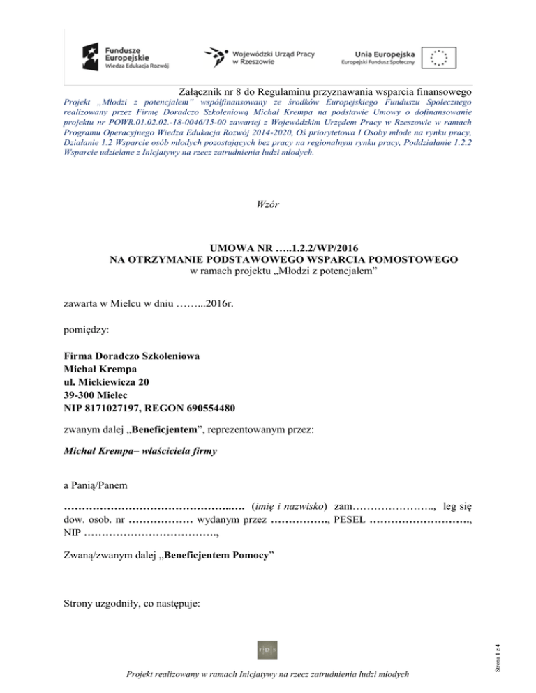 Załącznik nr 8 do Regulaminu przyznawania wsparcia finansowego Projekt „Młodzi z potencjałem” współfinansowany ze środków Europejskiego Funduszu Społecznego realizowany przez Firmę Doradczo Szkoleniową Michał Krempa na podstawie Umowy o dofinansowanie projektu nr POWR.01.02.02.-18-0046/15-00 zawartej z Wojewódzkim Urzędem Pracy w Rzeszowie w ramach Programu Operacyjnego Wiedza Edukacja Rozwój 2014-2020, Oś priorytetowa I Osoby młode na rynku pracy, Działanie 1.2 Wsparcie osób młodych pozostających bez pracy na regionalnym rynku pracy, Poddziałanie 1.2.2 Wsparcie udzielane z Inicjatywy na rzecz zatrudnienia ludzi młodych. Wzór UMOWA NR …..1.2.2/WP/2016 NA OTRZYMANIE PODSTAWOWEGO WSPARCIA POMOSTOWEGO w ramach projektu „Młodzi z potencjałem” zawarta w Mielcu w dniu ……...2016r. pomiędzy: Firma Doradczo Szkoleniowa Michał Krempa ul. Mickiewicza 20 39-300 Mielec NIP 8171027197, REGON 690554480 zwanym dalej „Beneficjentem”, reprezentowanym przez: Michał Krempa– właściciela firmy a Panią/Panem ………………………………………..…. (imię i nazwisko) zam………………….., leg się dow. osob. nr ……………… wydanym przez ……………., PESEL ………………………., NIP ………………………………., Zwaną/zwanym dalej „Beneficjentem Pomocy” Projekt realizowany w ramach Inicjatywy na rzecz zatrudnienia ludzi młodych Strona 1 z 4 Strony uzgodniły, co następuje: § 1 – Przedmiot umowy 1. Przedmiotem niniejszej umowy jest udzielenie przez Beneficjenta wsparcia pomostowego, przeznaczonego na wspomaganie uczestnika projektu w pierwszych miesiącach działalności gospodarczej, zgodnie z wnioskiem uczestnika projektu, stanowiącym załącznik do niniejszej umowy. 2. Pomoc będąca przedmiotem niniejszej umowy udzielana jest w oparciu o zasadę de minimis, zgodnie z Rozporządzeniem Ministerstwa Infrastruktury i Rozwoju w sprawie udzielania pomocy de minimis i pomocy publicznej w ramach programów operacyjnych finansowanych z Europejskiego Funduszu Społecznego na lata 2014-2020 (Dz. U. poz. 488 z 2015 r.). § 2 – Okres udzielania wsparcia pomostowego 1. Wsparcie pomostowe udzielane jest przez okres pierwszych ……………………miesięcy1 od dnia zawarcia umowy o udzielenie wsparcia pomostowego, tj. od dnia ……………. do dnia……………….. 1. 2. 3. 4. § 3 – Finansowanie wsparcia pomostowego Kwota środków na wsparcie pomostowe wynosi ….………………………………… PLN (słownie……………………………………………………………………………. PLN). Beneficjent wypłaci Uczestnikowi projektu środki, o których mowa w ust. 1 w miesięcznych ratach w wysokości …………………. PLN (słownie…………………………………..PLN). Beneficjent przekazywać będzie środki finansowe na rachunek bankowy uczestnika projektu nr…………………………………………………………………………………. prowadzony w banku ..............…………………………......... w terminie 14 dni od podpisania niniejszej umowy i po wniesieniu zabezpieczenia przez uczestnika projektu. Uczestnik projektu zobowiązany jest przechowywać dokumentację związaną z otrzymanym wsparciem finansowym przez okres 10 lat, licząc od dnia podpisania niniejszej umowy. § 4 – Zabezpieczenie umowy 1. Zabezpieczenie prawidłowej realizacji umowy stanowić będzie zabezpieczenie przyjęte w umowie na otrzymanie wsparcia finansowego nr ……………….. z dnia ……………….., na zasadach określonych w Umowie na otrzymanie wsparcia finansowego. 2. Zabezpieczenie, o którym mowa w ust.1 zwracane jest na pisemny wniosek Beneficjenta Pomocy na wskazany przez niego adres lub osobiście, nie wcześniej niż po upływie warunku o którym mowa w § 4 ust. 2 Umowy na otrzymanie wsparcia finansowego. § 5 – Postanowienia szczegółowe dotyczące wypłaty wsparcia pomostowego 1. Uczestnik projektu zobowiązuje się wydatkować wsparcie pomostowe zgodnie z wnioskiem o przyznanie wsparcia pomostowego stanowiącego załącznik do niniejszej umowy. w okresie od 6 do 12 miesięcy od dnia zawarcia umowy o udzielenie wsparcia pomostowego Projekt realizowany w ramach Inicjatywy na rzecz zatrudnienia ludzi młodych Strona 2 z 4 1 2. Warunkiem wypłaty każdej kolejnej rat miesięcznej wsparcia pomostowego jest rozliczenie przez Uczestnika projektu uprzednio otrzymanej raty wsparcia pomostowego. 3. W przypadku likwidacji lub zawieszenia przez Uczestnika projektu działalności gospodarczej w czasie korzystania z pomocy objętej niniejszą umową, Uczestnik projektu ma obowiązek poinformować Beneficjenta o tym fakcie, w ciągu 7 dni od dnia wystąpienia tego faktu. 4. W przypadku, o którym mowa w ust. 3 uczestnik projektu zobowiązany jest do zwrotu całości otrzymanego do dnia zawieszenia/likwidacji wsparcia pomostowego. 5. W przypadku wystąpienia opóźnień w przekazywaniu płatności przekraczających 14 dni, Beneficjent zobowiązany jest niezwłocznie poinformować Uczestnika projektu, w formie pisemnej, o przyczynach opóźnień. § 6 – Zmiana umowy Wszelkie zmiany umowy wymagają aneksu w formie pisemnej, pod rygorem nieważności. § 7 – Obowiązki kontrolne Uczestnik projektu jest zobowiązany poddać się kontroli uprawnionych organów w zakresie prawidłowości wydatkowania środków wsparcia pomostowego. § 8 – Zwrot wsparcia pomostowego 1. W przypadku nie wywiązania się uczestnika projektu z postanowień niniejszej umowy, a w szczególności: 1) Zaprzestania prowadzenia działalności przed upływem 12 miesięcy od dnia zawarcia umowy na przyznanie wsparcia finansowego 2) Stwierdzenia w trakcie czynności kontrolnych prowadzonych przez uprawnione organy lub w trakcie zwykłych czynności monitoringowych, że uczestnik projektu wykorzystał całość lub część wsparcia pomostowego niezgodnie z przeznaczeniem, bez zachowania