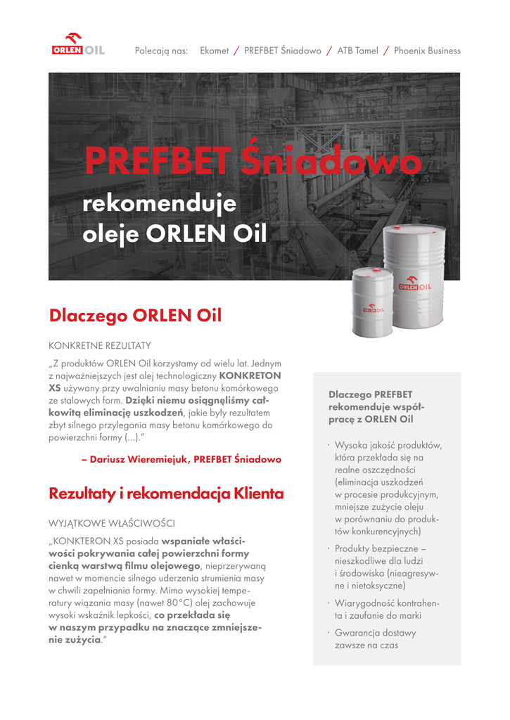 Polecają nas: Ekomet / PREFBET Śniadowo / ATB Tamel / Phoenix Business PREFBET Śniadowo rekomenduje oleje ORLEN Oil Dlaczego ORLEN Oil KONKRETNE REZULTATY „Z produktów ORLEN Oil korzystamy od wielu lat. Jednym z najważniejszych jest olej technologiczny KONKRETON XS używany przy uwalnianiu masy betonu komórkowego ze stalowych form. Dzięki niemu osiągnęliśmy całkowitą eliminację uszkodzeń, jakie były rezultatem zbyt silnego przylegania masy betonu komórkowego do powierzchni formy (…).” – Dariusz Wieremiejuk, PREFBET Śniadowo Rezultaty i rekomendacja Klienta WYJĄTKOWE WŁAŚCIWOŚCI „KONKTERON XS posiada wspaniałe właściwości pokrywania całej powierzchni formy cienką warstwą filmu olejowego, nieprzerywaną nawet w momencie silnego uderzenia strumienia masy w chwili zapełniania formy. Mimo wysokiej temperatury wiązania masy (nawet 80°C) olej zachowuje wysoki wskaźnik lepkości, co przekłada się w naszym przypadku na znaczące zmniejszenie zużycia.” Dlaczego PREFBET rekomenduje współpracę z ORLEN Oil ·· Wysoka jakość produktów, która przekłada się na realne oszczędności (eliminacja uszkodzeń w procesie produkcyjnym, mniejsze zużycie oleju w porównaniu do produktów konkurencyjnych) ·· Produkty bezpieczne – nieszkodliwe dla ludzi i środowiska (nieagresywne i nietoksyczne) ·· Wiarygodność kontrahenta i zaufanie do marki ·· Gwarancja dostawy zawsze na czas Polecają nas: Ekomet / PREFBET Śniadowo / ATB Tamel / Phoenix Business PREFBET Śniadowo poleca olej antyadhezyjny KONKRETON XS sprawdzony przy uwalnianiu mas betonu ze stalowych form KONKRETON XS wytwarzany jest z głęboko rafinowanego oleju mineralnego przy udziale dodatków uszlachetniających, przede wszystkim antyadhezyjnych i antykorozyjnych. Optymalnie dobrany skład produktu zapewnia utrzymanie ciągłości filmu smarowego i zabezpiecza elementy betonowe przed przywieraniem do powierzchni formy. PEŁNA SPECYFIKACJA PRODUKTU Przedsiębiorstwo Produkcji Betonów PREFBET Śniadowo od ponad 40 lat specjalizuje się w produkcji wyrobów budowlanych z betonu. Oferta firmy obejmuje produkty z betonu komórkowego, zwykłego i masy betonowej prefabrykowanej. Dodatkowo, w oparciu o asortyment własny, PREFBET Śniadowo wprowadził na rynek tani i technologicznie prosty system budowy obiektów z betonu komórkowego. Firma zajmuje się również sprzedażą materiałów budowlanych, pracami budowlano-montażowymi, obsługą budownictwa jednorodzinnego i inwestycji wiejskich (obiekty inwentarskie), usługami transportowymi wraz z rozładunkiem oraz opracowywaniem kosztorysów i przeliczaniem projektów. WIĘCEJ O FIRMIE