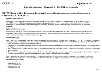 CZĘŚĆ 5 Załącznik nr 1.5 Formularz ofertowy – Załącznik nr 1.5. SIWZ po zmianach WSTĘP: Uwagi ogólne do zapisów dotyczących sprzętu komputerowego wyspecyfikowanego w Częściach: 1,2,3,4,5,6,11,12 Wydajności procesorów Wydajności procesorów zostały określone na podstawie punktów zdobytych teście PassMark - CPU Mark (którego wyniki opublikowano w dniu 15.04.2015 r. na stronie http://www.cpubenchmark.net/high_end_cpus.html) uzyskanych w konfiguracjach tam opisanych (traktowanych jako referencyjne dla jednoznacznego określenia dolnej granicy wydajności procesora). Wydruk wyników z testów zostały dołączone do Formularza ofertowego. Wydajności kart graficznych Wydajności kart graficznych zostały określone na podstawie punktów zdobytych teście PassMark - G3D Mark (którego wyniki opublikowano w dniu 15.04.2015 r. na stronie http://www.videocardbenchmark.net/high_end_gpus.html lub http://www.videocardbenchmark.net/mid_range_gpus.html ) – wyniki z testów zostały dołączone do Formularza ofertowego. System operacyjny System operacyjny zainstalowany w stacjach roboczych i komputerach stacjonarnych, wymienionych w Częściach: 1, 2, 3, 4, 11, 12 oraz w komputerach przenośnych i przenośnych stacjach roboczych w Części 5: TYP-N8, TYP-N9, TYP-N10, TYP-N11, TYP-N12, TYP-N13 oraz w Części 6: TYP-N16, TYP-N17, TYP-N18 musi mieć wbudowane następujące mechanizmy: 1. Zdalna pomoc i współdzielenie aplikacji – możliwość zdalnego przejęcia sesji zalogowanego użytkownika celem rozwiązania problemu z komputerem („Pulpit zdalny”) 2. Pełna kompatybilność z domeną Windows opartą na serwerach Windows 2008 (posiadanych przez Zamawiającego) w zakresie autoryzacji w środowisku Zamawiającego; 3. Scentralizowane zarządzanie z poziomu domeny Windows w zakresie konfiguracji zainstalowanego systemu operacyjnego na dostarczonym komputerze lub stacji roboczej, sposobu uruchamiania aplikacji oraz konfigurowania środowiska pracy użytkownika. System operacyjny zainstalowany i skonfigurowany w komputerach stacjonarnych i notebookach musi być kompatybilny z następującymi aplikacjami wykorzystywanymi w Instytucie w środowiskach Windows 7, Windows 8 i Windows 8.1 (na te systemy zakupione zostały stosowne licencje na niżej wymienione oprogramowanie): Adobe Acrobat Prof. 11, Adobe Acrobat Prof.. 9 Adobe Acrobat XI Pro Pl Adobe PhotoShop CS5 Adobe Photoshop CS6, str. 1 Adobe Web Premium CS5, Audacity, AutoCAD, Checkpoint Smart Console, Corel Designer Technical Suite 12 CorelDraw 11, CorelDraw Graphics Suite 12, CorelDraw Graphics Suite X5, CorelDraw X3, CorelDraw X4 Graphics Suite, CorelDraw, CST Studio Suite, Delphi RAD Studio, DXO Optics PTO, EMG Works 4.05 (do aparatu Bagnoli-16 PDsEMG), English Translator TX2 Synergy, InDesign Cs 5.5, IntelliJ IDEA 14, Mathlab MS Office 2010, MS Office 2013, MS Visio 10 ODEON Room Acoustics Software, Office Visio Professional 2007 Oprogramowanie CAD (projektowanie i symulacje 3D), np.. SolidWorks, Solid Works Simulation do skanera 3D oprogramowanie dedykowane do badań palestezjometrycznych oprogramowanie dedykowane do pomiaru sił Oracle Fusion Middleware 11.1.2.4.0, Photoshop CS 6, PhotoShop CSS Extended v. 12.0.4 x64, PhotoShop, Pinnacle Studio HD ultimate, Play Memories Home 4.1 (Sony) PLSQL Developer, Pulse Data Recorder, PULSE LabShop, Pulse Reflex, SEMCAD x, Simple ERP, SPSS Statistics Statistica Statistica 8.0, Statistica 10.0 MR1, UltraEdit str. 2 Zaawansowane komputery przenośne i mobilne stacje robocze bardzo wysokiej wydajności (umożliwiające mobilną pracę z aplikacjami obliczeniowymi, projektowymi i przetwarzania graficznego), a także przenośne komputery prezentacyjne i przeznaczone do mobilnych prac eksperymentalnych wraz z instalacją, skonfigurowaniem i przetestowaniem systemu operacyjnego – łącznie 21 szt. SZCZEGÓŁOWA SPECYFIKACJA TECHNICZNA 5.1. Komputery przenośne wysokiej wydajności, o małej masie, przeznaczone do mobilnej pracy z aplikacjami obliczeniowymi, graficznymi i prezentacyjnymi – łącznie 4 szt. 5.1.1. Komputer przenośny wysokowydajny o bardzo małej masie z przekątną ekranu 13”, wysokiej rozdzielczości – 1 szt. KOMPUTER TYP-N1 PRZENOŚNY Komputer przenośny wysokowydajny o bardzo małej masie N1 Minimalne parametry wymagane Gwarancja min. 36 miesięcy Warunki serwisu gwarancyjnego: TYP oferowany: ……………………………………. Producent: …………………………………………. Faktyczne parametry oferowanych urządzeń (nie gorsze, niż wymagane) W siedzibie Zamawiającego Pełna sprawność sprzętu zostanie przywrócona w czasie nie dłuższym, niż 48 godzin od otrzymania formalnego zawiadomienia o awarii sprzętu W przypadku konieczności naprawy w czasie dłuższym, niż 48 godzin podmiot świadczący serwis nieodpłatnie dostarczy sprzęt zastępczy o str. 3 równorzędnych parametrach i nieodpłatnie przygotuje go do pracy zgodnej z przeznaczeniem sprzętu naprawianego Jeżeli sprzęt po 3 (trzech) naprawach nadal wykazuje wady w działaniu – na żądanie Zamawiającego zostanie wymieniony na nowy, wolny od wad lub nastąpi zwrot zapłaty Zamawiającemu (w pełnej kwocie brutto za wadliwy sprzęt, który zostanie zwrócony Dostawcy) – wg decyzji Zamawiającego. Firma serwisująca musi posiadać ISO 9001:2000 na świadczenie usług serwisowych oraz posiadać autoryzacje producenta komputera – dokumenty potwierdzające załączyć do oferty. Wymagane jest dołączenie do oferty oświadczenia producenta komputera przenośnego, że w przypadku nie wywiązywania się z obowiązków gwarancyjnych oferenta lub firmy serwisującej, przejmie na siebie wszelkie zobowiązania związane z serwisem System operacyjny Zainstalowany i skonfigurowany system operacyjny 64-bitowy z interfejsem graficznym w języku polskim + (nośnik lub dostępna funkcjonalność wykonania kopii instalacyjnej systemu operacyjnego na nośniku zewnętrznym) pełn