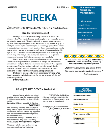 WRZESIEŃ Rok 2010, nr 1 EUREKA ZS w Krzeszowie GIMNAZJUM W KRZESZOWIE Ważne tematy: > Pamiętnik z biwaku ŻEGNAJCIE WAKACJE, WITAJ SZKOŁO!!! Drodzy Pierwszoklasiści! > Kilka słów do „Pierwszaków” > O co chciałbym spytać H. Sienkiewicza? Od tego roku zaczęliście nowy rozdział w życiu. Dla niektórych z Was może lepszy, choć na pierwszy rzut oka może > Poezja „krzeszowska” się tak nie wydawać. Ale wierzcie mi, w naszej szkole wasze > Pozdrowienia wysiłki zostaną wynagrodzone. Nie musicie się martwić, gdyż z każdym dniem będzie coraz lepiej. Z własnego przykładu wiem, > iż początki bywają zazwyczaj trudne. Nowi nauczyciele, a co się z tym wiąże - nowe wymagania, być może Was przerażają. Ale my, 2— i 3—klasiści też odczuwamy wobec Was niemały lęk; nie wiemy przecież, z kim mamy do czynienia i w jakich rękach zostawimy tak bliską naszemu sercu szkołę. Mam nadzieję, że nie zawiedziecie naszego zaufania W nowym roku szkolnym 2010/2011 i sprawicie, by gimnazjum przeżywało swoje dni świetności. PAMIETAJCIE o słowach, które są dewizą każdego gimnazjalisty: Uważam, że miłym doświadczeniem dla nas i dla Was będzie współpraca. Swoim nastawieniem i podejściem do życia „Tylko wówczas jestem, gdy jestem dobry. możecie sprawić, ż nasza wspólna praca w nowym roku szkolnym będzie nie tylko owocna, ale i przyjemna. Oto jedyna miara mojego człowieczeństwa” Dlatego w imieniu starszych roczników witam Was R. Brandstaetter bardzo serdecznie i nie pozostało mi nic innego, jak życzyć Wam wszystkim POWODZENIA!!! PAMIĘTAJMY O TYCH DATACH!!! Wrzesień to nie tylko koniec wakacji i powrót w szkolne mury. Dla naszych rodaków 71 lat temu rozpoczął się czas strachu i braku nadziei. 1 września 1939 roku wybuchła II WOJNA ŚWIATOWA!!! Nasi rówieśnicy nie mogli wówczas pójść do szkoły, cieszyć się babim latem i urokiem bycia nastolatkiem. Młodzież taka jak my sięgała za broń, poszukiwała żywności dla całej rodziny lub zarabiała na chleb. Kilkanaście dni później 17 września 1939 r. Polska otrzymała drugi cios — na tereny naszej Ojczyzny wkroczyły wojska rosyjskie! Wracając w szkolne mury zastanówmy się choć przez chwilę nad wartością słów : PATRIOTYZM, OJCZYZNA. Żyjemy w bezpiecznym świecie, ale pamiętajmy ilu Polaków straciło życie walcząc o naszą niepodległość. ZASPÓŁ REDAKCYJNY: Czerwieniec Michalina Dechnik Agnieszka Madej Emila Pamiętajmy o tych wielkich słowach: „BÓG, HONOR, OJCZYZNA” Paruch Kinga W tym numerze także: Krystian Kulik Kupiec Michał Z pamiętnika pierwszoklasisty… Pamiętnik z biwaku w Harasiukach Drogi Pamiętniku! Wczoraj byłem na biwaku integracyjnym w Harasiukach. Udał się SUPER!!! Bałem się, że będzie trochę nudno przez pogodę, która nie była najlepsza. Prawie cały czas kropił deszcz, chwilami nawet mocniej popadał. No więc, zaczynając od początku… Około wpół do ósmej mama podwiozła mnie do szkoły, skąd razem z kolegą idziemy do pobliskiego sklepu zaopatrzyć się w niezbędny na biwak prowiant. Przy okazji panią wychowawczynię kupująca kiełbasę i chleb na ognisko, więc z chęci przysłużyliśmy się szkole zanosząc ten prowiant do gimnazjum. Około godziny ósmej nasz autobus wyrusza z Krzeszowa i niebawem docieramy do celu. Biwak zaczął się dosyć smętnym odczytywaniem przepisów BHP. Kilkakrotnie, nie mogąc się już powstrzymać, kilkakrotnie przysypiałem na krześle i za każdym razem budziły mnie kuksańce kolego lub upomnienia nauczycielki. Następnie półgodzinna przerwa, a potem, jeżeli mnie pamięć nie myli, graliśmy w śledzia. To była gra!!! Była to najlepsza rozgrywka na biwaku! Osobiście kilka razy stawałem w środku koła i trochę oberwałem… Podsumowując, dwa razy dostałem ubłoconą piłką w głowę, a potem zyskałem chwilowy przydomek „Rzeźnik”. Wszystko przez małe, przedawnione otarcie, które odświeżyła piłka. Z palca zaczęła sączyć się krew, a wycierając błoto z twarzy przypadkowo się nią ubabrałem :)) Wreszcie przyszedł czas na oczekiwane zabawy integracyjne i odbyła się krótka muzyki. Pan Następnie piekliśmy kiełbasę w ognisku (PYCHA, jeszcze teraz mi ślinka cieknie… ), a potem wkręciłem się na karuzelę. No cóż, to było niezbyt dobre połączenie… Biwak zakończyliśmy gra w piłkę nożną, a następnie, idąc już do autobusu, podziwialiśmy korty tenisowe i zazdrościliśmy mieszkańcom Harasiuk, ż mają taka piękną murawę na boisku (chyba była sztuczna :) Biwak był super; dzięki niemu lepiej poznałem swoich nowych klasowych kolegów (koleżanki również), przekonałem się, że mam sympatyczną w y c h o w a w c z y n i ę i bardzo muzykalnego pana od wf—u. Mam teraz tylko nadzieję, że jeszcze uda nam się kiedyś spędzić taka imprezę we wspólnym klasowym gronie. Krystian z I „c” Myśleliście kiedyś, z którym ważnym Polakiem chcielibyście porozmawiać? O co go zapytać? Michał z kl. II „c” zadał kilka pytań H. Sienkiewiczowi. Przeczytajcie fragm. : - Witam gościa naszej konferencji Pana Henryka Sienkiewicza, który jako pierwszy wśród pisarzy polskich otrzymał literacką Nagrodę Nobla. Czy zechciałby Pan opowiedzieć nam o sobie? Jak wyglądało Pana dzieciństwo i lata szkolne? - No cóż, urodziłem się 5 maja 1846 roku w Woli Okrzejskiej na Podlasiu. Dzieciństwo spędziłem na wsi. Do gimnazjum uczęszczałem w Warszawie. Pewnie jesteście ciekawi jak wyglądało moje świadectwo maturalne? Otóż otrzymałem trzy oceny bardzo dobre: z języka polskiego, historii Rosji i Polski oraz geografii powszechnej, reszta ocen nie była zbyt dobra. - Czy pamięta Pan jak pisał swoje pierwsze utwory? - Najpierw próbowałem składać rymy, nawet ułożyłem wierszem „Sielankę młodości”, ale nikt tego nie przyjął do wydrukowania. Od tej pory postanowiłem pisać powieści. Wyo
