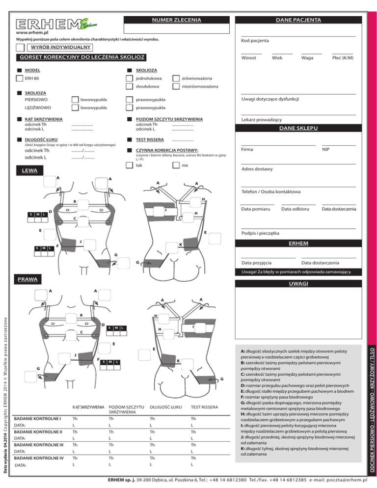 NUMER ZLECENIA DANE PACJENTA www.erhem.pl Wypełnij poniższe pola celem określenia charakterystyki i właściwości wyrobu. Kod pacjenta WYRÓB INDYWIDUALNY GORSET KOREKCYJNY DO LECZENIA SKOLIOZ Wzrost MODEL SKOLIOZA ERH 80 jednołukowa zrównoważona dwułukowa niezrównoważona Wiek Waga Płeć (K/M) SKOLIOZA PIERSIOWO lewowypukła prawowypukła LĘDŹWIOWO lewowypukła prawowypukła KĄT SKRZYWIENIA odcinek Th odcinek L Uwagi dotyczące dysfunkcji POZIOM SZCZYTU SKRZYWIENIA odcinek Th ...................... odcinek L ...................... ...................... ...................... DŁUGOŚĆ ŁUKU TEST RISSERA Lekarz prowadzący DANE SKLEPU ...................... (ilość kręgów licząc w górę i w dół od kręgu szczytowego) odcinek Th odcinek L Firma .........../........... CZYNNA KOREKCJA POSTAWY: .........../........... (czynne i bierne skłony boczne, wznos KG bokiem w górę L i P) tak LEWA A nie A NIP Adres dostawy A A Telefon / Osoba kontaktowa H B S M L I D Data pomiaru H E M Data dostarczenia C E S Data odbioru L J F Podpis i pieczątka ERHEM K G G Data przyjęcia Data dostarczenia Uwaga! Za błędy w pomiarach odpowiada zamawiający. PRAWA UWAGI A A A A H D S S M L I H C E E J F S M K L G G KĄT SKRZYWIENIA POZIOM SZCZYTU SKRZYWIENIA DŁUGOŚĆ ŁUKU TEST RISSERA BADANIE KONTROLNE I Th Th Th Th DATA: L L L L BADANIE KONTROLNE II Th Th Th Th DATA: L L L L BADANIE KONTROLNE III Th Th Th Th DATA: L L L L BADANIE KONTROLNE IV Th Th Th Th DATA: L L L L A: długość elastycznych szelek między otworem peloty piersiowej a rozdzielaczem części grzbietowej B: szerokość taśmy pomiędzy pelotami piersiowymi pomiędzy otworami C: szerokość taśmy pomiędzy pelotami piersiowymi pomiędzy otworami D: rozmiar przegubu pachowego oraz pelot piersiowych E: długość stalki między przegubem pachowym a biodrem F: rozmiar sprężyny pasa biodrowego G: długość paska dopinającego, mierzona pomiędzy metalowymi ramionami sprężyny pasa biodrowego H: długość taśm uprzęży piersiowej mierzone pomiędzy rozdzielaczem grzbietowym a przegubem pachowym I: długość piersiowej peloty korygującej mierzona między rozdzielaczem grzbietowym a pelotą piersiową J: długość przedniej, skośnej sprężyny biodrowej mierzonej od załamania K: długość tylnej, skośnej sprężyny biodrowej mierzonej od załamania ERHEM sp. j. 39-200 Dębica, ul. Puszkina 6, Tel.: +48 14 6812380 Tel./Fax. +48 14 6812385 e-mail: [email protected] ODCINEK PIERSIOWO - LĘDŹWIOWO - KRZYŻOWY / TLSO Data wydania 04.2014 C o p y r i g h t s E R H E M 2 0 1 4 © Ws z e l k i e p r a w a z a s t r z e ż o n e B