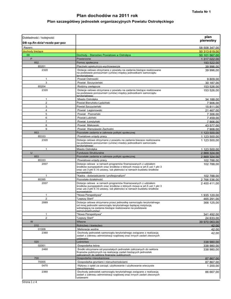 Dochody tabela Nr 1 - Starostwo Powiatowe w Ostrołęce