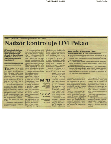 GAZETA PRAWNA 2008-04-24 BIZNES | GIEŁDA | Konsekwencje fuzji Banku BPH i Pekao Nadzór kontroluje DM Pekao KNF skontrolowała DM Pekao, by sprawdzić, czy w wyniku przejęcia klientów BM BPH nie doszło do nieprawidłowości. Na DM Pekao skarży się też Stowarzyszenie Inwestorów Indywidualnych. GP już na początku grudnia odszkodowania dla klientów, informowała o skargach, jakie którzy ponieśli straty, bo nie do Stowarzyszenia Inwesto mieli dostępu do posiada rów Indywidualnych(SII) nych akcji i nie mogli zawie i KNF kierowali klienci DM Pe rać transakcji. Z konsultacji kao. Inwestorzy narzekali z prawnikami wynika, że przede wszystkim na kilku w wielu przypadkach trudne dniowe problemy z zalogowa może być udowodnienie wy niem się w systemie domu ma sokości straty z powodu nie MAŁGORZATA KWIATKOWSKA klerskiego, zbyt późną infor zrealizowanego zamiaru [email protected] mację lub jej brak, o przenie sprzedaży lub kupna akcji. M Pekao w grudniu sieniu rachunku do DM Pekao Teraz SII zapowiada, że je 2007 r. przejął od BM i utratę historii transakcji. śli w ciągu najbliższych dni BPH ponad 160 tys. rachun - Stowarzyszenie próbowa Pekao nie zwróci się do orgaków klientów indywidual ło polubownie zała- _ _ _ _ , ^ _ ^ _ nizacji z propozycją nych. W ostatnim miesiącu twić sprawę poszko polubownego zała ubiegłego roku do Komisji dowanych, byłych twienia sprawy Nadzoru Finansowego (KNF) klientów BM BPH, poszkodowanych trafiło osiem skarg na DM Pe p r z e n i e s i o n y c h klientów, wykorzy kao, a w 2008 roku, do 22 w wyniku fuzji ban sta działania Urzędu kwietnia, było ich 18. ków do DM Pekao. rachunków Ochrony Konkuren cji i Konsumen - Wszystkie mają związek Niestety rozmowy osób fizycznych tów (UOKiK), który z fuzją BPH i Pekao. W związ z bankiem Pekao przejął DM Pekao sprawdza, czy ku z napływającymi informa i domem makler od BM BPH cjami o problemach klientów skim nie przyniosły w związku z przeję KNF zdecydowała się na rezultatów - mówi ciem części BPH przeprowadzenie kontroli GP Robert Nogacki, przez Pekao naru w DM Pekao. Czynności kon prawnik reprezentu szone zostały prawa trolne się zakończyły, czeka jący SII. rachunków konsumentów. my na protokół z kontroli Stowarzyszenie -Ponieważ UOKiK mówi GP Katarzyna Biela nie zdecydowało się byto w DM Pekao na prowadzi obecnie koniec marca z KNF. jednak na złożenie postępowanie wyja Komisja nie udziela na razie pozwu przeciw Pe śniające, SII zamie "Źródło: KDWP innych informacji o przepro kao, w którym do rza przekazać do wadzonej kontroli. magałoby się np. Urzędu informacje D 161 713 156 756* NA C0 SKARŻYLI SIĘ KLIENCI DM PEKAO Z listów nadesłanych do SII w grudniu i styczniu • Mimo terminowo złożonego wniosku nie przeniesiono mi ra chunku do nowego BPH. Pomimo upływu sześciu tygodni nie wydano mi też zaświadczenia o liczbie posiadanych akcji i nikt się tym nie przejmuje. «... o konieczności wyboru biura maklerskiego (w moim przy padku także banku) zostałem poinformowany 1 dzień przed ostatecznym terminem. • Przelew zlecony w środę po południu (05.12) do mBanku. Kwo ta raczej nieśmieszna, bo 450 tysięcy złotych. Przelew po sześciu dniach ciągle nie doszedł. Problem zgłaszałem w piątek rano (Będę dochodził odszkodowania. Za te środki chciałem kupić ak cje Nepentesa, co sygnalizowałem). wskazujące na możliwość na ruszenia zbiorowych intere sów konsumentów. Będzie to m.in. dokumentacja konkret nych przypadków, w których naruszone zostały interesy klientów - dodaje Robert No gacki. Jeśli po rozpoznaniu spra wy UOKiK zdecyduje o rozpo częciu właściwego postępo wania, SII będzie ubiegać się o status strony w tym postępo waniu jako organizacja spo łeczna, do której celów statu towych należy ochrona intere sów inwestorów indywidual nych. Wystąpienie do UOKiK to zresztą nie jedyna droga, jaką rozważa SII. W grę wchodzi również m.in. wszczęcie po stępowania przed Sądem Po lubownym przy KNF bądź po stępowanie w ramach Banko wego Arbitrażu Konsumenc kiego przy Związku Banków Polskich. Pekao nie komentuje na ra zie zarzutów SII. - Planujemy spotkanie ze Stowarzyszeniem najpraw dopodobniej w przyszłym ty godniu - mówi Arkadiusz Mierzwa, rzecznik prasowy banku. •