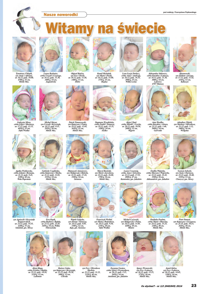 pod redakcją Przemysława Piątkowskiego Nasze noworodki Witamy na świecie Tymoteusz Chłopik, syn Anety i Adriana, ur. 16.12, godz. 10.00, 4700 g, 55 cm, Mińsk Maz. Laura Rosłoniec, córka Urszuli i Cezarego, ur. 16.12, godz. 11.30, 3400 g, 54 cm, Augustówka Olgierd Radzio, syn Ewy i Pawła, ur. 16.12, godz. 11.48, 1400 g, 53 cm, Dobre Kamil Michalak, syn Marty i Pawła, ur. 16.12, godz. 15.00, 3750 g, 55 cm, Rządza Lena Łucja Derkacz, córka Anny i Andrzeja, ur. 16.12, godz. 16.35, 3900 g, 55 cm, Wólka Leśna Aleksandra Sitkiewicz, córka Karoliny i Łukasza, ur. 16.12, godz. 21.30, 3000 g, 54 cm, Latowicz 4707 Mateusz Abramowski, syn Elżbiety i Jerzego, ur. 17.12, godz. 11.42, 3350 g, 53 cm, Kałuszyn Gabrysia Miros, córka Edyty i Mariusza, ur. 17.12, godz. 12.15, 4050 g, 55 cm, Dębe Wielkie Michał Mazur, syn Urszuli i Krzysztofa, ur. 18.12, godz. 0.15, 2950 g, 50 cm, Mińsk Maz. Patryk Tomaszewski, syn Katarzyny i Piotra, ur. 19.12, godz. 12.05, 3650 g, 55 cm, Mińsk Maz. Dagmara Wysokińska, córka Emilii i Tomasza, ur. 19.12, godz. 13.35, 3200 g, 54 cm, Siedlce Alicja Ufnal, córka Moniki i Leszka, ur. 20.12, godz. 10.50, 2600 g, 51 cm, Węgrów Ania Wasilka, córka Karoliny i Artura, ur. 21.12, godz. 1.40, 3600 g, 54 cm, Garwolin Arkadiusz Wójcik, syn Marleny i Mirosława, ur. 21.12, godz. 2.12, 3400 g, 56 cm, Wielgolas Agatka Pieńkowska, córka Jolanty i Romana, ur. 21.12, godz. 9.45, 2200 g, 48 cm, Wola Paprotnia Gabriela Czaplińska, córka Katarzyny i Marka, ur. 21.12, godz. 12.05, 3350 g, 54 cm, Mińsk Maz. Mateuszek Antosiewicz, syn Małgorzaty i Roberta, ur. 21.12, godz. 17.10, 3500 g, 54 cm, Siennica Marcel Rosiński, syn Marii i Jarosława, ur. 22.12, godz. 16.00, 3700 g, 56 cm, Mińsk Maz. Laura Czwarnóg, córka Anny i Sylwestra, ur. 22.12, godz. 17.55, 2000 g, 47 cm, Kamionka, gm. Jakubów Emilka Wójcicka, córka Marzeny i Wojciecha, ur. 22.12, godz. 22.45, 3500 g, 56 cm, Aleksandrów, gm. Jakubów Szymon Sobecki, syn Anety i Dariusza, ur. 23.12, godz. 10.40, 3250 g, 53 cm, Choszcze, gm. Mrozy syn Agnieszki i Krzysztofa Trojanowskich, ur. 23.12, godz. 14.35, 4200 g, 55 cm, Sokolnik, gm. Mrozy Ewa Kopik, córka Barbary i Rafała, ur. 23.12, godz. 21.45, 3450 g, 54 cm, Wólka Ostrożeńska Wojtek Gałązka, syn Doroty i Tomasza, ur. 24.12, godz. 6.05, 3300 g, 52 cm, Kąty, gm. Siennica Franciszek Wróbel, syn Marty i Radosława, ur. 24.12, godz. 9.50, 2350 g, 50 cm, Dębe Wielkie Michał Czyżewski, syn Małgorzaty i Piotra, ur. 24.12, godz. 11.05, 4200 g, 58 cm, Mistów Paulinka Prędota, córka Marty i Marcina, ur. 24.12, godz. 15.25, 2300 g, 49 cm, Mińsk Maz. Piotr Domoń, syn Katarzyny i Grzegorza, ur. 25.15, godz. 10.15, 2650 g, 50 cm, Mińsk Maz. Alicja Klaga, córka Eweliny i Rafała, ur. 25.12, godz. 14.10, 3250 g, 52 cm, Lubomin Bartosz Galas, syn Katarzyny i Krzysztofa, ur. 25.12, godz. 18.30, 3000 g, 53 cm, Chrośla syn Ewy i Mirosława Mućków, ur. 25.12, godz. 21.25, 2350 g, 48 cm, Mińsk Maz. Zuzanna Gustaw, córka Sylwii i Przemysława, ur. 26.12, godz. 1.15, 3650 g, 54 cm, Anielinek, gm. Jakubów Ignacy Wronowski, syn Ewy i Łukasza, ur. 26.12, godz. 13.15, 3750 g, 56 cm, Mińsk Maz. Janek Kobza, syn Ewy i Łukasza, ur. 26.12, godz. 14.45, 3300 g, 54 cm, Mińsk Maz. Co słychać? - nr 1/2 (848/849) 2014 23