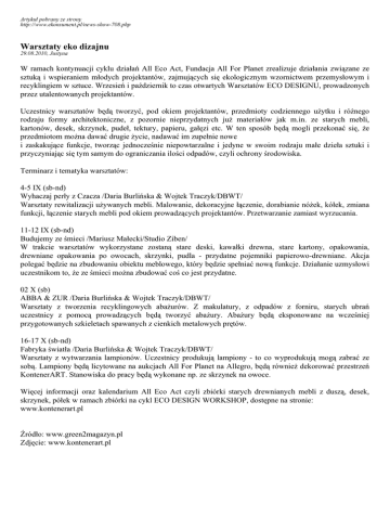 Artykuł pobrany ze strony http://www.ekonsument.pl/news-show-708.php Warsztaty eko dizajnu 29.08.2010, Justyna W ramach kontynuacji cyklu działań All Eco Act, Fundacja All For Planet zrealizuje działania związane ze sztuką i wspieraniem młodych projektantów, zajmujących się ekologicznym wzornictwem przemysłowym i recyklingiem w sztuce. Wrzesień i październik to czas otwartych Warsztatów ECO DESIGNU, prowadzonych przez utalentowanych projektantów. Uczestnicy warsztatów będą tworzyć, pod okiem projektantów, przedmioty codziennego użytku i różnego rodzaju formy architektoniczne, z pozornie nieprzydatnych już materiałów jak m.in. ze starych mebli, kartonów, desek, skrzynek, pudeł, tektury, papieru, gałęzi etc. W ten sposób będą mogli przekonać się, że przedmiotom można dawać drugie życie, nadawać im zupełnie nowe i zaskakujące funkcje, tworząc jednocześnie niepowtarzalne i jedyne w swoim rodzaju małe dzieła sztuki i przyczyniając się tym samym do ograniczania ilości odpadów, czyli ochrony środowiska. Terminarz i tematyka warsztatów: 4-5 IX (sb-nd) Wyhaczaj perły z Czacza /Daria Burlińska & Wojtek Traczyk/DBWT/ Warsztaty rewitalizacji używanych mebli. Malowanie, dekoracyjne łączenie, dorabianie nóżek, kółek, zmiana funkcji, łączenie starych mebli pod okiem prowadzących projektantów. Przetwarzanie zamiast wyrzucania. 11-12 IX (sb-nd) Budujemy ze śmieci /Mariusz Małecki/Studio Ziben/ W trakcie warsztatów wykorzystane zostaną stare deski, kawałki drewna, stare kartony, opakowania, drewniane opakowania po owocach, skrzynki, pudla - przydatne pojemniki papierowo-drewniane. Akcja polegać będzie na zbudowaniu obiektu meblowego, który będzie spełniać nową funkcje. Działanie uzmysłowi uczestnikom to, że ze śmieci można zbudować coś co jest przydatne. 02 X (sb) ABBA & ZUR /Daria Burlińska & Wojtek Traczyk/DBWT/ Warsztaty z tworzenia recyklingowych abażurów. Z makulatury, z odpadów z forniru, starych ubrań uczestnicy z pomocą prowadzących będą tworzyć abażury. Abażury będą eksponowane na wcześniej przygotowanych szkieletach spawanych z cienkich metalowych prętów. 16-17 X (sb-nd) Fabryka światła /Daria Burlińska & Wojtek Traczyk/DBWT/ Warsztaty z wytwarzania lampionów. Uczestnicy produkują lampiony - to co wyprodukują mogą zabrać ze sobą. Lampiony będą licytowane na aukcjach All For Planet na Allegro, będą również dekorować przestrzeń KontenerART. Stanowiska do pracy będą wykonane np. ze skrzynek na owoce. Więcej informacji oraz kalendarium All Eco Act czyli zbiórki starych drewnianych mebli z duszą, desek, skrzynek, półek w ramach zbiórki na cykl ECO DESIGN WORKSHOP, dostępne na stronie: www.kontenerart.pl Źródło: www.green2magazyn.pl Zdjęcie: www.kontenerart.pl