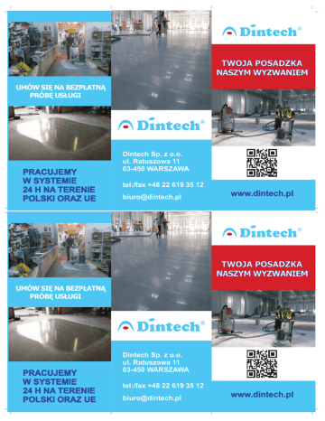 R TWOJA POSADZKA NASZYM WYZWANIEM UMÓW SIĘ NA BEZPŁATNĄ PRÓBĘ USŁUGI R PRACUJEMY W SYSTEMIE 24 H NA TERENIE POLSKI ORAZ UE Dintech Sp. z o.o. ul. Ratuszowa 11 03-450 WARSZAWA tel:/fax +48 22 619 35 12 www.dintech.pl [email protected] R TWOJA POSADZKA NASZYM WYZWANIEM UMÓW SIĘ NA BEZPŁATNĄ PRÓBĘ USŁUGI R PRACUJEMY W SYSTEMIE 24 H NA TERENIE POLSKI ORAZ UE Dintech Sp. z o.o. ul. Ratuszowa 11 03-450 WARSZAWA tel:/fax +48 22 619 35 12 [email protected] www.dintech.pl C H E M I C Z N E U T WA R D Z ACZE DO BETONU NA BAZ I E K R Z E M I A N Ó W L I T U JKC-DENSEALTM UTWARDZACZ, USZCZELNIACZ I ZAGĘSZCZACZ POWIERZCHNI BETONOWYCH Jest płynnym utwardzaczem na bazie krzemianów litu, do obróbki powierzchni betonowych i kamiennych, który przenika i uszczelnia poprzez reakcje chemiczne zachodzące w betonie. Tworzy czystą, zagęszczoną, trwałą i twardą nieograniczoną powierzchnię, która jest oddychająca, paroprzepuszczalna, odporna na ścieranie i ekstremalnie twarda. Jest najlepszym rozwiązaniem dla powierzchni wymagających długotrwałego zabezpieczenia i ochrony przed bardzo intensywnym użytkownikiem, zanieczyszczeniami, brudem i wilgocią oraz stanowi ochronę przed alkalicznymi wykwitami. TM JKC-PROTEX MIKRO POWŁOKA OCHRONNA ORAZ UTWARDZACZ POSADZEK BETONOWYCH Jest płynnym utwardzaczem na bazie krzemianów litu, krystalizujacym się w strukturze betonu i tworzącym mikropowłokę hydrofobową o dużej odporności chemicznej i mechanicznej. Stosowany jest do renowacji starych i uszlachetniania nowych posadzek betonowych, w tym utwardzanych powierzchniowo i polarowanego betonu. Utwardza i uszczelnia posadzkę betonową tworząc bardzo twardą, trwałą,niepylącą, chemicznie i mechanicznie szczelną powierzchnię. 10 8 6 4 Olej hydrauliczny Olej Przekładniowy Odporność na plamy Czerwone Wino Ocet Balsamiczny 2 0 Odporność na ścieranie 0,5 100 80 60 40 20 0 Beton niezabezpieczony Aplikacja na bazie sodu Aplikacja JKC-DENSEAL Redukcja absorbcji wody 100 80 1,0 1,5 JKC-DENSALT UTWARDZACZ, USZCZELNIACZ, ZAGĘSZCZACZ OCHRONA PRZED SOLĄ POWIERZCHNI BETONOWYCH Utwardza, uszczelnia i zagęszcza powierzchnie betonowe i kamienne, tworząc zabezpieczenie przed solą i redukując absorpcję wody nawet przy regularnej konserwacji, myciu ciśnieniowym i dużym ruchu. Powoduje pełne zabezpieczenie przed głęboką penetracją wody i związaną z tym hydratyzacją betonu, z zachowaniem zalet utwardzania, uszczelniania i zagęszczania betonu. Powierzchnia staje się odporna na plamy, zwietrzenie, wykwity, pocenie, wypłukiwanie, erozję, grzyby i pleśnie, niszczenie, nagłe zmiany temperatury, przemierzanie oraz zmniejsza zagrożenie korozji stali. TM Twardość / Wytrzymałość na ścieranie w skali Mohs’a 24,0 Beton zatarty na gładko, zaimpregnowany JKC-PROTEX był poddany testom odpornościowym na plamy różnych substancji. Związki te były sprawdzane w reularnych odstępach czasowych w czasie 24 godzin w celu sprecyzowania głębokości penetracji po wyczyszczeniu nie ścierającym środkiem czyszczącym o neutralnym pH Po wyczyszczeniu plama została oceniona zgodnie z następującą skalą, gdzie (0) - wskazuje brak zmiany w wyglądzie plamy, a (10) - oznacza, że plama została całkowicie usunięta. 8 6 4 2 0 Beton niezabezpieczony Aplikacja JKC-DENSALT Redukcja absorbcji chlorków 100 80 60 40 20 0 Beton niezabezpieczony Aplikacja na bazie sodu Aplikacja JKC-DENSEAL 60 (0)-plama się nie zmienia, pozostaje bardzo widoczna (5)-plama mniej nasycona, ale wciąż bardzo widoczna (10)-plama całkowicie usunięta, brak widocznych śladów 40 20 0 Beton niezabezpieczony Aplikacja JKC-DENSALT C H E M I C Z N E U T WA R D Z ACZE DO BETONU NA BAZ I E K R Z E M I A N Ó W L I T U JKC-DENSEALTM UTWARDZACZ, USZCZELNIACZ I ZAGĘSZCZACZ POWIERZCHNI BETONOWYCH Jest płynnym utwardzaczem na bazie krzemianów litu, do obróbki powierzchni betonowych i kamiennych, który przenika i uszczelnia poprzez reakcje chemiczne zachodzące w betonie. Tworzy czystą, zagęszczoną, trwałą i twardą nieograniczoną powierzchnię, która jest oddychająca, paroprzepuszczalna, odporna na ścieranie i ekstremalnie twarda. Jest najlepszym rozwiązaniem dla powierzchni wymagających długotrwałego zabezpieczenia i ochrony przed bardzo intensywnym użytkownikiem, zanieczyszczeniami, brudem i wilgocią oraz stanowi ochronę przed alkalicznymi wykwitami. TM JKC-PROTEX MIKRO POWŁOKA OCHRONNA ORAZ UTWARDZACZ POSADZEK BETONOWYCH Jest płynnym utwardzaczem na bazie krzemianów litu, krystalizujacym się w strukturze betonu i tworzącym mikropowłokę hydrofobową o dużej odporności chemicznej i mechanicznej. Stosowany jest do renowacji starych i uszlachetniania nowych posadzek betonowych, w tym utwardzanych powierzchniowo i polarowanego betonu. Utwardza i uszczelnia posadzkę betonową tworząc bardzo twardą, trwałą,niepylącą, chemicznie i mechanicznie szczelną powierzchnię. 10 8 6 4 Olej hydrauliczny Olej Przekładniowy Odporność na plamy Czerwone Wino Ocet Balsamiczny 2 0 Odporność na ścieranie 0,5 100 80 60 40 20 0 Beton niezabezpieczony Aplikacja na bazie sodu Aplikacja JKC-DENSEAL Redukcja absorbcji wody 100 80 1,0 1,5 JKC-DENSALT UTWARDZACZ, USZCZELNIACZ, ZAGĘSZCZACZ OCHRONA PRZED SOLĄ POWIERZCHNI BETONOWYCH Utwardza, uszczelnia i zagęszcza powierzchnie betonowe i kamienne, tworząc zabezpieczenie przed solą i redukując absorpcję wody nawet przy regularnej konserwacji, myciu ciśnieniowym i dużym ruchu. Powoduje pełne zabezpieczenie przed głęboką penetracją wody i związaną z tym hydratyzacją betonu, z zachowaniem zalet utwardzania, uszczelniania i zagęszczania betonu. Powierzchnia staje się odporna na plamy, zwietrzenie, wykwity, pocenie, wypłukiwanie, erozję, grzyby i pleśnie, niszczenie, nagłe zmiany temperatury, przemierzanie oraz zmniejsza zagrożenie korozji stali. TM Twardość / Wytrzymałość na ścieranie w skali Mohs’a 24,0 Beton zatarty na g
