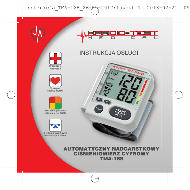 instrukcja_TMA-168_26-09-2012:Layout 1 2013-02-21 INSTRUKCJA OSŁUGI Urządzenie medyczne (( )) Wykrywa objawy arytmii Wskaźnik poziomu ciśnienia wg. WHO 3 Średnia z wyników 3 ostatnich pomiarów AUTOMATYCZNY NADGARSTKOWY CIŚNIENIOMIERZ CYFROWY TMA-168 09 instrukcja_TMA-168_26-09-2012:Layout 1 2013-02-21 09 instrukcja_TMA-168_26-09-2012:Layout 1 2013-02-21 SPIS TREŚCI 1. 2. 3. 4. 5. 6. 7. 8. 9. 10. 11. 12. 13. 14. 15. 16. Wprowadzenie . . . . . . . . . . . . . . . . . . . . . . . . . . . . . . . . . . .2 Najważniejsze cechy aparatu . . . . . . . . . . . . . . . . . . . . . . . .4 Co należy wiedzieć o ciśnieniu krwi . . . . . . . . . . . . . . . . . . .5 Ważne wskazówki . . . . . . . . . . . . . . . . . . . . . . . . . . . . . . .11 Budowa i działanie urządzenia . . . . . . . . . . . . . . . . . . . . . .15 Zakładanie mankietu . . . . . . . . . . . . . . . . . . . . . . . . . . . . .16 Funkcja rozpoznawania arytmii serca . . . . . . . . . . . . . . . . .18 Wskaźnik klasyfikacji wyniku pomiaru ciśnienia wg Światowej Organizacji Zdrowia . . . . . . . . . . . . . . . . . . .20 Wymiana baterii . . . . . . . . . . . . . . . . . . . . . . . . . . . . . . . . .23 Ustawienia daty i godziny . . . . . . . . . . . . . . . . . . . . . . . . . .25 Dokonywanie pomiaru . . . . . . . . . . . . . . . . . . . . . . . . . . . .26 Korzystanie z pamięci urządzenia . . . . . . . . . . . . . . . . . . . .28 Kasowanie danych . . . . . . . . . . . . . . . . . . . . . . . . . . . . . . .30 Konserwacja i przechowywanie . . . . . . . . . . . . . . . . . . . . .31 Wskazania symboli/rozwiązywanie problemów . . . . . . . . . .34 Dane techniczne . . . . . . . . . . . . . . . . . . . . . . . . . . . . . . . . .37 1 09 instrukcja_TMA-168_26-09-2012:Layout 1 2013-02-21 Dziękujemy za zakup Automatycznego Cyfrowego Aparatu do Pomiaru Ciśnienia Krwi i Tętna KARDIO-TEST TMA-168 na nadgarstek. Jesteśmy z Państwem od ponad 60-ciu lat - nasze doświadczenie wykorzystujemy do ciągłego doskonalenia produktów, które uwzględniają wszystkie najnowsze technologie w diagnostyce i są nieustannie poddawane kontroli jakości. Państwa wybór jest najlepszy z możliwych. Życzymy Państwu dużo zdrowia. Jesteśmy zawsze do Państwa dyspozycji. 1. WPROWADZENIE Aparat TMA-168 jest urządzeniem nowoczesnym o zaawansowanej technologii i niezwykłych walorach użytkowych. Naciśnięcie przycisku po założeniu mankietu i ułożeniu ręki w odpowiedniej pozycji powoduje, że aparat mierzy ciśnienie krwi oraz tętno i wyświetla wyniki na 2 09 instrukcja_TMA-168_26-09-2012:Layout 1 2013-02-21 wyświetlaczu cyfrowym. TMA-168 wykrywa również objawy arytmii. Po kilkakrotnym powtórzeniu się tego objawu i wyświetleniu na panelu LCD znaku „ ” należy zgłosić się do lekarza. Nie należy samodzielnie interpretować wyników pomiaru ciśnienia krwi, w tym objawów arytmii. Wyniki te powinny być interpretowane przez lekarza lub wykwalifikowanego pracownika medycznego znającego historię choroby pacjenta. Regularne wykonywanie pomiarów i rejestrowanie wyników pozwala lekarzowi ocenić tendencje zmian ciśnienia krwi pacjenta w dłuższym przedziale czasu. Dokładność pomiarów aparatu TMA-168 jest testowana w procesie produkcji. Testy potwierdziły jego zgodność z wysoką normą amerykańską AAMI/ANSI-SP10 oraz normą europejską PN-EN 1060-3 oraz dyrektywą UE 93/42/EEC. 3 09 instrukcja_TMA-168_26-09-2012:Layout 1 2013-02-21 2. NAJWAŻNIEJSZE CECHY APARATU • • • • • • • • • Szybki pomiar ciśnienia krwi i tętna Wykrywanie ewentualnych objawów arytmii Klasyfikacja wizualna ciśnienia krwi w/g WHO Światowej Organizacji Zdrowia 3 odrębne kanały pamięci dla 3-ch osób Rejestruje w pamięci 3x40 wyników wraz z godziną i datą pomiaru Funkcja obliczania średniej z ostatnich trzech pomiarów Gwarantowana dokładność dzięki zaawansowanej technologii Prosty pomiar jednym naciśnięciem przycisku Automatyczne wyłączanie zasilania (oszczędzanie baterii) 4 09 instrukcja_TMA-168_26-09-2012:Layout 1 2013-02-21 3. CO NALEŻY WIEDZIEĆ O CIŚNIENIU KRWI Czym jest ciśnienie krwi? Ciśnienie krwi to siła, z jaką przepływająca krew oddziaływuje na ścianki tętnic. Ciśnienie krwi zmienia się w trakcie cyklu pracy serca. Najwyższe ciśnienie w cyklu nosi nazwę SKURCZOWEGO CIŚNIENIA KRWI (SYSTOLICZNE). Najniższe nosi nazwę ROZKURCZOWEGO CIŚNIENIA KRWI (DIASTOLICZNE). Pomiar obydwu tych wielkości jest niezbędny, aby lekarz mógł ocenić stan ciśnienia krwi pacjenta. Na ciśnienie krwi wpływa wiele czynników, takich jak aktywność fizyczna, niepokój czy pora dnia. Zmienia się ono nieustannie w ciągu doby. Szybko wzrasta wczesnym rankiem i maleje przed południem, następnie znowu wzrasta po południu i wreszcie spada do niskiego poziomu w nocy. Może się także zmieniać w krótkich odstępach czasu. W związku z tym wyniki kolejnych pomiarów mogą być 5 09 instrukcja_TMA-168_26-09-2012:Layout 1 2013-02-21 różne. Poniższy wykres ilustruje zmiany ciśnienia w ciągu doby przy pomiarach dokonywanych co 5 minut. Gruba kreska przedstawia sen. Skoki ciśnienia o godzinie 16 (A) i 24 (B) odpowiadają atakowi bólu i aktywności seksualnej. Dlaczego ważne jest mierzenie ciśnienia krwi w domu? Pomiar ciśnienia krwi w gabinecie lekarskim daje tylko wartość chwilową. Regularnie powtarzane pomiary w domu pozwalają określić rzeczywiste ciśnienie krwi w warunkach, w których pacjent przebywa na co dzień. 6 09 instrukcja_TMA-168_26-09-2012:Layout 1 2013-02-21 Ponadto pacjenci często mają inne ciśnienie mierzone w domu, ponieważ są bardziej rozluźnieni niż w gabinecie lekarskim (syndrom białego fartucha). Regularne pomiary wykonywane w domu dają lekarzowi cenne informacje o ciśnieniu pacjenta w normalnych warunkach. Czym jest arytmia? Serce działa jak pompa, która tłoczy krew przez swoje komory. Krew jest tłoczona dzięki skurczom mięśni następujący