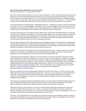 Dear Friends and Beer Aficionados all over the world! (auf Deutsch siehe unten – po polsku patrz ponizej) More than six weeks have passed since I sent out my last newsletter. I have not been idling around, though; but spent a lot of time on beer related activities that let me criss-cross all over Germany and Poland. It all started with the Braukunst Live 2014 in Munich – since it has been the third edition already and is steadily growing, we truly can call it a success story. Thousands of visitors, hundreds of beers, dozens of brewers – it was well worth to drive several hundred kilometres to Munich just to stand in the queue for more than an hour to get in… Just a few days later, two homebrewers’ meetings kept me busy – a smaller one in Berlin, where we focused on a nice pub crawl, and a somewhat bigger in Bennigsen, which is a small village not too far away from Hannover. In Bennigsen, we spent a great Sunday noon in the Bennexer Brauhaus. It might have been a challenge to start a Sunday with a 9% Triple Bock for late breakfast, but it definitely was worth the effort. th No time to relax, because on Thursday 6 March, Markus Fohr, owner of the Lahnsteiner Brewery, introduced us to the art of storing beer. Strong beers, in particular strongly hopped ones, can easily be stored several years and will develop intense and interesting flavours and aromas, as long as you can clearly control the storage conditions. During the Lahnsteiner Bierseminar, we visited Fohr’s beer cellar and made a parallel tasting of some young and old beers of the same kind. Surprisingly interesting! My next major activity was the III edition of the Szczecin Homebrew Contest. For the first time, the degustation and evaluation took place in the cellars of Szczecin’s brewpub Stara Komenda – a perfect venue to hold a beer tasting and homebrew contest. Crazy enough, and definitely worth mentioning that young brewster Agnieszka rd Lipińska scored high (3 place) with here very first batch of beer at all. In parallel to this contest, the XIV edition of the International Breweriana Fair “Pivaria” took place in Szczecin’s cultural centre “Słowianin“, providing an excellent opportunity to our judges to prepare for the contest by walking the stalls and exploring the sometimes fancy breweriana offered for sale. I hope that this list of activities is sufficient to excuse my delay in writing this newsletter. Many other things kept me busy (there is after all, a profession in my real life – beer is just my hobby, even though it is occupying more and more of my leisure time), and a huge number of smaller beer related things that are not explicitly mentioned have filled up my calendar as well. In particular, the preparations for this year’s City-Tour de Beer to Cologne have been time consuming; the programme however, seems to be worth the effort. For four days rd (starting 3 April) we will explore Cologne’s beers, bars, and breweries, and I am looking forward to meeting old and new friends during this event. Please have a quick glance on the programme: http://brunnenbraeu.eu/?page_id=654. th What can we expect from the upcoming weeks? Apart from the City-Tour de Beer, 10 April will see the next th edition (the 30 already!) of the Lahnsteiner Bierseminar. And as every year: Spring starts with literally dozens of festivals, contests, and other beer related events. Be it in Germany and Poland, where the craft beer revolution is developing faster and faster, be it in the Netherlands or Belgium, where beer festivals have a somewhat longer tradition. Fixed entries in my calendar will be the Zythos Beer Festival in Leuven in April, the Birofilia Festival in Żywiec in June, the International Homebrew Contest in Chorzów (in June as well) and the homebrewers’ meeting in Berlin Schmöckwitz in August. More appointments are to follow. Stay tuned for the reports… Talking about reports, one more issue in case you are missing some specific beer related issues, where you know for sure that I have been present: Yes, I know, I am a bit late with writing all my reports. Drafts and pictures are piling up on my desk and in my computer, but time is always too scarce. My apologies for that, and I promise to provide all the missing information sometime in the future… As always, I have collected links to new articles about breweries, beer bars, beer tastings, and beer festivals at the end of this newsletter (see list 1) and collected references to older articles and sub-pages which have been transferred recently from my old website to the new one (see list 2). I hope you will enjoy reading my short stories and reports, and I would gladly appreciate your comments and discussions on my homepage. For older issues of this newsletter, please see the archive at http://brunnenbraeu.eu/?page_id=670. With best regards and see you soon on one of the upcoming festivals, Volker * You have gotten this newsletter based on your subscription on www.brunnenbraeu.eu. If you want to resign from this subscription, just send an eMail with the topic “unsubscribe” to [email protected]. ----Liebe Freunde und Bierliebhaber in aller Welt! Mehr als sechs Wochen sind vergangen, seit ich den letzten Newsletter verschickt habe. Ich war aber nicht untätig, sondern habe die Zeit mit bierigen Aktivitäten genutzt, die mich kreuz und quer durch ganz Deutschland und Polen geführt haben. Es hat begonnen mit der Braukunst Live 2014 in München – nachdem es sich dabei bereits um die dritte Auflage dieses Festivals gehandelt hat und es sich stetig weiterentwickelt, kann man es sicherlich schon als Erfolgsgeschichte bezeichnen. Tausende Besucher, hunderte Bier, dutzende Brauer – es war mit Sicherheit wert, mehrere hundert Kilometer bis nach München zu fahren, um dann zunächst für mehr als eine Stunde in der Schlange zu stehen, um hinein zu kommen… Nur ein paar Tage später hielten mich zwei Hausbrauertreffen auf Trab – ein etwas kleinere
